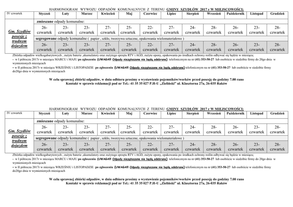 IV czwartek HARMONOGRAM WYWOZU ODPADÓW KOMUNALNYCH Z TERENU GMINY SZYDŁÓW 2017 r W MIEJSCOWOŚCI; Styczeń Luty Marzec Kwiecień Maj Czerwiec Lipiec Sierpień Wrzesień Październik Listopad Grudzień zmieszane odpady komunalne: Gm. Szydłów posesje z trudnym dojazdem 26czwartek 23czwartek 23czwartek 27czwartek 25czwartek 22czwartek 27czwartek 24czwartek 28czwartek 26czwartek 23czwartek 28czwartek 24czwartek 28czwartek 26czwartek 23czwartek 28czwartek segregowane odpady komunalne ( papier , szkło, tworzywa sztuczne, opakowania wielomateriałowe ) 26czwartek 23czwartek 23czwartek 27czwartek 25czwartek 22czwartek 27czwartek Zbiórka odpadów wielkogabarytowych , zużyte baterie ,akumulatory oraz zużytego sprzętu RTV i AGD, zużyte opony, opakowania po środkach ochrony roślin odbywać się będzie w miesiącu; - w I półroczu 2017r w miesiącu MARCU i MAJU po zgłoszeniu (UWAGA!!! Odpady niezgłoszone nie będą odebrane) telefonicznym na nr (41) 353-50-27 lub osobiście w siedzibie firmy do 20go dnia w wymienionych miesiącach - w II półroczu 2017r w miesiącu WRZEŚNIU i LISTOPADZIE po zgłoszeniu (UWAGA!!! Odpady niezgłoszone nie będą odebrane) telefonicznym na nr (41) 353-50-27 lub osobiście w siedzibie firmy do20go dnia w wymienionych miesiącach W celu sprawnej zbiórki odpadów, w dniu odbioru prosimy o wystawienie pojemników/worków przed posesję do godziny 7.00 rano Kontakt w sprawie reklamacji pod nr Tel.: 41 35 35 027 P.H-U „Zieliński” ul. Klasztorna 27a, 26-035 Raków IV czwartek HARMONOGRAM WYWOZU ODPADÓW KOMUNALNYCH Z TERENU GMINY SZYDŁÓW 2017 r W MIEJSCOWOŚCI; Styczeń Luty Marzec Kwiecień Maj Czerwiec Lipiec Sierpień Wrzesień Październik Listopad Grudzień zmieszane odpady komunalne: Gm. Szydłów posesje z trudnym dojazdem 26czwartek 23czwartek 23czwartek 27czwartek 25czwartek 22czwartek 27czwartek 24czwartek 28czwartek 26czwartek 23czwartek 28czwartek 24czwartek 28czwartek 26czwartek 23czwartek 28czwartek segregowane odpady komunalne ( papier , szkło, tworzywa sztuczne, opakowania wielomateriałowe ) 26czwartek 23czwartek 23czwartek 27czwartek 25czwartek 22czwartek 27czwartek Zbiórka odpadów wielkogabarytowych , zużyte baterie ,akumulatory oraz zużytego sprzętu RTV i AGD, zużyte opony, opakowania po środkach ochrony roślin odbywać się będzie w miesiącu; - w I półroczu 2017r w miesiącu MARCU i MAJU po zgłoszeniu (UWAGA!!! Odpady niezgłoszone nie będą odebrane) telefonicznym na nr (41) 353-50-27 lub osobiście w siedzibie firmy do 20go dnia w wymienionych miesiącach - w II półroczu 2017r w miesiącu WRZEŚNIU i LISTOPADZIE po zgłoszeniu (UWAGA!!! Odpady niezgłoszone nie będą odebrane) telefonicznym na nr (41) 353-50-27 lub osobiście w siedzibie firmy do20go dnia w wymienionych miesiącach W celu sprawnej zbiórki odpadów, w dniu odbioru prosimy o wystawienie pojemników/worków przed posesję do godziny 7.00 rano Kontakt w sprawie reklamacji pod nr Tel.: 41 35 35 027 P.H-U „Zieliński” ul. Klasztorna 27a, 26-035 Raków IV czwartek HARMONOGRAM WYWOZU ODPADÓW KOMUNALNYCH Z TERENU GMINY SZYDŁÓW 2017 r W MIEJSCOWOŚCI; Styczeń Luty Marzec Kwiecień Maj Czerwiec Lipiec Sierpień Wrzesień Październik Listopad Grudzień zmieszane odpady komunalne: Gm. Szydłów posesje z trudnym dojazdem 26czwartek 23czwartek 23czwartek 27czwartek 25czwartek 22czwartek 27czwartek 24czwartek 28czwartek 26czwartek 23czwartek 28czwartek 24czwartek 28czwartek 26czwartek 23czwartek 28czwartek segregowane odpady komunalne ( papier , szkło, tworzywa sztuczne, opakowania wielomateriałowe ) 26czwartek 23czwartek 23czwartek 27czwartek 25czwartek 22czwartek 27czwartek Zbiórka odpadów wielkogabarytowych , zużyte baterie ,akumulatory oraz zużytego sprzętu RTV i AGD, zużyte opony, opakowania po środkach ochrony roślin odbywać się będzie w miesiącu; - w I półroczu 2017r w miesiącu MARCU i MAJU po zgłoszeniu (UWAGA!!! Odpady niezgłoszone nie będą odebrane) telefonicznym na nr (41) 353-50-27 lub osobiście w siedzibie firmy do 20go dnia w wymienionych miesiącach - w II półroczu 2017r w miesiącu WRZEŚNIU i LISTOPADZIE po zgłoszeniu (UWAGA!!! Odpady niezgłoszone nie będą odebrane) telefonicznym na nr (41) 353-50-27 lub osobiście w siedzibie firmy do20go dnia w wymienionych miesiącach W celu sprawnej zbiórki odpadów, w dniu odbioru prosimy o wystawienie pojemników/worków przed posesję do godziny 7.00 rano Kontakt w sprawie reklamacji pod nr Tel.: 41 35 35 027 P.H-U „Zieliński” ul. Klasztorna 27a, 26-035 Raków IV czwartek HARMONOGRAM WYWOZU ODPADÓW KOMUNALNYCH Z TERENU GMINY SZYDŁÓW 2017 r W MIEJSCOWOŚCI; Styczeń Luty Marzec Kwiecień Maj Czerwiec Lipiec Sierpień Wrzesień Październik Listopad Grudzień zmieszane odpady komunalne: Gm. Szydłów posesje z trudnym dojazdem 26czwartek 23czwartek 23czwartek 27czwartek 25czwartek 22czwartek 27czwartek 24czwartek 28czwartek 26czwartek 23czwartek 28czwartek 24czwartek 28czwartek 26czwartek 23czwartek 28czwartek segregowane odpady komunalne ( papier , szkło, tworzywa sztuczne, opakowania wielomateriałowe ) 26czwartek 23czwartek 23czwartek 27czwartek 25czwartek 22czwartek 27czwartek Zbiórka odpadów wielkogabarytowych , zużyte baterie ,akumulatory oraz zużytego sprzętu RTV i AGD, zużyte opony, opakowania po środkach ochrony roślin odbywać się będzie w miesiącu; - w I półroczu 2017r w miesiącu MARCU i MAJU po zgłoszeniu (UWAGA!!! Odpady niezgłoszone nie będą odebrane) telefonicznym na nr (41) 353-50-27 lub osobiście w siedzibie firmy do 20go dnia w wymienionych miesiącach - w II półroczu 2017r w miesiącu WRZEŚNIU i LISTOPADZIE po zgłoszeniu (UWAGA!!! Odpady niezgłoszone nie będą odebrane) telefonicznym na nr (41) 353-50-27 lub osobiście w siedzibie firmy do20go dnia w wymienionych miesiącach W celu sprawnej zbiórki odpadów, w dniu odbioru prosimy o wystawienie pojemników/worków przed posesję do godziny 7.00 rano Kontakt w sp