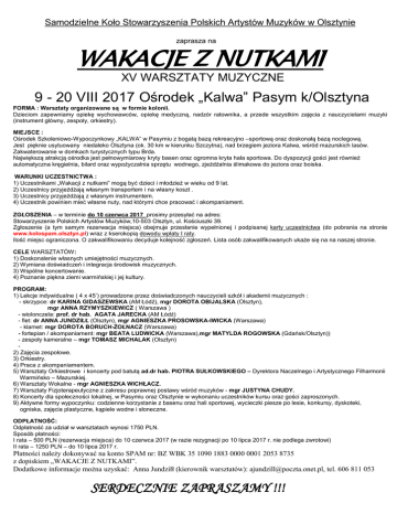 Samodzielne Koło Stowarzyszenia Polskich Artystów Muzyków w Olsztynie zaprasza na WAKACJE Z NUTKAMI XV WARSZTATY MUZYCZNE 9 - 20 VIII 2017 Ośrodek „Kalwa” Pasym k/Olsztyna FORMA : Warsztaty organizowane są w formie kolonii. Dzieciom zapewniamy opiekę wychowawców, opiekę medyczną, nadzór ratownika, a przede wszystkim zajęcia z nauczycielami muzyki (instrument główny, zespoły, orkiestry). MIEJSCE : Ośrodek Szkoleniowo-Wypoczynkowy „KALWA” w Pasymiu z bogatą bazą rekreacyjno –sportową oraz doskonałą bazą noclegową. Jest pięknie usytuowany niedaleko Olsztyna (ok. 30 km w kierunku Szczytna), nad brzegiem jeziora Kalwa, wśród mazurskich lasów. Zakwaterowanie w domkach turystycznych typu Brda. Największą atrakcją ośrodka jest pełnowymiarowy kryty basen oraz ogromna kryta hala sportowa. Do dyspozycji gości jest również automatyczna kręgielnia, bilard oraz wypożyczalnia sprzętu wodnego, zjeżdżalnia ślimakowa do jeziora oraz boiska. WARUNKI UCZESTNICTWA : 1) Uczestnikami „Wakacji z nutkami” mogą być dzieci i młodzież w wieku od 9 lat. 2) Uczestnicy przyjeżdżają własnym transportem i na własny koszt . 3) Uczestnicy przyjeżdżają z własnym instrumentem. 4) Uczestnik powinien mieć własne nuty, nad którymi chce pracować i akompaniament. ZGŁOSZENIA – w terminie do 10 czerwca 2017 prosimy przesyłać na adres: Stowarzyszenie Polskich Artystów Muzyków,10-503 Olsztyn, ul. Kościuszki 39. Zgłoszenie (a tym samym rezerwacja miejsca) obejmuje przesłanie wypełnionej i podpisanej karty uczestnictwa (do pobrania na stronie www.kolospam.olsztyn.pl) wraz z kserokopią dowodu wpłaty I raty. Ilość miejsc ograniczona. O zakwalifikowaniu decyduje kolejność zgłoszeń. Lista osób zakwalifikowanych ukaże się na na naszej stronie. CELE WARSZTATÓW: 1) Doskonalenie własnych umiejętności muzycznych. 2) Wymiana doświadczeń i integracja środowisk muzycznych. 3) Wspólne koncertowanie. 4) Poznanie piękna ziemi warmińskiej i jej kultury. PROGRAM: 1) Lekcje indywidualne ( 4 x 45’) prowadzone przez doświadczonych nauczycieli szkół i akademii muzycznych : - skrzypce: dr KARINA GIDASZEWSKA (AM Łódź), mgr DOROTA OBIJALSKA (Olsztyn), mgr ANNA RZYMYSZKIEWICZ ( Warszawa ) - wiolonczela: prof. dr hab. AGATA JARECKA (AM Łódź) - flet: dr ANNA JUNDZIŁŁ (Olsztyn), mgr AGNIESZKA PROSOWSKA-IWICKA (Warszawa) - klarnet: mgr DOROTA BORUCH-ŻOŁNACZ (Warszawa) - fortepian / akompaniament: mgr BEATA LUDWICKA (Warszawa),mgr MATYLDA ROGOWSKA (Gdańsk/Olsztyn)) - zespoły kameralne – mgr TOMASZ MICHALAK (Olsztyn) 2) Zajęcia zespołowe. 3) Orkiestry. 4) Praca z akompaniamentem. 5) Warsztaty Orkiestrowe i koncerty pod batutą ad.dr hab. PIOTRA SUŁKOWSKIEGO – Dyrektora Naczelnego i Artystycznego Filharmonii Warmińsko – Mazurskiej. 6) Warsztaty Wokalne - mgr AGNIESZKA WICHŁACZ. 7) Warsztaty Fizjoterapeutyczne z zakresu poprawnej postawy wśród muzyków - mgr JUSTYNA CHUDY. 8) Koncerty dla społeczności lokalnej, w Pasymiu oraz Olsztynie w wykonaniu uczestników kursu oraz gości zaproszonych. 9) Aktywne formy wypoczynku: codzienne korzystanie z basenu oraz hali sportowej, wycieczki piesze po lesie, konkursy, dyskoteki, ogniska, zajęcia plastyczne, kąpiele wodne i słoneczne. ODPŁATNOŚĆ: Odpłatność za udział w warsztatach wynosi 1750 PLN. Sposób płatności: I rata – 500 PLN (rezerwacja miejsca) do 10 czerwca 2017 (w razie rezygnacji po 10 lipca 2017 r. nie podlega zwrotowi) II rata – 1250 PLN – do 10 lipca 2017 r. Płatności należy dokonywać na konto SPAM nr: BZ WBK 35 1090 1883 0000 0001 2053 8735 z dopiskiem „WAKACJE Z NUTKAMI”. Dodatkowe informacje można uzyskać: Anna Jundziłł (kierownik warsztatów): [email protected], tel. 606 811 053 SERDECZNIE ZAPRASZAMY !!!