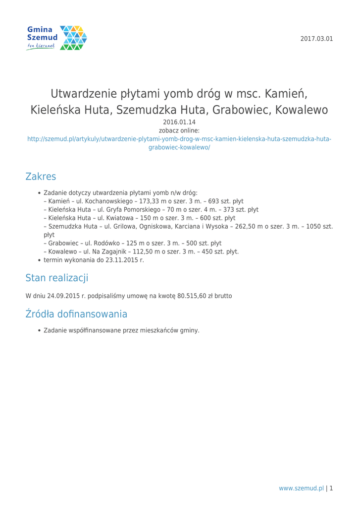 2017.03.01 Utwardzenie płytami yomb dróg w msc. Kamień, Kieleńska Huta, Szemudzka Huta, Grabowiec, Kowalewo 2016.01.14 zobacz online: http://szemud.pl/artykuly/utwardzenie-plytami-yomb-drog-w-msc-kamien-kielenska-huta-szemudzka-hutagrabowiec-kowalewo/ Zakres Zadanie dotyczy utwardzenia płytami yomb n/w dróg: – Kamień – ul. Kochanowskiego – 173,33 m o szer. 3 m. – 693 szt. płyt – Kieleńska Huta – ul. Gryfa Pomorskiego – 70 m o szer. 4 m. – 373 szt. płyt – Kieleńska Huta – ul. Kwiatowa – 150 m o szer. 3 m. – 600 szt. płyt – Szemudzka Huta – ul. Grilowa, Ogniskowa, Karciana i Wysoka – 262,50 m o szer. 3 m. – 1050 szt. płyt – Grabowiec – ul. Rodówko – 125 m o szer. 3 m. – 500 szt. płyt – Kowalewo – ul. Na Zagajnik – 112,50 m o szer. 3 m. – 450 szt. płyt. termin wykonania do 23.11.2015 r. Stan realizacji W dniu 24.09.2015 r. podpisaliśmy umowę na kwotę 80.515,60 zł brutto Źródła dofinansowania Zadanie współfinansowane przez mieszkańców gminy. www.szemud.pl | 1