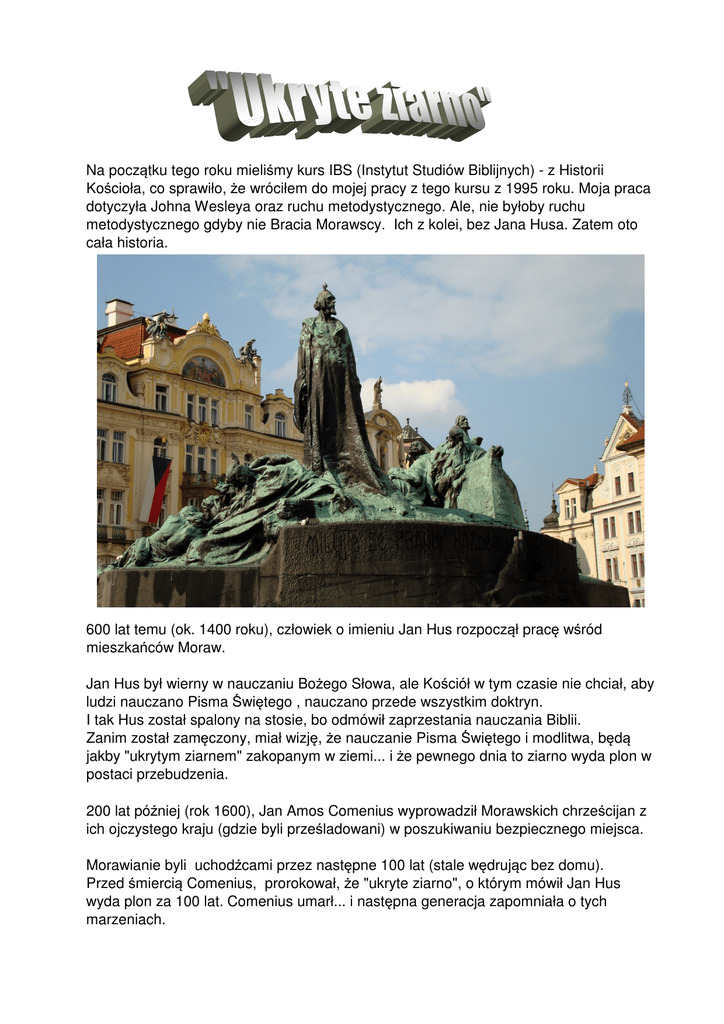 Na początku tego roku mieliśmy kurs IBS (Instytut Studiów Biblijnych) - z Historii Kościoła, co sprawiło, że wróciłem do mojej pracy z tego kursu z 1995 roku. Moja praca dotyczyła Johna Wesleya oraz ruchu metodystycznego. Ale, nie byłoby ruchu metodystycznego gdyby nie Bracia Morawscy. Ich z kolei, bez Jana Husa. Zatem oto cała historia. 600 lat temu (ok. 1400 roku), człowiek o imieniu Jan Hus rozpoczął pracę wśród mieszkańców Moraw. Jan Hus był wierny w nauczaniu Bożego Słowa, ale Kościół w tym czasie nie chciał, aby ludzi nauczano Pisma Świętego , nauczano przede wszystkim doktryn. I tak Hus został spalony na stosie, bo odmówił zaprzestania nauczania Biblii. Zanim został zamęczony, miał wizję, że nauczanie Pisma Świętego i modlitwa, będą jakby "ukrytym ziarnem" zakopanym w ziemi... i że pewnego dnia to ziarno wyda plon w postaci przebudzenia. 200 lat później (rok 1600), Jan Amos Comenius wyprowadził Morawskich chrześcijan z ich ojczystego kraju (gdzie byli prześladowani) w poszukiwaniu bezpiecznego miejsca. Morawianie byli uchodźcami przez następne 100 lat (stale wędrując bez domu). Przed śmiercią Comenius, prorokował, że "ukryte ziarno", o którym mówił Jan Hus wyda plon za 100 lat. Comenius umarł... i następna generacja zapomniała o tych marzeniach. W roku 1700, w zamożnej rodzinie szlacheckiej urodził się hrabia Nikolaus Ludwig von Zinzendorf. W wieku lat 4 znał zasady chrześcijańskie, a gdy miał lat 6 przyjął Jezusa Chrystusa jako swojego Pana i Zbawiciela. Historia nazywa go "bogatym młodzieńcem, który powiedział TAK " Był wiernym chrześcijaninem wychowanym jako luteranin i pochowanym jako luteranin. Kiedy Zinzendorf miał 27 lat, przyjął do siebie pojedynczych uchodźców morawskich. Wkrótce było ich 300, mieszkających w jego majątku, a on stał się ich duchowym przywódcą. Mieszkali w wiosce Hernnhut, w Niemczech. Razem modlili się, studiowali Słowo Boże i wzrastali duchowo. Gdy Zinzendorf studiował historię ludzi zwanych Braćmi Morawskimi, natknął się na dokument, który mówił o Johnie Amosie Comeniuszu i jego przepowiedni - że w ciągu 100 lat, "ukryte ziarno" będzie kiełkować i wyda plon w postaci duchowego przebudzenia. Kiedy Zinzendorf spojrzał na datę, zdał sobie sprawę, że mija dokładnie w 100 lat od spisania przepowiedni Comeniusa. Tego dnia wezwał wszystkich 300 Braci Morawskich, był to 12 sierpień 1727, i zorganizował całonocne spotkanie modlitewne. Następny dzień, 13 sierpnia 1727 roku, jest znany jako Morawska Pięćdziesiątnica. Duch Święty zstąpił na grupę 300 Morawian w potężny sposób, chociaż żaden z dokumentów, nie wspomina o mówieniu językami – to po prostu mieli spotkanie z żywym Bogiem. "Ukryte ziarno" zaczynało wydawać plon przebudzenia. Postanowili rozpocząć modlitewne czuwanie. W wyznaczonych miejscach w wiosce, modlili się w grupach po 3 osoby przez 1 godzinę dziennie. Więc... w danej godzinie... 3 ludzi modliło się razem w jednym miejscu. W tygodniu jest 168 godzin. We wszystkie 168 godzin modliły się 3 osobowe zespoły. Zatem podsumowując: 24 godziny na dobę, 7 dni w tygodniu, 3 osoby zawsze się modliły w miejscu modlitwy... przez 110 lat. Pytanie: czy wiesz, jaki rodzaj nadprzyrodzonej mocy Bożej jest uwalniany, gdy nieustannie się modlisz? Jak Bóg odpowiada na żarliwą modlitwę swoich dzieci? Serca braci Morawskich zaczęły bić w zgodzie z tym, co było w sercu Pana Boga. Zaczęli mieć pragnienie dotarcia z ewangelią do ludzi, którzy nigdy nie słyszeli o Jezusie Chrystusie. Ta mała grupa 300 Morawian, do roku 1760 wysłała 226 misjonarzy, którzy poszli i żyli wśród ludzi nieznających Boga, uczyli się ich języka i kultury, a następnie opowiadali im o Jezusie Chrystusie i budowali ich w wierze. Morawianie rozpoczęli nowoczesny ruch misyjny. Jeden historyk szacuje, że Morawianie byli by największym wyznaniem na świecie, gdyby nie to, że nie budowali swojej denominacji. Widząc wiarę Braci Morawskich do Chrystusa przyszedł John Wesley. Tak rozpoczął się ruch metodystyczny. Ordynowany przez niego na pastora Francis Asbury wyjechał do Teksas. Dziś w Teksasie jest ponad 2000 lokalnych kościołów metodystycznych. Misjonarze wysłani z małej wioski Hernnhut dotarli do Afryki, Ameryki, Azji i na Grenlandię. Założyli wiele kościołów w Rosji. Według historyka Gustava Warnecka, bracia czescy w dziedzinie misji dokonali więcej, niż wszystkie inne kościoły protestanckie razem wzięte. Większość misjonarzy stanowili nie duchowni, lecz osoby świeckie (często małżeństwa), a ich działalność nie była obliczona na masową chrystianizację tubylców, lecz na tworzenie w krajach misyjnych elit chrześcijańskich, które miały za zadanie nieść ewangelizację dalej. Co Bóg może uczynić, gdy grupa jego dzieci trwa razem w modlitwie, studiowaniu Pisma Świętego i troszczy się o duchowy wzrost? Czy Bóg może dać wzrost temu ziarnu, które zostało już zasiane w czasie ostatnich 40 lat w Polsce? Czy mamy wiarę, że to my możemy wzniecić pragnienie oddania Bogu i zaryzykowania, aby czynić uczniami wszystkie narody? W 2012 roku, 28 października spadł pierwszy śnieg tamtej wczesnej zimy. Popołudniu tamtego dnia wyszedłem na spacer do naszego pobliskiego Lasku Bielańskiego. Wszędzie było biało i bardzo spokojnie, dlatego zdziwiłem się, gdy zobaczyłem jak wiele potężnych drzew zostało powalonych. Myślałem, że to wiatr, ale wiatru nie było. Dopiero później miałem swoje WOW. To malutkie płatki śniegu były sprawcami tych powaleń. Dla mnie jest to ilustracją tego, co Bóg może uczynić, jeśli będziemy oddani dobrym rzeczom (List do Galacjan 6,9). Wiernej modlitwie, wytrwałym studiowaniu słowa i wprowadzaniu go w czyn, poświęcenia w czynieniu uczniów, budowania pomnażających liderów, rezygnacji z drugorzędnych spraw, trwania w Panu i boja