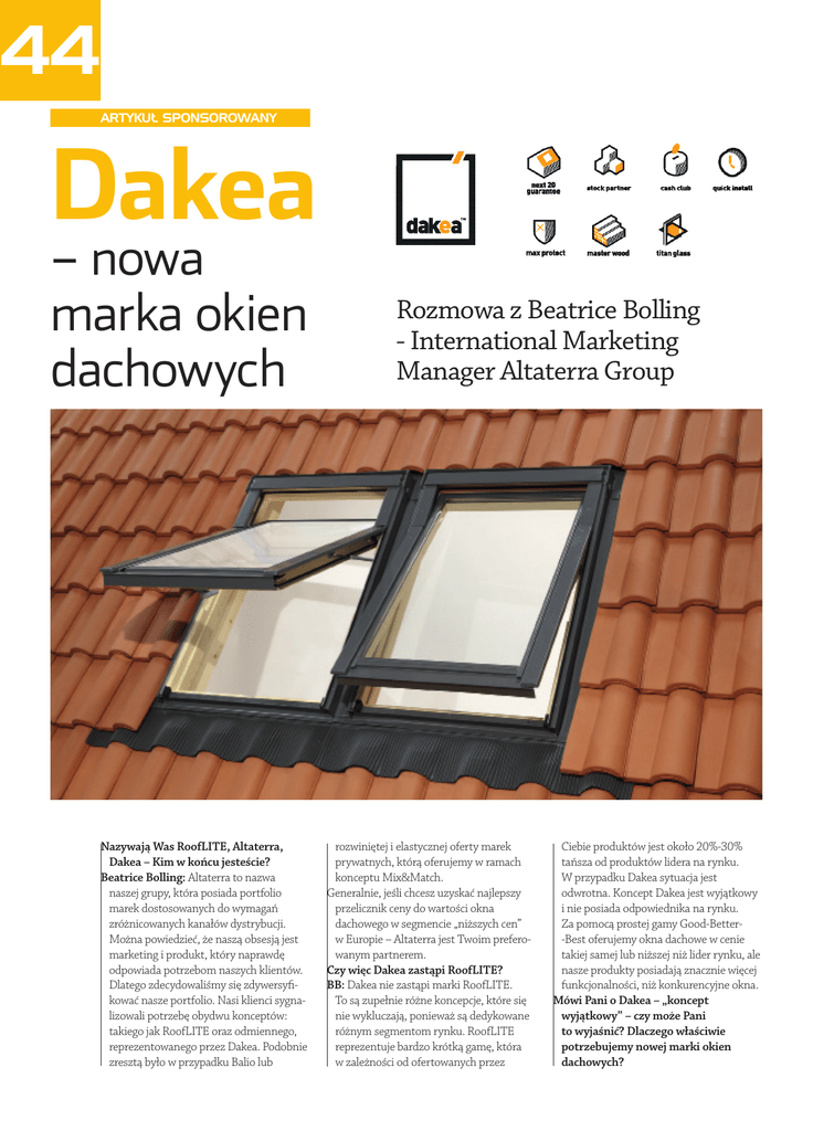 44 ARTYKUŁ SPONSOROWANY Dakea – nowa marka okien dachowych Nazywają Was RoofLITE, Altaterra, Dakea – Kim w końcu jesteście? Beatrice Bolling: Altaterra to nazwa naszej grupy, która posiada portfolio marek dostosowanych do wymagań zróżnicowanych kanałów dystrybucji. Można powiedzieć, że naszą obsesją jest marketing i produkt, który naprawdę odpowiada potrzebom naszych klientów. Dlatego zdecydowaliśmy się zdywersyfikować nasze portfolio. Nasi klienci sygnalizowali potrzebę obydwu konceptów: takiego jak RoofLITE oraz odmiennego, reprezentowanego przez Dakea. Podobnie zresztą było w przypadku Balio lub Rozmowa z Beatrice Bolling - International Marketing Manager Altaterra Group rozwiniętej i elastycznej oferty marek prywatnych, którą oferujemy w ramach konceptu Mix&Match. Generalnie, jeśli chcesz uzyskać najlepszy przelicznik ceny do wartości okna dachowego w segmencie „niższych cen” w Europie – Altaterra jest Twoim preferowanym partnerem. Czy więc Dakea zastąpi RoofLITE? BB: Dakea nie zastąpi marki RoofLITE. To są zupełnie różne koncepcje, które się nie wykluczają, ponieważ są dedykowane różnym segmentom rynku. RoofLITE reprezentuje bardzo krótką gamę, która w zależności od ofertowanych przez Ciebie produktów jest około 20%-30% tańsza od produktów lidera na rynku. W przypadku Dakea sytuacja jest odwrotna. Koncept Dakea jest wyjątkowy i nie posiada odpowiednika na rynku. Za pomocą prostej gamy Good‑Better‑Best oferujemy okna dachowe w cenie takiej samej lub niższej niż lider rynku, ale nasze produkty posiadają znacznie więcej funkcjonalności, niż konkurencyjne okna. Mówi Pani o Dakea – „koncept wyjątkowy” – czy może Pani to wyjaśnić? Dlaczego właściwie potrzebujemy nowej marki okien dachowych? BB: Dakea została stworzona by jak najpełniej odpowiedzieć na potrzeby profesjonalistów, poprzez wykreowanie produktów i usług wspierających rozwój ich biznesu. Co więc mogę otrzymać od Was, jako potencjalny dystrybutor, czego nie mają inni? BB: W zakresie usług – stworzyliśmy program Stock Partner, który zapewnia kompleksową obsługę magazynu produktów, w szczególności zaś umożliwia naszym Dystrybutorom skorzystanie z pozbawionej ryzyka i jakichkolwiek kosztów opcji sell & pay, czyli możliwości regulowania płatności za produkt dopiero po zrealizowaniu sprzedaży. W zakresie produktów – stworzyliśmy gamę, która jest przyjazna sprzedaży i posiada najlepszy przelicznik ceny do wartości produktu. Chcę przez to powiedzieć, że każde nasze okno posiada więcej wartościowych funkcjonalności niż okna konkurencyjne. Jednocześnie udało nam się utrzymać ceny na przystępnym poziomie, który gwarantuje ogólnodostępność naszych produktów. Ale, jak to jest możliwe? BB: Pytanie brzmi raczej gdzie znika 20% marży, za każdym razem, gdy ktoś sprzedaje podstawowy model okna 20% drożej niż Dakea. Całkowicie odmieniliśmy sposób, w jaki sprzedawane i promowane są okna dachowe w Polsce. Wybraliśmy koncepcję „więcej za mniej” i chcemy budować uczciwą i bezpośrednią relację z naszymi klientami. Założyliśmy, że docenią oni wysoką wartość kompleksowej oferty Dakea. W związku z tym wychodzimy im naprzeciw inwestując naszą marżę w rozwiązania takie jak Cash Club, Next 20, Quick Install, Master Wood, Titan Glass, Stock Partner, które są naprawdę przydatne zarówno naszym partnerom handlowym, jak i dekarzom oraz użytkownikom naszych produktów. Osobiście wiem, że nie wyrzucam ani złotówki na sponsorowanie dużych spotkań PR‑owych, kampanii telewizyjnych i billboardów. To jest kwestia wyboru. Jeśli chodzi o jakość naszych okien, nie może być mowy o żadnych kompromisach. Wszystkie okna dachowe Dakea objęte są 20‑letnią gwarancją. Czy moglibyśmy ją zaproponować, nie będąc całkowicie pewni naszej jakości? 20 lat gwarancji? BB: Wszystkie nasze okna objęte są 20‑letnią gwarancją. Uważamy bowiem, że jest to niezwykle istotna kwestia dla naszych klientów, jeśli weźmiemy pod uwagę wartość nieruchomości i komfort użytkowania naszych produktów. Możemy zaoferować tak długą gwarancję, ponieważ poddajemy nasze okna niezwykle wymagającym testom jakościowym, które dodatkowo wspieramy 60‑letnim doświadczeniem naszej grupy w zakresie produkcji okien dachowych. Każdy surowiec lub system, który wykorzystujemy w naszym produkcie jest bardzo starannie wybierany i pochodzi od najlepszych europejskich dostawców. Dobrze, macie więc coś dla dystrybutorów i klientów końcowych. Co z dekarzami? BB: Cóż, o nich dbamy chyba najbardziej. Trzeba przyznać, że są prawdziwymi mistrzami naszego biznesu. Nie ma produktu, który moglibyśmy wprowadzić, który miałby szansę przetrwać bez dobrych specjalistów od montażu. Dlatego dla dekarzy stworzyliśmy kompleksowy system wsparcia Cash Club – program partnerski dla zawodowych dekarzy, w ramach którego nagradzamy jakość oraz umiejętności specjalistów z branży pokryć dachowych. Doskonale wiemy, że większość firm rozdaje prezenty, wycieczki i wiele innych „bonusów”. My chcemy stworzyć system prosty i co najważniejsze przejrzysty, dlatego każdy zarejestrowany w naszym programie dekarz otrzyma od 20 do 30 złotych za zamontowane okno. Również nasz pakiet produktów został dopasowany do potrzeb dekarzy. Czy mogłaby Pani wyjaśnić? BB: Na przykład system Quick Install – do większości naszych produktów dodajemy, za darmo, kołnierz z folii paroprzepuszczalnej marki Dorken®, który skraca znacznie czas montażu, ponieważ nie ma potrzeby docinania folii i składania podkładu z wielu elementów. Kołnierz ten wykonany jest z rozciągliwej, odpornej na rozdarcie polistyrenowej włókniny z paroprzepuszczalną poliuretanową powłoką. Dobrze, macie więc coś dla dystrybutorów, dekarzy i klientów. Gdzie jest haczyk? BB: Nie ma haczyków! Pr