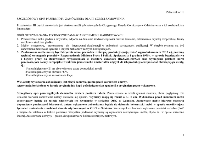Załącznik nr 1c SZCZEGÓŁOWY OPIS PRZEDMIOTU ZAMÓWIENIA DLA III CZĘŚCI ZAMÓWIENIA Przedmiotem III części zamówienia jest dostawa mebli gabinetowych do Okręgowego Urzędu Górniczego w Gdańsku wraz z ich rozładunkiem i montażem: OGÓLNE WYMAGANIA TECHNICZNE ZAMAWIANYCH MEBLI GABINETOWYCH: 1. Powierzchnie mebli gładkie i zmywalne, odporne na działanie środków czystości oraz na ścieranie, odbarwienia, wysoką temperaturę, fronty meblowe - struktura gładka. 2. Meble systemowe, przeznaczone do intensywnej eksploatacji w budynkach użyteczności publicznej. W obrębie systemu ma być zapewniona możliwość łączenia z innymi meblami w różnych konfiguracjach. 3. Zaoferowane meble muszą być fabrycznie nowe, pochodzić z bieżącej produkcji (mają zostać wyprodukowane w 2015 r.), powinny spełniać wymagania przepisów Rozporządzenia Ministra Pracy i Polityki Społecznej z 1 grudnia 1998r. w sprawie bezpieczeństwa i higieny pracy na stanowiskach wyposażonych w monitory ekranowe (Dz.U.98.148.973) oraz wymagania polskich norm przenoszących normy europejskie w zakresie jakości mebli i materiałów użytych do ich produkcji oraz posiadać obowiązujące atesty, tj.: 1/ atest higieniczny E1 na płytę wiórową użytą do produkcji mebli, 2/ atest higieniczny na obrzeże PCV, 3/ atest higieniczny na zastosowane kleje, Ww. atesty wykonawca zobowiązany jest złożyć zamawiającemu przed zawarciem umowy. Atesty mają być złożone w formie oryginału lub kopii poświadczonej za zgodność z oryginałem przez wykonawcę. Szczegółowy opis poszczególnych elementów zawiera poniższa tabela. Zamieszczone w tabeli rysunki stanowią obraz poglądowy. Do ustalenia wartości zamówienia należy kierować się opisem. Wymiary mogą się różnić o +/- 5 cm. Wykonawca przed montażem mebli zobowiązany będzie do zdjęcia właściwych ich wymiarów w siedzibie OUG w Gdańsku. Zamawiane meble biurowe stanowią doposażenie pomieszczeń biurowych, zatem wykonawca zobowiązany będzie do dobrania kolorystyki mebli w sposób umożliwiający łączenie i zestawianie z meblami obecnie użytkowanymi w OUG w Gdańsku. We wszystkich biurkach wykonane przelotki na kable (ilość i miejsce do ustalenia w trakcie pomiaru). Wszystkie podawane wymiary są wymiarami zewnętrznymi mebli, chyba że w opisie wskazano inaczej. Zastosowane uchwyty – proste, dwupunktowe w kolorze srebrnym, matowym. 1 Meble do gabinetu 1 - mają stanowić jednolitą całość i charakteryzować się nowoczesnym i ekskluzywnym wzornictwem. Meble stanowią doposażenie do istniejących mebli. Zatem kolorystykę i rodzaj wykończenia (z frezem lub bez) mebli należy dostosować do istniejącego biurka i kontenera – do ustalenia z przedstawicielem Zamawiającego w trakcie pomiaru w OUG w Gdańsku. Regał przeszklony systemu mebli „KANCLERZ” Toreko równoważny, o wymiarach (w cm): dł. 210, szer. 45 wys. 121: 1. regał przeszklony (1 szt). lub Korpus regału wykonany z płyty wiórowej o grubości 20-22 mm okleinowanej okleiną naturalną; wieniec wykonany z płyty wiórowej o grubości 30-32 mm okleinowanej okleiną naturalną. Przednia krawędź obłożona naturalnym drewnem, (ewentualnie wyprofilowana frezem kształtowym R 7-9 mm dwustronnie z odsunięciem 3-4 mm - doklejka z litego drewna – do uzgodnienia w trakcie pomiaru). krawędzie łączenia płyty z doklejką z litego drewna – niewidoczne, pokryte okleiną; fronty wykonane z płyty wiórowej o grubości 14 - 16 mm okleinowanej okleiną naturalną. Krawędzie proste okleinowane; półki wykonane z płyty wiórowej o grubości 20-22 mm okleinowanej okleiną naturalną. Krawędź prosta okleinowana; środkowa część regału - szkło o grubości 4 mm. plecy niewidoczne wykonane z HDF w kolorze zbliżonym do koloru mebla, natomiast widoczne okleinowane. zawiasy puszkowe 110 stopni. uchwyt na frontach płytowych - dostosowany do istniejących elementów mebli; okleina naturalna (fornir) – kolor dostosowany do istniejących elementów mebli; okleina naturalna na powierzchni mebli pokryta min. 3 warstwami lakieru poliuretanowego (półmat) zgodnego z normą EN 71-3. nogi na ślizgaczach dwuczopikowych z tworzywa. Stolik okolicznościowy systemu mebli „KANCLERZ” Toreko lub równoważny, o wymiarach (w cm): dł. 70, szer. 70 wys. 60: 2. blat i nogi: płyta wiórowa klejona ,grubość 45mm , oklejona okleiną naturalną krawędzie obłożone naturalnym drewnem, wyprofilowane frezem kształtowym R10 mm dwustronnie z odsunięciem 4 mm; nogi na ślizgaczach dwuczopikowych z tworzywa stolik okolicznościowy (1 szt.) 2 Meble do gabinetu 2 - mają stanowić jednolitą całość i charakteryzować się nowoczesnym i ekskluzywnym wzornictwem. Kolorystyka i rodzaj wykończenia – do ustalenia z przedstawicielem Zamawiającego w trakcie pomiaru w OUG w Gdańsku. Biurko na nogach metalowych systemu „SEN-TOR” Toreko lub równoważne, o wymiarach (w cm): 200x100x76 3. blaty wykonane z płyty MDF grubości 38 mm w okleinie naturalnej krawędzie blatu ofrezowane frezem kształtowym ku górze pod kątem 66 stopni, zaoblone promieniami R10 i R5 i barwione (bez doklejek) nogi rurowe kształtowe fi 80 mm z ramieniem fi 50 satyna z regulatorem poziomu, zakończone krążkiem z litego drewna blenda na dystansach metalowych, materiał płyta MDF 22 mm ofrezowana frezem kształtowym pod kątem 66 stopni, zaoblone promieniami R6 i R3 i barwione (bez doklejek) Biurko na nogach metalowych (1 szt.) Stolik komputerowy systemu „SEN-TOR” Toreko lub równoważne o wymiarach (w cm): dł. 147, szer. 60, wys. 76 4 blaty wykonane z płyty MDF grubości 38 mm w okleinie naturalnej krawędzie blatu ofrezowane frezem kształtowym ku górze pod kątem 66 stopni, zaoblone promieniami R10 i R5 i barwione (bez doklejek) nogi rurowe kształtowe fi 80 mm z ramieniem fi 50 satyna z regulatorem poziomu, zakończone krążkiem z litego drewna blenda na dystansach metalowych, materia