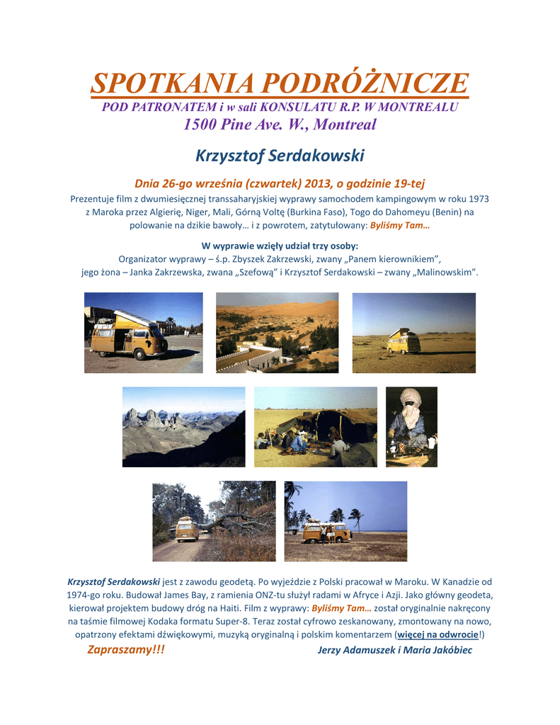 SPOTKANIA PODRÓŻNICZE POD PATRONATEM i w sali KONSULATU R.P. W MONTREALU 1500 Pine Ave. W., Montreal Krzysztof Serdakowski Dnia 26-go września (czwartek) 2013, o godzinie 19-tej Prezentuje film z dwumiesięcznej transsaharyjskiej wyprawy samochodem kampingowym w roku 1973 z Maroka przez Algierię, Niger, Mali, Górną Voltę (Burkina Faso), Togo do Dahomeyu (Benin) na polowanie na dzikie bawoły… i z powrotem, zatytułowany: Byliśmy Tam… W wyprawie wzięły udział trzy osoby: Organizator wyprawy – ś.p. Zbyszek Zakrzewski, zwany „Panem kierownikiem”, jego żona – Janka Zakrzewska, zwana „Szefową” i Krzysztof Serdakowski – zwany „Malinowskim”. Krzysztof Serdakowski jest z zawodu geodetą. Po wyjeździe z Polski pracował w Maroku. W Kanadzie od 1974-go roku. Budował James Bay, z ramienia ONZ-tu służył radami w Afryce i Azji. Jako główny geodeta, kierował projektem budowy dróg na Haiti. Film z wyprawy: Byliśmy Tam… został oryginalnie nakręcony na taśmie filmowej Kodaka formatu Super-8. Teraz został cyfrowo zeskanowany, zmontowany na nowo, opatrzony efektami dźwiękowymi, muzyką oryginalną i polskim komentarzem (więcej na odwrocie!) Zapraszamy!!! Jerzy Adamuszek i Maria Jakóbiec Byliśmy Tam… Dla wielu z Państwa film z roku 1973-ciego może wydawać się zbyt "retro", za odległy w czasie, aby mógł być ciekawy i aby warto było poświęcić wieczór na jego oglądanie. Na pewno są to uzasadnione i logiczne obawy i nie namawiałbym Państwa na ten seans, gdyby to było tylko zwykłe wspomnienie z dawno odbytej podróży… Ten film jednak nie jest zwykłym wspomnieniem; jest opowieścią o emocjach trojga Polaków, którzy podjęli trudne wyzwanie dwukrotnego przejechania samochodem tysięcy kilometrów przez bezdroża bezkresnej Sahary, spełnienia marzeń organizatora wyprawy – wytrawnego myśliwego – zapolowania na grubego zwierza w buszu Czarnej Afryki i głębszego osobistego poznania spotykanych po drodze ludzi: Berberów z rejonu Wielkiego Ergu Zachodniego; Tuaregów z okolic Tamanrasset i księżycowych gór Hoggaru; okolic mitycznych miast Agadez, Gao i Timbuktu, oraz czarnych plemion żyjących w tropikalnej dżungli między Niamey w Nigrze i Zatoką Gwinejską… Odwiedziliśmy również rodziny Europejczyków, którzy bądź, jako doradcy afrykańskich Rządów, bądź dla zarobku, bądź… z miłości osiedlili się w różnych miejscach na trasie naszej podróży. Do większości odwiedzonych przez nas rejonów Afryki, a pokazanych w tym filmie, nie można już dzisiaj normalnie pojechać. A już szczególnie do saharyjskich prowincji Nigru, Mali, czy przygranicznych stref pustynnej Algierii, bo grozi to porwaniem przez islamistów Al-Kaidy. Na oglądanych dziś rzadkich reportażach telewizyjnych z tych rejonów, ani pejzaże, ani ludzie nie zmienili się wiele od czasów naszej tam bytności. Film opowiada o trudnościach podróży, pokazuje fantastyczne pejzaże, ale również wprowadza do domów i namiotów napotykanych ludzi, mówi o ich radościach, troskach i życiu codziennym. Oryginalna taśma filmowa formatu Super-8, marki Kodak, zachowała się wyjątkowo dobrze i teraz została cyfrowo zeskanowana. Film o oryginalnej długości ponad 96-ciu minut, skrócony do niecałych osiemdziesięciu, został na nowo zmontowany, jego kolory, ostrość i format poprawione elektronicznie przy użyciu wysokiej klasy programu komputerowego. Sekwencje filmowe zostały uzupełnione dobrymi fotografiami wykonanymi w tym samym, co film czasie i jakby zatrzymującymi akcję filmu dla lepszego przyjrzenia się okolicy, czy ludziom. Całość została opatrzona efektami dźwiękowymi i muzyką, w dużym stopniu oryginalną, nagraną na taśmie magnetofonowej w czasie kręcenia filmu. Dodany został polski komentarz, nie tylko w formie narracji, ale również odczytane zostały części opowiadań inspirowanych przez przeżycia z tej wyprawy. Cytowane są także w komentarzu legendy i przysłowia, oraz ciekawe opowieści napotykanych ludzi. Jednym z najważniejszych powodów przygotowania do publicznej prezentacji tego starego filmu jest mój ukłon dla pamięci nieżyjącego już od trzech lat organizatora i głównego finansowego sponsora tej wyprawy, Zbyszka Zakrzewskiego. Mogę śmiało powiedzieć, że dalsze moje podróżnicze awantury oparte były organizacyjnie na tej mojej pierwszej, w której jednak nie mógłbym uczestniczyć bez Zbyszkowego zaproszenia i pokrycia znacznej części przypadających na mnie kosztów. Cześć Ci Podróżniku i prawdziwy Łowco! Oby Twoje wyprawy i polowania w Kraju Cieni sprawiały Ci wieczną przyjemność i satysfakcję! Krzysztof Serdakowski Ulotkę, te uwagi, oraz krótki wideoklip z filmu można również obejrzeć na stronie internetowej: http://www.szaser.com/Wideofilmy.html
