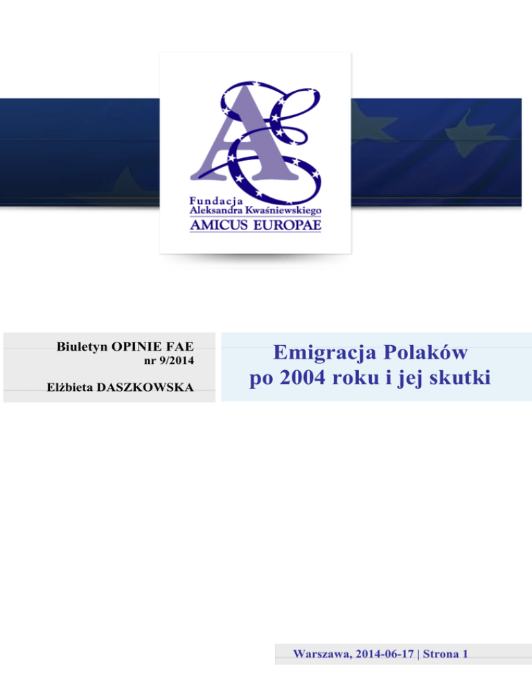 Biuletyn OPINIE FAE nr 9/2014 Elżbieta DASZKOWSKA Emigracja Polaków po 2004 roku i jej skutki Warszawa, 2014-06-17 | Strona 1 Emigracja Polaków po 2004 roku i jej skutki Biuletyn OPINIE FAE nr 9/2014 Elżbieta Daszkowska „Dla mnie emigracja jest zagrożeniem” Jeremi Mordasiewicz Doradca Zarządu PKPP Lewiatan 1 maja 2014 r. minęło dokładnie 10 lat od momentu akcesji Polski do Unii Europejskiej i oficjalnego otwarcia rynków wielu państw Europy Zachodniej. Zdaniem kluczowych ekspertów datę tą należy uznać za początek masowego exodusu Polaków – wg. oficjalnych statystyk za granicą żyje już ponad 2 mln posiadaczy polskich paszportów. W ocenie wielu badaczy po pierwszej fali migracji obecnie przyszła kolej na drugą, a co gorsza osoby decydujące się obecnie na wyjazd, zabierają ze sobą całe rodziny i nie planują powrotu do Ojczyzny. 1 Okazuje się, że skala wyjazdów będzie zapewne przybierać na sile, a świadczą o tym dane statystyczne – jedynie 17 na 100 dorosłych Polaków nie myśli o zmianie miejsca zamieszkania. Badacze tematyki migracji tak wypowiadają się o przyczynach tego zjawiska: „pierwsza fala migracji była awangardą, wyjeżdżali albo dobrze wykształceni albo desperaci, a teraz każdy jest gotów wyjechać.” 2 Skutki masowych wyjazdów są już silnie odczuwalne na polskim rynku pracy. Okazuje się, że już 50 proc. respondentów deklaruje problemy ze znalezieniem pracowników o określonych kwalifikacjach zawodowych, gdyż w znacznym stopniu ci wybrali szansę na dalszy rozwój zawodowy za granicą. Najbardziej brakuje pracowników z wykształceniem wyższym i średnim kierunkowym, a w grupie tej znajdują się informatycy, finansiści, logistycy, operatorzy maszyn, pracownicy budowlani, elektrycy i ślusarze, a więc przedstawiciele najbardziej poszukiwanych obecnie w Polsce zawodów. 3 Okazuje się więc, że obecnie Polak podejmując decyzję o wyjeździe kieruje się nie tylko aspektem materialnym tj. wysokością oferowanej stawki płacowej, ale też „chce stabilizacji, spokoju i wyższej kultury pracy.” 4 Ze skutków zachodzących teraz na krajowym rynku pracy zaczynają sobie zdawać sprawę w coraz większej mierze przedstawiciele pracodawców, a świadczy o tym wypowiedź Jeremiego Mordasiewicza, Doradcy Zarządu Polskiej Konfederacji Pracodawców Prywatnych Lewiatan, który oświadczył, że „już za 5 lat, z końcem fali wyżu Zob. „Newsweek” nr. 13/2014, wydanie z 24-03-2014 „Żegnaj Polsko.” Wypowiedź prof. K. Iglickiej- Okólskiej w „Newsweeku” nr 13/2014 3 Raport KPMG „Migracja pracowników - szansa czy zagrożenie?” , 2008 r. 4 Wypowiedź J. Słowika w „Newsweeku” 13/2014 1 2 Warszawa, 2014-06-17 | Strona 2 Emigracja Polaków po 2004 roku i jej skutki Biuletyn OPINIE FAE nr 9/2014 Elżbieta Daszkowska demograficznego, sytuacja na rynku pracy ulegnie radykalnej zmianie. Konieczne jest zatem podjęcie działań zachęcających emigrantów do powrotu. Pracownicy z doświadczeniem zagranicznym będą bardzo cenni gdyż wniosą różnego rodzaju kwalifikacje, kulturę pracy i zachowań i relacji w firmie. Dokona się transfer cywilizacyjny.” 5 Na podstawie ww. informacji można postawić następujące tezy: emigracja pracowników fizycznych już się skończyła. Teraz na wyjazd na stałe decydują się głównie osoby młode, bardzo dobrze wykształcone wraz z całymi rodzinami. Osoby te nie wrócą już do kraju, ani tym bardziej ich dzieci; kierunki migracji uległy zmianie z uwagi na odmienną strukturę popytu na pracowników i podaży siły roboczej; ekonomiczno-społeczne skutki migracji będą dla Polski bardzo niekorzystne. W ostatecznym rozliczeniu okazuje się, że Polacy budują dobrobyt państw docelowych osiedlenia, w tym w przeważającym stopniu w krajach Europy Zachodniej. Zmiana struktury polskiego emigranta (tj. wiek, płeć, wykształcenie, regiony pochodzenia) jest bardzo dobrze dostrzegana na przestrzeni ostatnich 20 lat. Okres lat 90. XX w. był czasem, gdy dominowały wyjazdy „za chlebem” z regionów Polski szczególnie mocno dotkniętych negatywnymi skutkami transformacji gospodarczej. Chodzi głównie o te województwa, w których pojawiło się masowe bezrobocie – podkarpackie, podlaskie, lubelskie czy świętokrzyskie. Struktura zawodowa ludności była w dużym stopniu dostosowana do potrzeb sektora rolnego i przemysłowego, tak więc przeciętny polski emigrant legitymizował się wykształceniem podstawowym (gimnazjalnym) lub zasadniczym zawodowym. Osoby z dyplomem studiów wyższych stanowiły rzadkość. Sytuacja ta była wynikiem zmian, jakie zaszły na polskim rynku pracy w latach 90. XX w., kiedy to w strukturze gospodarczej zaczął dominować sektor usług i siłą rzeczy utrzymywał się silny popyt na osoby najlepiej wykształcone (Tabela nr 1). Charakterystyczny dla opisywanego przedziału czasu jest też fakt, że to głównie młodzi mężczyźni do 24 roku życia decydowali się w przeważającej mierze na emigrację (stosunek płci w strukturze migracyjnej kształtował się mniej więcej na poziomie 3:1). 5 „Migracja pracowników…” Warszawa, 2014-06-17 | Strona 3 Emigracja Polaków po 2004 roku i jej skutki Biuletyn OPINIE FAE nr 9/2014 Elżbieta Daszkowska Relacje te w przypadku kobiet powoli zaczęły się zmieniać, w początkowej fazie kobiety wyjeżdżały za granicę w ramach łączenia rodzin, a obecnie Panie samodzielnie i w dużej mierze samotnie podejmują decyzję o wyjeździe. Początkowo Polacy podejmowali głównie pracę w sektorach gospodarki wysoce pracochłonnych, a więc: budownictwo, rolnictwo, usługi remontowe, praca w gospodarstwach domowych w tym opieka nad osobami starszymi i dziećmi (głównie kobiety). Tabela nr 1 – odsetek osób z danym poziomem wykształcenia wśród emigrantów Poziom wykształcenia Przed 1998 1998-2003 2004-2007 Gimnazjalne lub podstawowe 18,4 13,0 6,1 Zasadnicze zawodowe 36,0 32,8 25