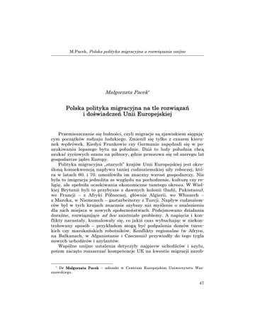 M.Pacek, Polska polityka migracyjna a rozwiązania unijne Małgorzata Pacek * Polska polityka migracyjna na tle rozwiązań i doświadczeń Unii Europejskiej Przemieszczanie się ludności, czyli migracje są zjawiskiem sięgającym początków rodzaju ludzkiego. Zmienił się tylko z czasem kierunek wędrówek. Kiedyś Frankowie czy Germanie zapędzali się w poszukiwaniu lepszego bytu na południe. Dziś to ludy południa chcą szukać życiowych szans na północy, gdzie przesuwa się od szeregu lat gospodarcze jądro Europy. Polityka migracyjna „starych” krajów Unii Europejskiej jest określoną konsekwencją napływu taniej cudzoziemskiej siły roboczej, która w latach 60. i 70. umożliwiła im znaczny wzrost gospodarczy. Nie była to imigracja jednolita ze względu na pochodzenie, kulturę czy religię, ale spełniła oczekiwania ekonomiczne tamtego okresu. W Wielkiej Brytanii byli to przybysze z dawnych kolonii (Indii, Pakistanu), we Francji – z Afryki Północnej, głównie Algierii, we Włoszech – z Maroka, w Niemczech – gastarbeiterzy z Turcji. Napływ cudzoziemców był w tych krajach znacznie szybszy niż myślenie o znalezieniu dla nich miejsca w nowych społeczeństwach. Podejmowano działania doraźne, rozwiązujące ad hoc zaistniałe problemy. A napięcia i konflikty narastały, kumulowały się, co jakiś czas wybuchając w niekontrolowany sposób – przykładem mogą być podpalenia domów tureckich czy marokańskich robotników. Konflikty regionalne (w Afryce, na Bałkanach, w Afganistanie i Czeczenii) przywiodły do tego tygla nowych uchodźców i azylantów. Wspólne unijne ustalenia dotyczyły najpierw uchodźców i azylu, potem zaczęto rozszerzać kompetencje UE na kwestie migracji zarob- * Dr Małgorzata Pacek – adiunkt w Centrum Europejskim Uniwersytetu Warszawskiego. 47 Studia Europejskie, 4/2005 kowych i wreszcie na niesłychanie ważne problemy integracji cudzoziemców. Konwencja Dublińska z 1990 r. była pierwszym podejściem Wspólnoty do rozwiązania problemu właściwości państwa do rozpatrywania wniosku azylowego. Nakładała obowiązek rozpatrzenia wniosku przez państwo pierwszego wjazdu, co miało wyeliminować problem składania go w kilku kolejnych krajach. Następnym krokiem był Traktat z Maastricht, podpisany w 1992 r. Wskazywał on sferę wymiaru sprawiedliwości i spraw wewnętrznych, a zatem także politykę azylową i migracyjną jako dziedziny, w których konieczne jest współdziałanie państw członkowskich. Rzeczywistym punktem zwrotnym stał się Traktat Amsterdamski z 1997 r., który przenosił problematykę migracji z III filaru (decyzje międzyrządowe) do filaru I (decyzje wspólnotowe), uznając tym samym ważność i konieczność rozwiązań wspólnotowych w tej dziedzinie. Traktat włączał ponadto postanowienia z Schengen do dorobku prawnego Unii. Dalszą konsekwencją tych decyzji były ustalenia „szczytu” w Tampere (1999 r.), które dotyczyły kompetencji określonego Konwencją Dublińską państwa odpowiedzialnego za rozpatrzenie wniosku azylowego, ustalenie wspólnych standardów dla statusu uchodźcy i przyjmowania uchodźców w krajach Unii. Wspomniano tam również o konieczności uczciwego traktowania legalnie przebywających cudzoziemców i wypracowania efektywnej polityki integracyjnej. Ważnym elementem dyskusji podczas „szczytu” w Tampere było dostrzeżenie możliwości prognozowania i sterowania falami napływających imigrantów, jak też możliwie kompleksowe przygotowanie się do eliminowania przestępczych procederów przemytu cudzoziemców na terytorium Unii Europejskiej. A to może być realne jedynie w przypadku zapewnienia cudzoziemcom jasno określonych prawem możliwości wjazdu na teren Wspólnoty. W następstwie ustaleń z Tampere Komisja Europejska przygotowała szereg dyrektyw, wśród których na szczególną uwagę zasługują dyrektywy odnoszące się do: – zasad łączenia rodzin imigrantów, – statusu rezydentów UE, – zasad admisji studentów i pracowników migracyjnych. Nie bez znaczenia były także przyjęte plany działania zmierzające do: przeciwdziałania nielegalnym migracjom, promowania dobrowolnych powrotów do kraju pochodzenia czy udzielania wsparcia krajom spoza Unii w zakresie migracji i azylu. Prezydencja holenderska (lipiec-grudzień 2004 r.) odniosła się do ustaleń z Tampere, ponieważ mijało 5 lat, które przewidziano na ich 48 M.Pacek, Polska polityka migracyjna a rozwiązania unijne realizację. „Nie chcemy stworzyć fortecy Europa” – powiedział premier Holandii, ale zwracał uwagę, że konieczna jest kontrola granic Unii Europejskiej i ograniczenie fali nielegalnej emigracji. „W Unii otwar- tych wewnętrznych granic nie możemy nie posiadać wspólnej polityki w sprawach imigracji, repatriacji i azylu”. Tworzenie szans integracji ze społeczeństwem przyjmującym, zapewnienie praw porównywalnych do statusu własnych obywateli jest niestety bardzo kosztowne, rezultaty zaś do końca niepewne. W społeczeństwach europejskich istnieje generalnie przekonanie o konieczności integracji imigrantów, ale problemem jest, kto pokryje związane z tym koszty. Integracja nie może być przypadkowa i doraźna. Osoby przybywające do danego kraju powinny znać zasady procesu integracji i organy za nią odpowiedzialne, aby mieć wyobrażenie o oczekiwaniach, jakie ma wobec nich społeczeństwo przyjmujące. Prezydencja holenderska, szukając metod rozwiązania problemu skłaniała się ku pomocy krajom pochodzenia uchodźców, a choć nie zostało to explicite wyartykułowane, w tle jawi się powstały wcześniej w Wielkiej Brytanii pomysł tworzenia ośrodków dla uchodźców poza granicami Unii. 1 W kontekście nasilających się problemów migracyjnych znaczenia nabiera odpowiedź na pytanie: jaki kierunek napływu imigrantów jest dla Europy najkorzystniejszy? Istnieje już pewna sytuacja zastana – w Europie mieszka prawie 20 mln 