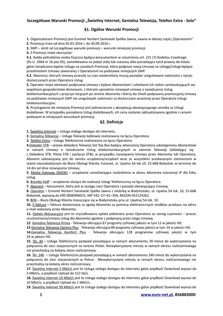 Szczegółowe Warunki Promocji „Świetlny Internet, Genialna Telewizja, Telefon Extra - Solo” §1. Ogólne Warunki Promocji 1. Organizatorem Promocji jest Euronet Norbert Saniewski Spółka Jawna, zwana w dalszej części„Operatorem”. 2.. Promocja trwa od dnia 05.01.2016 r. do 30.09.2016 31.03.2016 r. 3. SWP – skrót od szczegółowe warunki promocji – warunki niniejszej promocji. 4. Z Promocji może skorzystać: 4.1. Każda pełnoletnia osoba fizyczna będąca konsumentem w rozumieniu art. 221 (7) Kodeksu Cywilnego (Dz.U. 1964 nr 16 poz.93), zameldowana na pobyt stały lub czasowy albo posiadająca tytuł prawny do lokalu gdzie świadczona będzie Usługa na zasadach Promocji, która podpisze nową Umowę na Usługę/Usługi będące przedmiotem Umowy zawieranej z Operatorem na podstawie niniejszych SWP. 4.2. Abonenci, których Umowy przeszły na czas nieokreślony muszą posiadać uregulowane należności z tytułu dostarczanych przez Operatora Usług. 5. Operator może odmówić podpisania Umowy z byłymi Abonentami i członkami ich rodzin zamieszkujących we wspólnym gospodarstwie domowym, z którymi uprzednio rozwiązał umowę o świadczenie Usług telekomunikacyjnych z przyczyn leżących po stronie Abonenta i którzy do chwili podpisania promocyjnej Umowy na podstawie niniejszych SWP nie uregulowali należności za dostarczane wcześniej przez Operatora Usługi telekomunikacyjne. 6. Przystąpienie do niniejszej Promocji jest jednoznaczne z akceptacją obowiązującego cennika za Usługi dodatkowe. W przypadku posiadania Usług dodatkowych, ich cena zostanie zaktualizowana zgodnie z cenami podanymi w niniejszych warunkach promocji. §2. Definicje 1. Świetlny Internet – Usługa stałego dostępu do Internetu. 2. Genialna Telewizja – Usługa Telewizji kablowej realizowana na łączu Operatora. 3. Telefon Extra – Usługa Telefoniczna realizowana na łączu Operatora. 4.Dekoder STB – zestaw dekodera Telewizji Set Top Box będący własnością Operatora udostępniony Abonentowi w ramach Umowy o świadczenie Usług telekomunikacyjnych w zakresie Telewizji (składający się z Dekodera STB, Pilota STB i zasilacza STB); w przypadku rozwiązania Umowy przez Abonenta lub Operatora, Abonent zobowiązany jest do zwrotu urządzenia/urządzeń wraz ze wszystkimi przekazanymi elementami w stanie nieuszkodzonym do Biura Obsługi Klienta: Euronet, ul. Upalna 5A lok.10, 15-668 Białystok, w terminie do 14 dni od dnia rozwiązania Umowy. 5. Media Gateway (MGW) – urządzenie umożliwiające rozdzielenie w domu Abonenta transmisji IP dla kilku Usług. 6. Bramka VoIP – urządzenie służące do realizacji Usługi Telefonicznej na łączu Operatora. 7. Abonent – konsument, który jest w zasięgu sieci Operatora i posiada obowiązująca Umowę. 8. Operator – Euronet Norbert Saniewski Spółka Jawna z siedzibą w Białymstoku, ul. Upalna 5A lok. 10, 15-668 Białystok, wpisaną do KRS 0000496015, NIP 542–27–61–356, REGON 052124262. 9. BOK – Biuro Obsługi Klienta mieszczące się w Białymstoku przy ul. Upalnej 5A lok. 10. 10. E-faktura – faktura dostarczana za zgodą Abonenta za pomocą elektronicznych środków przekazu na adres e-mail wskazany przez Abonenta. 11. Opłata Aktywacyjna jest to zryczałtowana opłata pobierana przez Operatora za szereg czynności – proces uruchomienia/zmiany Usług dla Abonenta zgodnie z podpisaną przez niego Umową. 12. Genialna Telewizja Prima - Telewizja oferująca 67 programy cyfrowej jakości w tym 12 w jakości HD. 13 Genialna Telewizja Optima Plus - Telewizja oferująca 89 programy cyfrowej jakości w tym 14 w jakości HD. 14.Genialna Telewizja Komfort Plus - Telewizja oferująca 128 programów cyfrowej jakości w tym 24 w jakości HD. 15. Tel. 30 – Usługa Telefoniczna postpaid posiadająca w ramach abonamentu 30 minut do wykorzystania na połączenia do sieci stacjonarnych na terenie Polski. Niewykorzystane minuty w ramach okresu rozliczeniowego nie przechodzą na kolejny okres rozliczeniowy. 16. Tel. 240 – Usługa Telefoniczna postpaid posiadającą w ramach abonamentu 240 minut do wykorzystania na połączenia do sieci stacjonarnych w Polsce . Niewykorzystane minuty w ramach okresu rozliczeniowego nie przechodzą na kolejny okres rozliczeniowy. 17. Świetlny Internet 5 Mbit/s jest to Usługa stałego dostępu do Internetu gdzie prędkość Download wynosi do 5 Mbit/s, a prędkość Upload do 512 kb/s. 18. Świetlny Internet 10 Mbit/s jest to Usługa stałego dostępu do Internetu gdzie prędkość Download wynosi do 10 Mbit/s, a prędkość Upload do 1 Mbit/s. 19. Świetlny Internet 50 Mbit/s jest to Usługa stałego dostępu do Internetu gdzie prędkość Download wynosi do 1 www.euro-net.pl, 856883000 Szczegółowe Warunki Promocji „Świetlny Internet, Genialna Telewizja, Telefon Extra - Solo” 50 Mbit/s, a prędkość Upload do 5 Mbit/s. 20. Świetlny Internet 100 Mbit/s jest to Usługa stałego nielimitowanego dostępu do Internetu, gdzie prędkość Download wynosi do 100 Mbit/s a prędkość Upload wynosi do 10 Mbit/s. W ramach Usługi Operator udostępnia stały publiczny adres IP. 21. Świetlny Internet 200 Mbit/s jest to Usługa stałego nielimitowanego dostępu do Internetu, gdzie prędkość Download wynosi do 200 Mbit/s a prędkość Upload wynosi do 20 Mbit/s. W ramach Usługi Operator udostępnia stały publiczny adres IP. 22. Świetlny Internet 500 Mbit/s jest to Usługa stałego nielimitowanego dostępu do Internetu, gdzie prędkość Download wynosi do 500 Mbit/s a prędkość Upload wynosi do 50 Mbit/s. W ramach Usługi Operator udostępnia stały publiczny adres IP. 23. Dodatkowy PC ze stałym publicznym adresem IP - Usługa dodatkowa do Usługi Świetlny Internet, umożliwiająca jednoczesne korzystanie z Usługi na większej ilości komputerów posiadających unikatowy stały publiczny adres IPv4. 24. Umowa na czas nieokreślony/prepaid w przypadku Usługi Świetlny Internet należy rozumieć