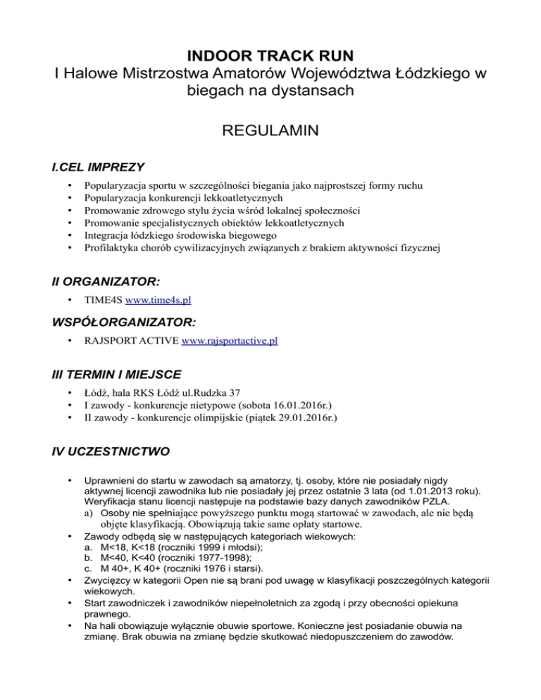 INDOOR TRACK RUN I Halowe Mistrzostwa Amatorów Województwa Łódzkiego w biegach na dystansach REGULAMIN I.CEL IMPREZY • • • • • • Popularyzacja sportu w szczególności biegania jako najprostszej formy ruchu Popularyzacja konkurencji lekkoatletycznych Promowanie zdrowego stylu życia wśród lokalnej społeczności Promowanie specjalistycznych obiektów lekkoatletycznych Integracja łódzkiego środowiska biegowego Profilaktyka chorób cywilizacyjnych związanych z brakiem aktywności fizycznej II ORGANIZATOR: • TIME4S www.time4s.pl WSPÓŁORGANIZATOR: • RAJSPORT ACTIVE www.rajsportactive.pl III TERMIN I MIEJSCE • • • Łódź, hala RKS Łódź ul.Rudzka 37 I zawody - konkurencje nietypowe (sobota 16.01.2016r.) II zawody - konkurencje olimpijskie (piątek 29.01.2016r.) IV UCZESTNICTWO • Uprawnieni do startu w zawodach są amatorzy, tj. osoby, które nie posiadały nigdy aktywnej licencji zawodnika lub nie posiadały jej przez ostatnie 3 lata (od 1.01.2013 roku). Weryfikacja stanu licencji następuje na podstawie bazy danych zawodników PZLA. a) Osoby nie spełniające powyższego punktu mogą startować w zawodach, ale nie będą objęte klasyfikacją. Obowiązują takie same opłaty startowe. • • • • Zawody odbędą się w następujących kategoriach wiekowych: a. M<18, K<18 (roczniki 1999 i młodsi); b. M<40, K<40 (roczniki 1977-1998); c. M 40+, K 40+ (roczniki 1976 i starsi). Zwycięzcy w kategorii Open nie są brani pod uwagę w klasyfikacji poszczególnych kategorii wiekowych. Start zawodniczek i zawodników niepełnoletnich za zgodą i przy obecności opiekuna prawnego. Na hali obowiązuje wyłącznie obuwie sportowe. Konieczne jest posiadanie obuwia na zmianę. Brak obuwia na zmianę będzie skutkować niedopuszczeniem do zawodów. • • • • • • • • • • • • • • • • • Zawodnicy mogą startować w obuwiu sportowym typu „kolce”. Obowiązuje bezwzględny zakaz przebywania osób postronnych na płycie oraz bieżni okrężnej, co dotyczy również osób, które nie startują w danej konkurencji. Rozgrzewka odbywać się będzie na płycie hali, na 40 minut przed rozpoczęciem konkurencji. We wszystkich konkurencjach odbędą się serie na czas. Rozstawienie zawodniczek i zawodników w seriach jest przypadkowe, a kolejność serii jest losowana. Pomiar czasu dokonywany będzie za pomocą chronometrażu „Slandi” i programu fotofiniszu „SprintTimer”. Obsługę zawodów stanowić będą licencjonowani sędziowie PZLA. Na zawodach obowiązują przepisy IAAF 2016-17. Szczegółowy program minutowy zawodów dostępny będzie po zamknięciu panelu rejestracyjnego na 3 dni przed każdą imprezą. Ubezpieczenie leży w gestii uczestników zawodów. Opłaty startowe: i. Start w pierwszej konkurencji – 15 zł; ii. Każdy kolejny start – 5zł (od konkurencji). Nagrody: za pierwsze trzy miejsca w kategoriach wiekowych i kategorii „open” – Puchary oraz nagrody. Kategoria Open i kategorie wiekowe nie dublują się. Organizator zastrzega sobie możliwość zwiększenia puli nagród. Uczestnicy wysyłając formularz zgłoszeniowy oświadczają, że nie ma medycznych przeciwwskazań do udziału w zawodach. Organizator zastrzega sobie prawo do wykorzystywania w celach promocyjnych, informacyjnych, wszelkich zdjęć, materiałów filmowych, wywiadów przedstawiających uczestników biegu. Organizator zastrzega sobie prawo odwołania imprezy bez podawania przyczyn. W sprawach trudnych prosimy o kontakt drogą elektroniczną [email protected] ewentualnie kontakt telefoniczny Radosław Sekieta 501 894 154.