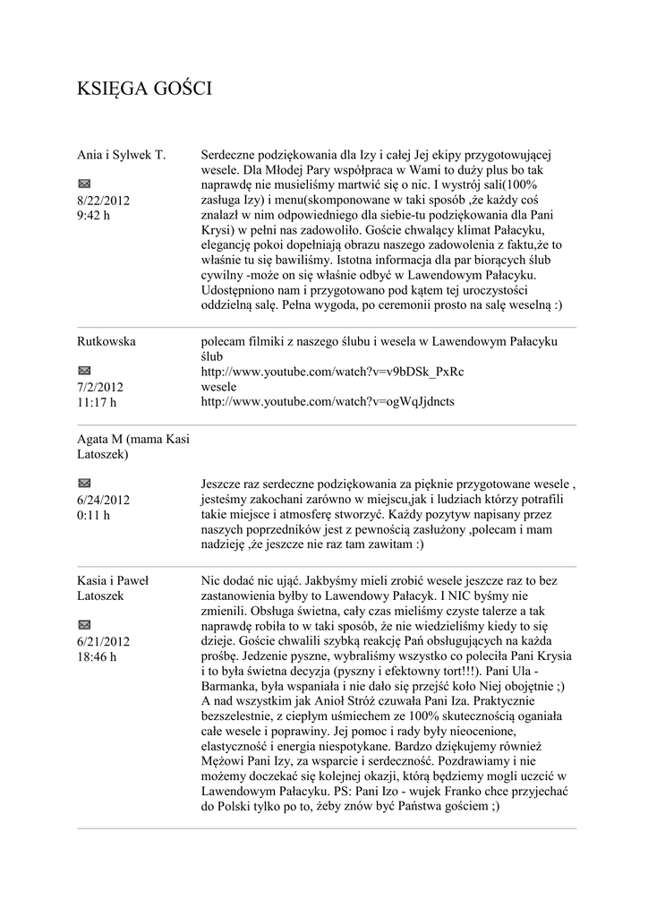 KSIĘGA GOŚCI Ania i Sylwek T. 8/22/2012 9:42 h Rutkowska 7/2/2012 11:17 h Serdeczne podziękowania dla Izy i całej Jej ekipy przygotowującej wesele. Dla Młodej Pary współpraca w Wami to duży plus bo tak naprawdę nie musieliśmy martwić się o nic. I wystrój sali(100% zasługa Izy) i menu(skomponowane w taki sposób ,że każdy coś znalazł w nim odpowiedniego dla siebie-tu podziękowania dla Pani Krysi) w pełni nas zadowoliło. Goście chwalący klimat Pałacyku, elegancję pokoi dopełniają obrazu naszego zadowolenia z faktu,że to właśnie tu się bawiliśmy. Istotna informacja dla par biorących ślub cywilny -może on się właśnie odbyć w Lawendowym Pałacyku. Udostępniono nam i przygotowano pod kątem tej uroczystości oddzielną salę. Pełna wygoda, po ceremonii prosto na salę weselną :) polecam filmiki z naszego ślubu i wesela w Lawendowym Pałacyku ślub http://www.youtube.com/watch?v=v9bDSk_PxRc wesele http://www.youtube.com/watch?v=ogWqJjdncts Agata M (mama Kasi Latoszek) 6/24/2012 0:11 h Kasia i Paweł Latoszek 6/21/2012 18:46 h Jeszcze raz serdeczne podziękowania za pięknie przygotowane wesele , jesteśmy zakochani zarówno w miejscu,jak i ludziach którzy potrafili takie miejsce i atmosferę stworzyć. Każdy pozytyw napisany przez naszych poprzedników jest z pewnością zasłużony ,polecam i mam nadzieję ,że jeszcze nie raz tam zawitam :) Nic dodać nic ująć. Jakbyśmy mieli zrobić wesele jeszcze raz to bez zastanowienia byłby to Lawendowy Pałacyk. I NIC byśmy nie zmienili. Obsługa świetna, cały czas mieliśmy czyste talerze a tak naprawdę robiła to w taki sposób, że nie wiedzieliśmy kiedy to się dzieje. Goście chwalili szybką reakcję Pań obsługujących na każda prośbę. Jedzenie pyszne, wybraliśmy wszystko co poleciła Pani Krysia i to była świetna decyzja (pyszny i efektowny tort!!!). Pani Ula Barmanka, była wspaniała i nie dało się przejść koło Niej obojętnie ;) A nad wszystkim jak Anioł Stróż czuwała Pani Iza. Praktycznie bezszelestnie, z ciepłym uśmiechem ze 100% skutecznością oganiała całe wesele i poprawiny. Jej pomoc i rady były nieocenione, elastyczność i energia niespotykane. Bardzo dziękujemy również Mężowi Pani Izy, za wsparcie i serdeczność. Pozdrawiamy i nie możemy doczekać się kolejnej okazji, którą będziemy mogli uczcić w Lawendowym Pałacyku. PS: Pani Izo - wujek Franko chce przyjechać do Polski tylko po to, żeby znów być Państwa gościem ;) Malwina 6/2/2012 18:44 h Aldona 5/30/2012 20:09 h Rutkowscy Wystrój naprawdę śliczny . Obsługa FATALNA - Panie kelnerki bardzo niemiłe , nie zmieniają zastawy. Przez całe wesele nie zmieniona mi talerzyka a jak się upomniałam to Pani kelnerka odp. ,że talerzyki są przy kawie. Faktycznie po kawę i talerzyk do ciasta trzeba latać na drugi koniec sali !! Pierwszy raz spotkałam się z serwowaniem jedzenia do stolika a nie do gościa. Tak naprawdę to goście musieli sobie podać nawzajem jedzenie. Kuchnia też nie za dobra , mięso bez smaku i sałatki wszystkie podobne w smaku. Nie polecam . Osobiście nie chciałabym mieć wesela z tak słabą, niemiłą obsługą i kuchnią bez smaku. Z przykrością muszę napisać,że nie polecam tego miejsca. Nie jest tak tam słodko jak wszyscy zchwycają byłam tam na weselu jakiś czas temu obsługa taka sobie,po kawę trzeba było biegać przez całą salę tańca ponieważ obsługa nie poda,a włściciele tylko ten CATERING TAM AKCEPTUJĄ,nie jest tam tak super niestety. Ślub i wesele z moich marzeń. Wszystko było piękniejsze niż mogłam sobie wyobrazić. Dokonaliśmy dobrego wyboru, goście bardzo zadowoleni. Dziękujemy!!! 5/27/2012 22:37 h Przemek Mach 5/17/2012 20:26 h M.S. PODGÓRSCY 5/16/2012 21:43 h Pawinska 5/11/2012 Ostatnią noc spędziłem w Pałacyku; służbowy wyjazd. Przepiękne miejsce, wspaniały wystrój, wygodne pokoje. Telewizja naziemna ( cyfrówka ), zadbane toalety, czysta pościel. Na śniadanie podano placki z jabłkami. Bomba. Oprócz tego standardzik - pieczywo, wędlina, ser żółty, pomidorek. Dobra kawa. W skrócie: nie mogę się przyczepić do czegokolwiek. Było fantastycznie. Gorąco polecam - jest niedrogo. Właścicielom polecam wystawienie szyldu/baneru przy głównej drodze :) Dam 9/10. 9 dlatego że nie ma kuchni więc na kolację trzeba iść gdzieś indziej. Witam, gościliśmy w Lawendowym Pałacyku na uroczystym obiedzie z okazji Pierwszej Komunii naszej córki. Było super. Miła atmosfera, jedzenie przepyszne i w bardzo dużej ilości. Wszystko smaczne i gustownie podane. Stół pięknie udekorowany. I nam i wszystkim gościom bardzo się podobało. Przy okazji jeszcze raz dziękujemy właścicielom i całemu personelowi (szczególne ukłony dla Pani Krysi, która tak świetnie umie wszystkich nakarmić! - nawet wegetarianin pęka z przejedzenia). Serdecznie polecamy! super!!! pozdrawiam 16:01 h Wyrobek Krótki pobyt podczas delegacji w Pałacyku dał nam chwile wytchnienie i relaksu, wygodne łóżko po ciężkim dniu i pyszne śniadanko, że ciężko było wyjechać rankiem. Dziękujemy, Aleksandry ze Śląska. 3/1/2012 23:39 h Iwona i Andrzej 1/28/2012 18:57 h Magda i Paweł 1/9/2012 17:46 h Piekarski Wspaniałe miejsce, bardzo ciepłe i przytulne. Mieliśmy tam ślub 20.08.2011r. Profesjonalna obsługa pani Iza i cała jej rodzina wspaniała, Ula przygotowała wspaniałe drinki.Jedzenia tyle,że nie dało sie tego zjeść,dużo dostaliśmy do domu,pięknie popakowane.Pani Krysia i inni w kuchni robią cuda. Goście mówili,że tyle jedzenia na stołach to już dawno nie widzieli na żadnym weselu.Fantastyczne miejsce na ślub, chyba rezerwacje mówią same za siebie. Na poprawinach nie dało się tego zjeść.CENY BARDZO ATRAKCYJNE.POLECAMY TO MIEJSCE GORĄCO Rok 2012 przywitaliśmy w Lawendowym Pałacyku. Zabawa do białego rana, super zespół i przesympatyczna atmosfera. Jedzonka tyle, że trudno było wszystkiego sp