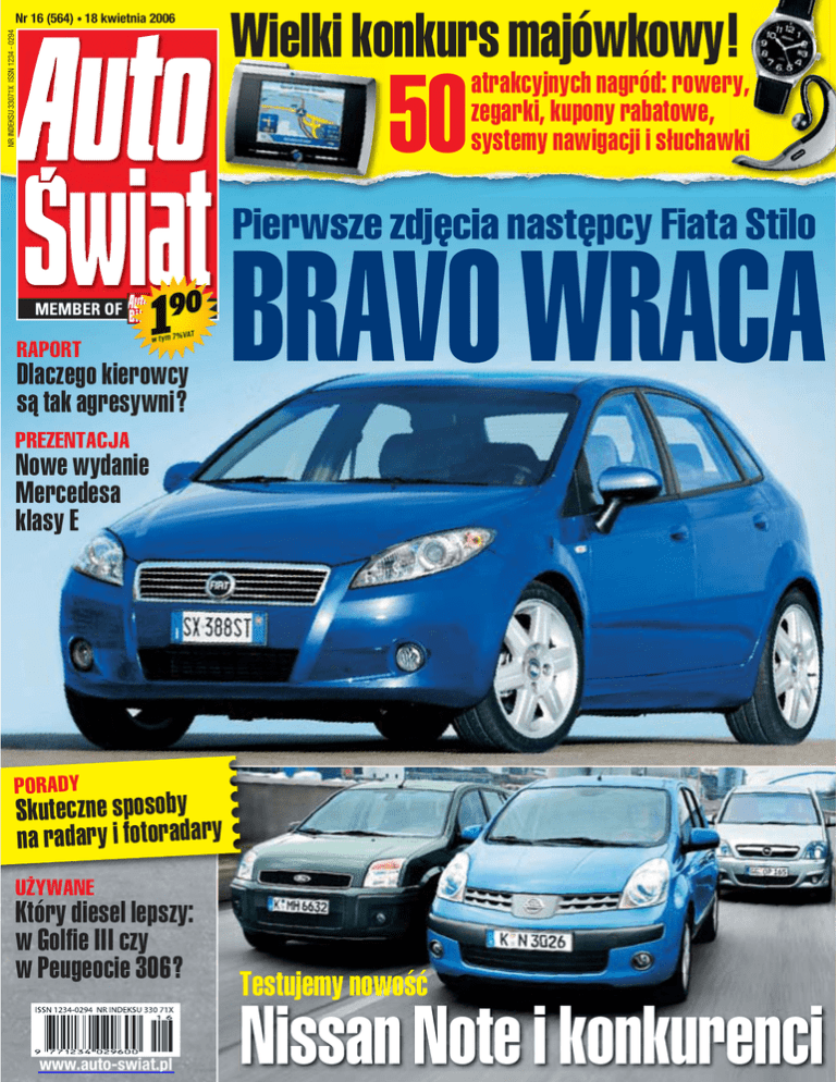 NR INDEKSU 33071X ISSN 1234 - 0294 Nr 16 (564) • 18 kwietnia 2006 Wielki konkurs majówkowy! 50 atrakcyjnych nagród: rowery, zegarki, kupony rabatowe, systemy nawigacji i słuchawki Pierwsze zdjęcia następcy Fiata Stilo RAPORT Dlaczego kierowcy są tak agresywni? BRAVO WRACA PREZENTACJA Nowe wydanie Mercedesa klasy E PORADY Skuteczne sposoby na radary i fotoradary UŻYWANE Który diesel lepszy: w Golfie III czy w Peugeocie 306? www.auto-swiat.pl Testujemy nowość Nissan Note i konkurenci NAJPOCZYTNIEJSZY TYGODNIK MOTORYZACYJNY W POLSCE W NUMERZE 16 16 18.04.06 PIERWSZE JAZDY, PREZENTACJE Fiat Bravo temat ki Następca Stilo zadebiutuje w 2007 r. z okład Naprawdę nie ma co się denerwować! 8 Porsche 911 GT3 Jeszcze szybsza „911” 10 Mercedes klasy E Face lifting mercedesowskiej klasy wyższej temat ki z okład RAPORT 12 Agresja za kierownicą Awantury drogowe – przyczyny i prewencja temat ki z okład KALEJDOSKOP 10 Subtelna modernizacja Mercedesa klasy E ma poprawić jakość i nie zwiększyć ceny 14 Informacje z kraju i z zagranicy Rośnie sprzedaż aut w Polsce. Motocykl BMW. Cadillac BLS. Stop piratom. Promocje w salonach sprzedaży 18 Wydarzenia sportowe Rajdowe mistrzostwa świata. DTM na Hockenheimie TESTY, PORÓWNANIA 20 Nissan Note, Opel Meriva, Ford Fusion Porównanie 3 vanów na bazie małych aut 24 Kia Sportage 2.0 CRDi Escape Limited temat ki z okład Nowy zastrzyk energii dla Sportage’a 26 Dacia Logan 1.5 dCi Lauréate Duże auto z nowoczesnym dieslem za niewielką cenę PORADY Auto za 7 mln euro? Za taką sumę kupiono podczas targów w Essen Mercedesa SSK 30 Radary Co warto wiedzieć o radarach? Na której stronie znajdziesz tę markę? 34 Gorąca linia 36 Jak jeździć bezpiecznie? Zadbaj o opony 37 Interwencje UŻYWANE 46 48 Toyota Urban Cruiser: nowy okaz w miejskiej dżungli 38 Porównanie VW Golfa III i Peugeota 306 Kompakty z lat 90. z silnikami Diesla temat ki z okład BMW .........................14 Cadillac .....................16 Dacia .........................26 Fiat .............................6 Ford .................... 20, 42 Kia ............................24 Mercedes ............ 10, 16 Mitsubishi .................17 Nissan .......................20 Opel ..........................20 Peugeot .....................38 Porsche ......................8 Renault ......................16 Rolls Royce ................17 Toyota .......................48 Volkswagen ...............38 42 Ford Mondeo (2000-03) Klasa średnia udana, ale nie pozbawiona wad 44 Skrzynia manualna Porady eksploatacyjne 46 Legendy motoryzacji: Techno Classica Essen Gwiazdy targów oldtimerów w Essen Stanis∏aw Sewastianowicz STUDIO PROJEKTÓW 48 Toyota Urban Cruiser NAJWAŻNIEJSZE WYDARZENIA TYGODNIA Designerskie auto miejskie POZYCJE STA¸E, ROZRYWKA 14 Listy 28 Majówka z „Auto Światem” Nowy konkurs z atrakcyjnymi nagrodami 50 Krzyżówka Skąd w nas tyle agresji? Czy kierowcy swoim zachowaniem na drogach dorównają chuliganom na piłkarskich stadionach? Są przykłady, które to potwierdzają. Regularne bójki na skrzyżowaniach, umyślne stłuczki, wygrażanie, krzyki, wrzaski i wulgaryzmy za kierownicą. Z czego to wszystko wynika? Można to uzasadnić na wiele sposobów, ale jak zmienić? Z tym jest już znacznie trudniej. O narastającej agresji na naszych drogach piszemy na str. 12-13. I niestety nic nie wskazuje na to, że będzie jej coraz mniej. Oto bowiem z dnia na dzień rosną ceny benzyny. Wynika to głównie z tego, że paliwa drożeją na całym świecie. U nas mamy na razie obniżoną akcyzę na benzynę, ale już zapowiada się jej podwyżkę. Wśród powodów agresji wymienia się także zły stan dróg w Polsce! Nawet najbardziej spokojnego człowieka może mocno zdenerwować podróż dowolną polską trasą o randze międzynarodowej. Z jaką ulgą wjeżdżamy na kawałek autostrady czy nawet zwykłej dwupasmówki. Ale nie ma co liczyć, że nagle przybędą setki kilometrów dróg z prawdziwego zdarzenia. Na razie nie wiadomo dokładnie, w jakim systemie mają być budowane – przez państwo czy systemem koncesjonariuszy. Z jednym z nich rząd chce zerwać umowę podpisaną za poprzedniej władzy. Można przypuszczać, że nie będzie to ani proste, ani tanie. Może zamiast trzymać sytuację w zawieszeniu, należałoby dać szansę, by ów koncesjonariusz zaczął coś budować. A państwo ma tyle innych dróg i autostrad do zbudowania, że wystarczy mu roboty na kilkadziesiąt lat. Dla ukojenia nerwów proponujemy naszym Czytelnikom majówkowy konkurs z atrakcyjnymi nagrodami (str. 28). 44 Jakich zasad przestrzegać, żeby skrzynia biegów działała bez zgrzytów jak najdłużej? 20.04 Polska premiera Jeepa Commandera 20-21.04 Pierwsze jazdy Fordami Galaxy i S-Maxem 23.04 Formuła 1 – Grand Prix San Marino 18 kwietnia 2006 • Nr 16 | AUTO ŚWIAT 3 LISTY Czytelnicy piszą… Opinie i uwagi 02-222 Warszawa Al. Jerozolimskie 181 (22) 608 41 30 (22) 608 41 31 [email protected] Saab 9-3 SportKombi miał 150-konny silnik wysokoprężny www.auto-swiat.pl Przydatne pomysły Chciałbym pochwalić „Auto Świat” za katalog „Samochody używane” oraz dodatek „Market” . To bardzo pomocne publikacje. W „Markecie” są jednocześnie informacje o cenach nowych aut i pojazdów z „drugiej ręki” – to przydatne źródło zarówno dla kupujących, jak i dla tych, którzy chcą być na bieżąco. Jeżeli chodzi o katalog „Samochody używane 2006”, to doskonała lektura przybliżająca wady i zalety aut używanych. Te informacje pozwalają obiektywnie ocenić dany samo- chód. Również ukazują fachowość zespołu tworzącego „Auto Świat”. Marcin K. z Sanoka Nie można uogólniać Reprezentuję firmę VW Bursiak z Łodzi – autoryzowany diler VW. Prowadzimy sprzedaż nowych VW oraz zajmujemy się obrotem na rynku wtórnym wszystkich marek. Jest nam przykro, że klient nabył złych doświadczeń w jednym z łódzkich salonów i odnosi 
