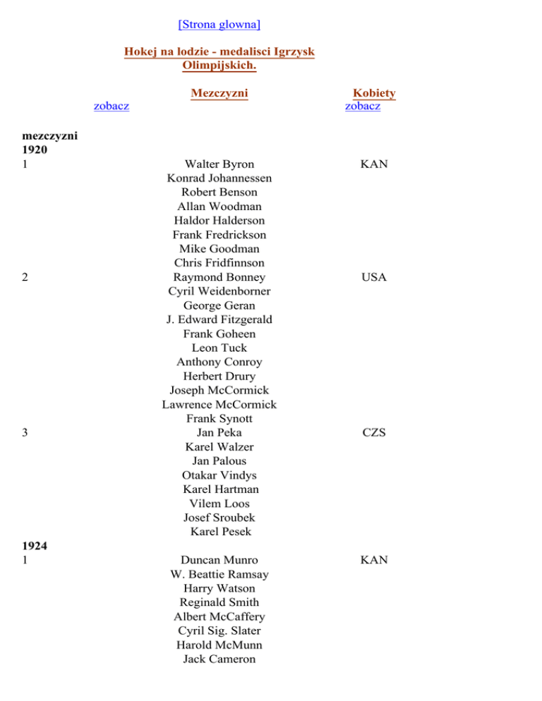 [Strona glowna] Hokej na lodzie - medalisci Igrzysk Olimpijskich. Mezczyzni Kobiety zobacz Walter Byron Konrad Johannessen Robert Benson Allan Woodman Haldor Halderson Frank Fredrickson Mike Goodman Chris Fridfinnson Raymond Bonney Cyril Weidenborner George Geran J. Edward Fitzgerald Frank Goheen Leon Tuck Anthony Conroy Herbert Drury Joseph McCormick Lawrence McCormick Frank Synott Jan Peka Karel Walzer Jan Palous Otakar Vindys Karel Hartman Vilem Loos Josef Sroubek Karel Pesek KAN Duncan Munro W. Beattie Ramsay Harry Watson Reginald Smith Albert McCaffery Cyril Sig. Slater Harold McMunn Jack Cameron KAN zobacz mezczyzni 1920 1 2 3 1924 1 USA CZS 2 3 1928 1 2 3 Ernest Collett Alphonse Lacroix Irving Small Clarence Abel Herbert Drury Justin McCarthy Willard Rice John Lyons Frank Synott John A. Langley Colin Carruthers Eric Carruthers Ross Cuthbert Edward Pitblado Hamilton Jukes W.H. Anderson Lorne Carr-Harris Blane Sexton George Holmes Guy Clarkson Joseph Sullivan Ross Taylor John Porter Louis Hudson David Trottier Norbert Mueller Hugh Plaxton Frank Sullivan Frank Fisher Herbert Plaxton Roger Plaxton Charles Delahay Nils Johansson Kurt Scksdorff Carl Abrahamsson Henry Johansson Emil Bergman Wilhelm Petersen Gustaf Johansson Birger Holmqvist Sigurd Oberg Ernst Karlberg Bertil Linde Erik Larsson Arnold Martignoni USA WBR KAN SWE SWA Charles Fasel Mezzi Andreossi Giannin Andreossi Robert Breiter Richard Torriani Luzius Ruedi Albert Geromini Fritz Kraatz Heini Meng Anton Morosani Louis Dufour 1932 1 2 3 William Cockburn Hugh Sutherland Roy Hinkel Walter Monson Victor Lindquist Romeo Rivers Harold Simpson Norman Malloy Aliston Wise Clifford Crowley Albert Duncanson George Garbutt Kenneth Moore Stanley Wagner Franklin Farrell John Garrison Osborn Anderson John Chase Douglas Everett Winthrop Palmer John Bent John Cookman Joseph Fitzgerald Edward Frazier Gereard Hallock Robert Livingston Francis Nelson Gordon Smith Walter Leinweber Alfred Heinrich Erich Romer Rudi Ball Martin Schrottle Gustav Jaenecke KAN USA NIEM Erich Herker Werner Korff Marquardt Slevogt Georg Strobl 1936 1 2 3 1948 1 James Foster Carl Erhardt Gordon Dailley Archibald Stinchcombe Edgar Brenchley John Coward James Chappell Alexander Archer Gerry Davey James Borland Robert Wyman John Kilpatrick Francis Moore Arthur Nash Herman Murray Walter Kitchen Raymond Milton David Neville Kenneth Farmer-Horn Hugh Farquharson Maxwell Deacon Alexander Sinclair William Thomson James Haggarty Ralph Saint Germain Thomas Moone Francis Shaugnessy Philip LaBatte Frank Stubbs John Garrison Paul Rowe John Lax Gordon Smith Elbridge Ross Francis Spain August Kammer WBR Murray Dowey Bernard Dunster John Lecompte Henri-Andre Laperriere KAN KAN USA 2 3 1952 1 Walter Halder George Mara Reginald Schroeter Thomas Hibberd Albert Renaud Jean Orval Gravelle Patrick Guzzo Irving Taylor Bohumil Modry Zdenek Jarkovsky Miroslav Slama Josef Trousilek Premysl Hajny Vilibald Stovik Oldrich Zabrodsky Miloslav Pokorny Ladislav Trojak Vladimir Zabrodsky Stanislav Konopasek Vaclav Rozinak Jaroslav Drobny Karel Stibor Gustav Bubnik Vladimir Bouzek Vladimir Kobranov Hand Banninger Reto Perl Emil Handschin Ferdinand Dattini Hand Sattini Heinrich Boller Hans Durst Walter Durst Richard Torriani Gebhard Poltera Ulrich Poltera Hans Trepp Beat Ruedi Alfred Bieler Heini Lohrer Werner Lohrer Otto Schubiger Eric Paterson Ralph Hansch John Davies CZS SWA KAN 2 3 1956 Robert Meyers Allen Purvis William Dawe Donald Gauf Robert Watt George Abel Bruce Dickson David Miller Francis Sullivan Louis Secco William Gibson Gordon Robertson Thomas Pollock Richard Desmond Donald Whiston Allen Van Joseph Czarnota Robert Rompre Gerald Kilmartin Kenneth Yackel Leonard Ceglarski Ruben Bjorkman John Noah Andre Gambucci James Sedin Clifford Harrison Arnold Oss John Mulhern Thord Flodqvist Lars Svensson Ake Andersson Rune Johansson Sven Thunman Gote Almqvist Lars Bjorn Ake Lassas Gote Blomqvist Gosta Johansson Erik Johansson Stig Tvilling Hans Tvilling Lars Pettersson Hans Oberg Sven Johansson Holger Nurmela USA SWE 1 2 3 Jewgenij Babicz Wsiewolod Bobrow Nikolaj Chlystow Aleksiej Guryszew Jurij Krylow Alfred Kuchewski Walentin Kuzin Grigory Mkrtyczan Wiktor Nikiforow Jurij Pantiuchow Nikolai Puczkow Wiktor Szuwalow Genrich Sidorenkow Nikolai Sologubow Iwan Tregubow Dmitrij Ukolow Aleksandr Uvarov Willard Ikola Donald Rigazio Richard Rodenheiser Daniel McKinnon Edward Sampson John Matchefts Richard Meredith Richard Dougherty Kenneth Purpur John Mayasich William Cleary Wellington Burnett Wendell Anderson Eugene Campbell Gordon Christian Weldon Olson John Petroske Denis Brodeur Keith Woodall Floyd Martin Howard Lee Arthur Hurst John McKenzie James Logan Paul Knox Donald Rope Byrle Klinck William Colvin Gerald Theberge ZSRR USA KAN Alfred Horne Charles Brooker George Scholes Robert White Kenneth Laufman 1960 1 2 3 John McCartan Laurence Palmer Robert Owen John Kirrane John Mayasich Rodney Paavola Richard Rodenheiser Paul Johnson Weldon Olson Roger Christian William Christian Thomas Williams Eugene Grazia Richard Meredith William Cleary Robert Cleary Robert McVey Harold Hurley Donald Head Harry Sinden John Douglas Darryl Sly Maurice Benoit George Samolenko Robert Attersely Fred Etcher Clifford Pennington Robert Forhan Robert McKnight Floyd Martin Kenneth Laufman Donald Rope James Connelly Robert Rousseau Weniamin Aleksandrow Aleksander Alimetow Jurij Baulin Michail Byczkow Wladmir Grobiennikow Jewgenij Groszew USA KAN ZSRR Wiktor Jakuszew Jevgenij Jorkin Nikolaj Karpow Alfred Kuczewski Konstantin Loktiew Stanislaw Pietuchow Wiktor Prjaznikow Nikolaj Puczkow Genrich Sidorenkow Nikolaj Sologubow Jurij Cicinow 1964 1 2 3 Weniamin Aleksandrow Aleksander Alimetow Witalij Dawydow Anatolij Firsow Eduard Iwanow Wiktor Konowalenko Wiktor Kuzkin Konstantin Loktiew Borys Majorow Jewgenij Majorow Stanislaw Pietuchow Aleksander Ragulin Wiaczeslaw Starszinow Leonid Wolkoq Wiktor Jakuszew Borys Zajcew Kjell Svensson Lennar