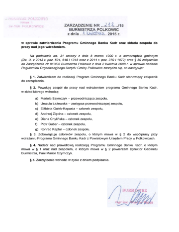 w sprawie zatwierdzenia Programu Gminnego Banku Kadr oraz składu zespołu do pracy nad jego wdrożeniem. Na podstawie art. 31 ustawy z dnia 8 marca 1990 r. o samorządzie gminnym (Dz. U. z 2013 r. poz. 594, 645 i 1318 oraz z 2014 r. poz. 379 i 1072) oraz § 59 załącznika do Zarządzenia Nr 910/08 Burmistrza Polkowic z dnia 2 kwietnia 2008 r. w sprawie nadania Regulaminu Organizacyjnego Urzędu Gminy Polkowice zarządza się, co następuje: § 1. Zatwierdzam do realizacji Program Gminnego Banku Kadr stanowiący załącznik do zarządzenia. § 2. Powołuję zespół do pracy nad wdrożeniem programu Gminnego Banku Kadr, w skład którego wchodzą: a) Mariola Szymczyk – przewodnicząca zespołu, b) Urszula Łażewska – zastępca przewodniczącej zespołu, c) Elżbieta Gałek-Kapusta – członek zespołu, d) Andrzej Zięcina – członek zespołu, e) Diana Chylińska – członek zespołu, f) Piotr Gubar – członek zespołu, g) Konrad Kaptur – członek zespołu. § 3. Zobowiązuję członków zespołu, o którym mowa w § 2 do współpracy przy wdrażaniu Programu Gminnego Banku Kadr z Powiatowym Urzędem Pracy w Polkowicach. § 4. Nadzór nad prawidłową realizacją Programu Gminnego Banku Kadr, o którym mowa w § 1 oraz nad zespołem, o którym mowa w § 2 powierzam Dyrektor Gabinetu Burmistrza, Pani Marioli Szymczyk. § 5. Zarządzenie wchodzi w życie z dniem podpisania. Polkowice, marzec 2015 r. Strona 1 z 23 I. Wprowadzenie Gminny Bank Kadr (GBK), to zbudowany od podstaw projekt społeczny polkowickiego samorządu. Powstał on w reakcji na ważne zapotrzebowanie lokalnej wspólnoty związane z uwarunkowaniami rynku pracy, które w konsekwencji mają wielki wpływ na standard codziennego życia mieszkańców. Władze Polkowic od kilkunastu lat wspierają Fundusz Pracy przekazując znaczne środki finansowe na aktywizację bezrobotnych mieszkańców gminy, pozyskują nowych inwestorów, realizują unijne projekty wspierające drobną przedsiębiorczość oraz inicjują szereg innych działań mających na celu zwiększanie zatrudnienia w gminie Polkowice. Dzięki temu stopa bezrobocia w powiecie od lat utrzymuje się na stosunkowo niskim i stabilnym poziomie, podobnie jak liczba zarejestrowanych bezrobotnych mieszkańców gminy. Analiza lokalnego rynku pracy wskazuje jednak na dość istotne zmiany w strukturze grupy osób bezrobotnych oraz populacji ogółem. Zaobserwowane zmiany i trendy już obecnie zaczynają znacząco oddziaływać na lokalny rynek pracy, generując zapotrzebowanie na nowe i skuteczne działania na rzecz zwiększenia zatrudnienia. Pozwalają na zdefiniowanie grup docelowych, którym należy zapewnić wsparcie w pierwszej kolejności, jak również umożliwiają dobór odpowiednich narzędzi i instrumentów, zarówno tych finansowych, jak również informacyjnych, szkoleniowych i organizacyjnych. Gminny Bank Kadr jest zatem odpowiedzią na nowe potrzeby rynku pracy w gminie Polkowice i powstał w wyniku przekonania, że rozwiązywanie problemów społecznych powinno wiązać się z aktywnością, poszukiwaniem rozwiązań, przełamywaniem rutyny, jak również zwiększaniem przejrzystości podejmowanych działań. II. Diagnoza Stopa bezrobocia w powiecie polkowickim wynosi 7,9% i należy do najniższych nie tylko w województwie dolnośląskim (11,6%), ale również w całym kraju (11,5%). Niższym wskaźnikiem mogą się pochwalić jedynie duże ośrodki miejskie i powiaty wokół nich zlokalizowane. Na obszarze Dolnego Śląska są to powiat wrocławski (5,3%) oraz miasto Wrocław (5,5%). Niskie bezrobocie w powiecie polkowickim związane jest z silnym uprzemysłowieniem regionu, na obszarze którego zlokalizowane są zakłady pracy KGHM Polska Miedź S.A. oraz wielu znaczących polskich i zagranicznych inwestorów działających w polkowickiej podstrefie Legnickiej Specjalnej Strefy Ekonomicznej. Potwierdzają to statystyki, zgodnie z którymi aż 66,9% pracujących znajduje zatrudnienie w przemyśle i budownictwie, podczas gdy w województwie dolnośląskim wyżej wymieniona branża stanowi 32,61% ogółu pracujących, a w całym kraju zaledwie 26,99%. Oznacza to silne uzależnienie lokalnego rynku pracy od dużego przemysłu oraz marginalizację pozostałych branż, szczególnie usług, w których udział osób pracujących znajduje się w końcowej części zestawienia dla województwa dolnośląskiego, a w niektórych przypadkach nawet na jego najniższym poziomie, znacznie poniżej średniej, także krajowej. Kompleksową diagnozę sytuacji na lokalnym rynku pracy zawiera Program Działań na Rzecz Zatrudniania Mieszkańców Gminy Polkowice na lata 2011-2015 stanowiący załącznik do Zarządzenia nr 2124/14 Burmistrza Polkowic z dnia 30 kwietnia 2014 r. W Programie Gminnego Banku Kadr Strona 2 z 23 ograniczono się zatem do zbadania trendów i zmian na rynku pracy, których zminimalizowanie pozwoli obecnie i w przyszłości na utrzymanie, a nawet zwiększenie poziomu zatrudnienia w gminie oraz umożliwi określenie celów Gminnego Banku Kadr, trafny dobór grup docelowych, do których kierowane będzie wsparcie, jak również narzędzi, którymi winien dysponować, aby skutecznie realizować swoje zadania. Wykorzystano następujące opracowania i dane statystyczne, które posłużyły do samodzielnej analizy: Rocznik statystyczny województw 2013 - wybrane dane o powiatach (NTS 4) w 2013 r.; Dolnośląska Strategia Integracji Społecznej na lata 2014-2020; Zestawienie informacyjne o osobach z Lokalnej Bazy Danych Urzędu Gminy Polkowice na dzień 31.12.2014 r.; Sprawozdania z działalności Powiatowego Urzędu Pracy w Polkowicach za lata 2011-2013; Wybrane informatory miesięczne Powiatowego Urzędu Pracy w Polkowicach za lata 2011-2013; Informacje dedykowane dla gminy Polkowice opracowane przez Powiatowy Urząd Pracy w Polkowicach; Informacje dedykowane dla gminy Polkowice opracowane przez Dolnośląską Wyższą Szkołę Przedsiębiorczości 