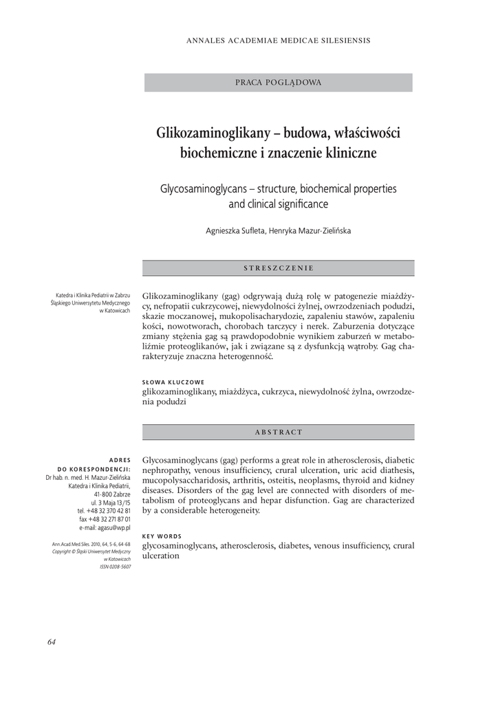 ANNALES ACADEMIAE MEDICAE SILESIENSIS PRACA POGLĄDOWA Glikozaminoglikany – budowa, właściwości biochemiczne i znaczenie kliniczne Glycosaminoglycans – structure, biochemical properties and clinical significance Agnieszka Sufleta, Henryka Mazur-Zielińska STRESZCZENIE Katedra i Klinika Pediatrii w Zabrzu Śląskiego Uniwersytetu Medycznego w Katowicach Glikozaminoglikany (gag) odgrywają dużą rolę w patogenezie miażdżycy, nefropatii cukrzycowej, niewydolności żylnej, owrzodzeniach podudzi, skazie moczanowej, mukopolisacharydozie, zapaleniu stawów, zapaleniu kości, nowotworach, chorobach tarczycy i nerek. Zaburzenia dotyczące zmiany stężenia gag są prawdopodobnie wynikiem zaburzeń w metaboliźmie proteoglikanów, jak i związane są z dysfunkcją wątroby. Gag charakteryzuje znaczna heterogenność. S Ł O WA K L U C Z O W E glikozaminoglikany, miażdżyca, cukrzyca, niewydolność żylna, owrzodzenia podudzi A B S T R AC T ADRES D O KO R E S P O N D E N C J I : Dr hab. n. med. H. Mazur-Zielińska Katedra i Klinika Pediatrii, 41-800 Zabrze ul. 3 Maja 13/15 tel. +48 32 370 42 81 fax +48 32 271 87 01 e-mail: [email protected] Glycosaminoglycans (gag) performs a great role in atherosclerosis, diabetic nephropathy, venous insufficiency, crural ulceration, uric acid diathesis, mucopolysaccharidosis, arthritis, osteitis, neoplasms, thyroid and kidney diseases. Disorders of the gag level are connected with disorders of metabolism of proteoglycans and hepar disfunction. Gag are characterized by a considerable heterogeneity. KEY WORDS Ann.Acad.Med.Siles. 2010, 64, 5-6, 64-68 Copyright © Śląski Uniwersytet Medyczny w Katowicach ISSN 0208-5607 64 glycosaminoglycans, atherosclerosis, diabetes, venous insufficiency, crural ulceration GLIKOZAMINOGLIKANY – BUDOWA, WàAĝCIWOĝCI BIOCHEMICZNE I ZNACZENIE KLINICZNE WSTĘP Glikozoaminoglikany (GAG) to różnorodna grupa heteropolisacharydów występująca w organizmach, specyficznie (kowalencyjnie) połączona z białkami jako proteoglikany lub niespecyficznie oddziałująca z innymi proteinami i peptydami. GAG są naturalnymi składnikami ścian naczyń krwionośnych; w żyłach dominuje siarczan dermatanu, a w tętnicach siarczan chondroityny. Glikozaminoglikany znajdują się również w płucach, błonie śluzowej jelit, wątrobie, nerkach i tkance nerwowej. Proteoglikany (PG) są heterogenną grupą glikoprotein, w cząsteczkach których dominuje komponent cukrowy nad białkowym. Ilość składnika cukrowego, przypadającego na łańcuch polipeptydowy w proteoglikanach jest znacznie większa niż w innych glikoproteinach, dla niektórych PG sięga bowiem 95% ich całkowitej masy. Cząsteczki PG zbudowane są z centralnie położonego łańcucha polipeptydowego zwanego rdzeniem białkowym lub białkiem rdzeniowym, do którego wiązaniem O- i/lub N- glikozydowym przyłączone są łańcuchy glikozoaminoglikanowe (GAG) oraz inne oligosacharydy [1, 2, 3]. Proteoglikany występują głównie pozakomórkowo, tworząc komponenty macierzy zewnątrzkomórkowej (ECM), jak również występują w obrębie komórek. PG wewnątrzkomórkowe znajdują się w ziarnistościach wydzielniczych oraz na błonach komórkowych, gdzie spełniają rolę receptorów lub koreceptorów, między innymi dla czynników wzrostowych [4]. Silnie ujemny ładunek łańcuchów glikanowych sprawia, że proteoglikany biorą udział w selektywnej przepuszczalności błon komórkowych i regulują stopień uwodnienia tkanek. Zabezpieczają strukturę i właściwości mechaniczne substancji międzykomórkowej tkanki łącznej, poprzez interakcje z białkami włókienkowymi np. kolagenem i elastyną. Wykazano również ich wpływ na szereg procesów metabolicznych, takich jak: kalcyfikacja kości i krzepnięcie krwi [2, 5]. PG oddziałując z komórkami, promują i regulują ich swoiste funkcje, takie jak: adhezja, migracja, proliferacja, wzrost, różnicowanie oraz morfogeneza. Wiele badań potwierdziło udział zarówno GAG, jak i proteoglikanów ściany naczyniowej w patogenezie miażdżycy, w której istotną rolę odgrywają procesy zapalne oraz uszkodzenie śródbłonka naczyniowego [6]. W różnych stanach choro- bowych, w których dochodzi do przebudowy tkanki, zachodzą równolegle zmiany w składzie i rozmieszczeniu proteoglikanów [7, 8]. Ze względu na fakt, że GAG zmieniają właściwości ściany naczyniowej oraz wykazują istotny wpływ na układ krzepnięcia, mają zastosowanie w leczeniu owrzodzeń, nefropatii cukrzycowej i wielu innych schorzeń [9, 10]. Klinicznie GAG znajdują zastosowanie w zapobieganiu zaburzeń zatorowo-zakrzepowych [11, 12, 13]. B U D O WA I M E TA B O L I Z M G L I KO Z OA M I N O G L I K A N Ó W Glikozoaminoglikany (GAG) są to długie, nierozgałęzione, ujemnie naładowane łańcuchy polisacharydowe, złożone z powtarzających się naprzemiennie podjednostek disacharydowych. Podjednostki te składają się z reszt N-acetylowanej heksozoaminy: D-glukozoaminy (GlcNAc) lub D-galaktozoaminy (GalNAc) albo N-siarczanowanej D-glukozoaminy oraz reszt kwasu heksuronowego: D-glukuronowego (GlcUA) lub D-iduronowego (IdUA) albo galaktozy [2]. W niektórych GAG wykazano również obecność reszt L-frukozy, D-mannozy, D-ksylozy i kwasu N-acetyloneuraminowego [4]. Kwas hialuronowy w odróżnieniu od pozostałych GAG nie tworzy kowalencyjnych połączeń z białkami, ale oddziałuje niekowalencyjnie z wieloma różnymi cząsteczkami [14]. Obecność w cząsteczkach GAG licznych grup siarczanowych i karboksylowych przyczynia się do wysoce ujemnego ładunku łańcucha polisacharydowego, dlatego wiążą one duże ilości wody i kationów (K+, Na+), nadając tkankom odpowiednie napięcie [10]. GAG inne niż hialuronian syntetyzowane są bezpośrednio na białku rdzeniowym jako proteoglikany. Rdzeń białkowy proteoglikanów syntetyzowany jest na rybosomach, a następnie transportowany jest do retikulum endoplazmatycznego, potem wędruje d