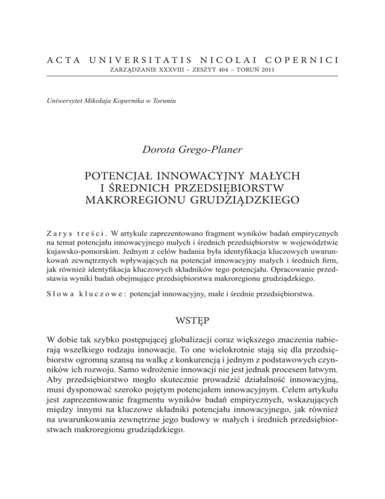 AC TA U N I V E R S I TAT I S N I C O L A I C O P E R N I C I ZARZĄDZANIE XXXVIII – ZESZYT 404 – TORUŃ 2011 Uniwersytet Mikołaja Kopernika w Toruniu Dorota Grego-Planer potencjał innowacyjny małych i średnich przedsiębiorstw makroregionu grudziądzkiego Z a r y s t r e ś c i . W artykule zaprezentowano fragment wyników badań empirycznych na temat potencjału innowacyjnego małych i średnich przedsiębiorstw w województwie kujawsko-pomorskim. Jednym z celów badania była identyfikacja kluczowych uwarunkowań zewnętrznych wpływających na potencjał innowacyjny małych i średnich firm, jak również identyfikacja kluczowych składników tego potencjału. Opracowanie przedstawia wyniki badań obejmujące przedsiębiorstwa makroregionu grudziądzkiego. S ł o w a k l u c z o w e : potencjał innowacyjny, małe i średnie przedsiębiorstwa. Wstęp W dobie tak szybko postępującej globalizacji coraz większego znaczenia nabierają wszelkiego rodzaju innowacje. To one wielokrotnie stają się dla przedsiębiorstw ogromną szansą na walkę z konkurencją i jednym z podstawowych czynników ich rozwoju. Samo wdrożenie innowacji nie jest jednak procesem łatwym. Aby przedsiębiorstwo mogło skutecznie prowadzić działalność innowacyjną, musi dysponować szeroko pojętym potencjałem innowacyjnym. Celem artykułu jest zaprezentowanie fragmentu wyników badań empirycznych, wskazujących między innymi na kluczowe składniki potencjału innowacyjnego, jak również na uwarunkowania zewnętrzne jego budowy w małych i średnich przedsiębiorstwach makroregionu grudziądzkiego. 32 Dorota Grego-Planer 1. Potencjał innowacyjny w świetle teorii W literaturze przedmiotu można spotkać wiele definicji potencjału innowacyjnego przedsiębiorstw. Począwszy od tych, które definiują go bardzo wąsko, kończąc na ujęciach bardzo szerokich. W artykule zaprezentowano kilka wybranych ujęć potencjału innowacyjnego. Jedno z nich proponuje K. Poznańska, zdaniem której potencjał innowacyjny przedsiębiorstwa to jego zdolność do efektywnego wprowadzania innowacji, czyli nowych produktów, nowych technologii, metod organizacyjnych i innowacji marketingowych otoczenia. Tak określany potencjał kształtowany jest przez cztery kluczowe elementy (Poznańska, 1998, s. 40): 1) potencjał finansowy, 2) potencjał ludzki, 3) potencjał rzeczowy, 4) wiedzę. Potencjał finansowy to głównie własne środki finansowe oraz środki oferowane przez różnego rodzaju instytucje finansowe i pozafinansowe, działające w regionie funkcjonowania przedsiębiorstwa. Potencjał ludzki natomiast, to przede wszystkim liczba zatrudnionych pracowników i ich struktura oraz posiadane przez nich kwalifikacje i umiejętności. Do potencjału rzeczowego należy zaliczyć strukturę aparatu produkcyjnego wraz z jego elastycznością, czyli możliwością szybkiego dostosowania produkcji do zmieniających się potrzeb na rynku. Należy również tu uwzględnić wiek i poziom mechanizacji oraz automatyzacji parku maszynowego. Ostatnim z elementów potencjału innowacyjnego jest wiedza. Tu należy skupić się przede wszystkim na wiedzy technicznej oraz na płynących z rynku informacji. Poznańska podkreśla ogromną rolę otoczenia, które w bardzo istotny sposób wpływa na elementy składowe potencjału innowacyjnego. Oddziaływanie tego otoczenia pozwala na wyróżnienie zewnętrznego i wewnętrznego potencjału innowacyjnego przedsiębiorstwa (Poznańska, 1998, s. 41). Przez wewnętrzny potencjał innowacyjny Poznańska rozumie zasoby i umiejętności, jakimi dysponuje przedsiębiorstwo, które mogą zostać wykorzystane w bieżącej działalności innowacyjnej. Zadaniem przedsiębiorstwa w tym obszarze jest gromadzenia zasobów rzeczowych, zbieranie informacji dotyczących najnowszych trendów rozwoju technologicznego, wartościowanie informacji oraz podejmowanie decyzji w poszczególnych obszarach działalności przedsiębiorstwa, takich jak finanse, marketing, produkcja i rozwój produktowy. Bardzo duży wpływ na działalność innowacyjną firmy wywierają również czynniki kreowane przez region, w którym ono funkcjonuje. Czynniki te Potencjał innowacyjny małych i średnich przedsiębiorstw… 33 to głównie: rynek pracy, zasoby wiedzy technicznej i informacji naukowej oraz gotowość instytucji do finansowania działalności obarczonej dużym stopniem ryzyka. Zatem sytuacja zewnętrzna przedsiębiorstwa będzie rozumiana jako zewnętrzny potencjał innowacyjny przedsiębiorstwa (Poznańska, 1998, s. 41). W podobny sposób potencjał innowacyjny przedstawiany jest przez A. Żołnierskiego, który uważa, iż jest on determinowany przez wewnętrzny potencjał innowacyjny oraz dostęp do zewnętrznych źródeł innowacji. Na wewnętrzny potencjał innowacyjny składa się (Żołnierski, 2005, s. 5‒6): 1) kadra (jej wiedza i doświadczenie, umiejętności i kwalifikacje oraz sposób zarządzania dostępnymi zasobami, zarządzanie informacją), 2) badania i rozwój (wyodrębnione komórki B+R, prowadzone prace B+R, prace zlecane itp.), 3) technologia (komputery i technologia ICT1, maszyny i urządzenia, a także stopień nowoczesności maszyn i urządzeń). Zewnętrzne źródła innowacji to przede wszystkim wyższe uczelnie i jednostki badawczo-rozwojowe, ale także firmy konkurencyjne czy odbiorcy i dostawcy. Uwarunkowania makroekonomiczne: ekonomiczne polityczno-prawne socjokulturowe i demograficzne Uwarunkowania otoczenia sektorowego MSP Innowacje: Uwarunkowania wewnętrzne Sfery funkcjonalnozasobowe – produktowe Potencjał innowacyjny Proces innowacyjny – procesowe – rynkowe – organizacyjne geograficzne techniczne międzynarodowe Rysunek 1. Potencjał innowacyjny i jego rola w procesie kreowania innowacji przez MSP według koncepcji M. Zastempowskiego Źródło: Zastempowski, 2010, s. 275. 1 ICT – Information and communication technologies – technologie informacjno-telekomunika