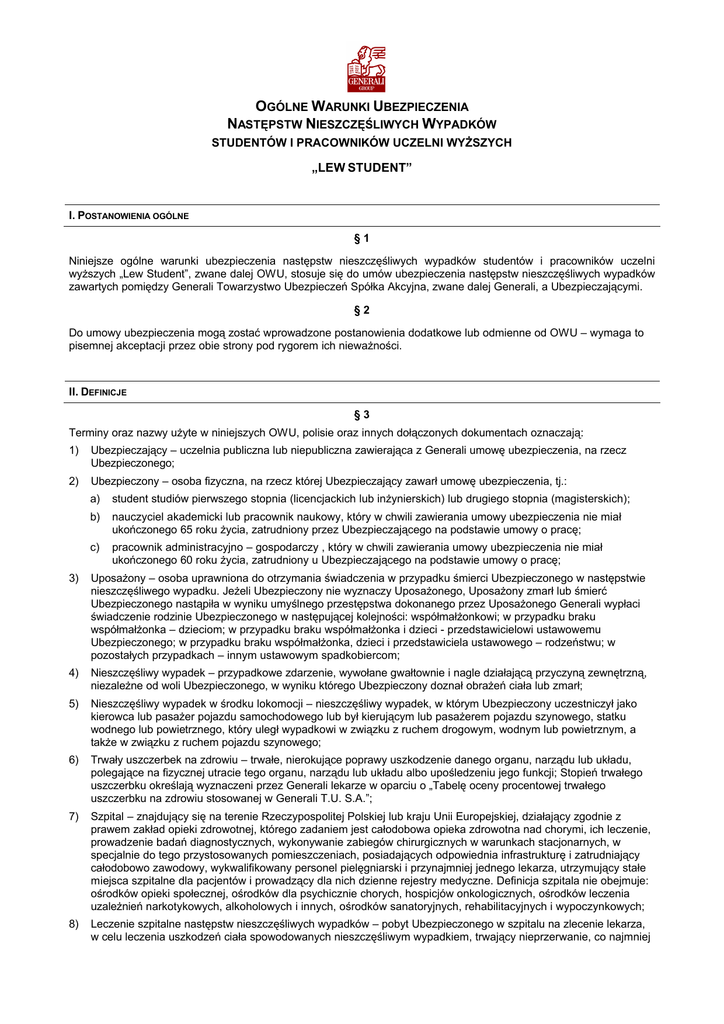 OGÓLNE WARUNKI UBEZPIECZENIA NASTĘPSTW NIESZCZĘŚLIWYCH WYPADKÓW STUDENTÓW I PRACOWNIKÓW UCZELNI WYŻSZYCH „LEW STUDENT” I. POSTANOWIENIA OGÓLNE §1 Niniejsze ogólne warunki ubezpieczenia następstw nieszczęśliwych wypadków studentów i pracowników uczelni wyższych „Lew Student”, zwane dalej OWU, stosuje się do umów ubezpieczenia następstw nieszczęśliwych wypadków zawartych pomiędzy Generali Towarzystwo Ubezpieczeń Spółka Akcyjna, zwane dalej Generali, a Ubezpieczającymi. §2 Do umowy ubezpieczenia mogą zostać wprowadzone postanowienia dodatkowe lub odmienne od OWU – wymaga to pisemnej akceptacji przez obie strony pod rygorem ich nieważności. II. DEFINICJE §3 Terminy oraz nazwy użyte w niniejszych OWU, polisie oraz innych dołączonych dokumentach oznaczają: 1) Ubezpieczający – uczelnia publiczna lub niepubliczna zawierająca z Generali umowę ubezpieczenia, na rzecz Ubezpieczonego; 2) Ubezpieczony – osoba fizyczna, na rzecz której Ubezpieczający zawarł umowę ubezpieczenia, tj.: a) student studiów pierwszego stopnia (licencjackich lub inżynierskich) lub drugiego stopnia (magisterskich); b) nauczyciel akademicki lub pracownik naukowy, który w chwili zawierania umowy ubezpieczenia nie miał ukończonego 65 roku życia, zatrudniony przez Ubezpieczającego na podstawie umowy o pracę; c) pracownik administracyjno – gospodarczy , który w chwili zawierania umowy ubezpieczenia nie miał ukończonego 60 roku życia, zatrudniony u Ubezpieczającego na podstawie umowy o pracę; 3) Uposażony – osoba uprawniona do otrzymania świadczenia w przypadku śmierci Ubezpieczonego w następstwie nieszczęśliwego wypadku. Jeżeli Ubezpieczony nie wyznaczy Uposażonego, Uposażony zmarł lub śmierć Ubezpieczonego nastąpiła w wyniku umyślnego przestępstwa dokonanego przez Uposażonego Generali wypłaci świadczenie rodzinie Ubezpieczonego w następującej kolejności: współmałżonkowi; w przypadku braku współmałżonka – dzieciom; w przypadku braku współmałżonka i dzieci - przedstawicielowi ustawowemu Ubezpieczonego; w przypadku braku współmałżonka, dzieci i przedstawiciela ustawowego – rodzeństwu; w pozostałych przypadkach – innym ustawowym spadkobiercom; 4) Nieszczęśliwy wypadek – przypadkowe zdarzenie, wywołane gwałtownie i nagle działającą przyczyną zewnętrzną, niezależne od woli Ubezpieczonego, w wyniku którego Ubezpieczony doznał obrażeń ciała lub zmarł; 5) Nieszczęśliwy wypadek w środku lokomocji – nieszczęśliwy wypadek, w którym Ubezpieczony uczestniczył jako kierowca lub pasażer pojazdu samochodowego lub był kierującym lub pasażerem pojazdu szynowego, statku wodnego lub powietrznego, który uległ wypadkowi w związku z ruchem drogowym, wodnym lub powietrznym, a także w związku z ruchem pojazdu szynowego; 6) Trwały uszczerbek na zdrowiu – trwałe, nierokujące poprawy uszkodzenie danego organu, narządu lub układu, polegające na fizycznej utracie tego organu, narządu lub układu albo upośledzeniu jego funkcji; Stopień trwałego uszczerbku określają wyznaczeni przez Generali lekarze w oparciu o „Tabelę oceny procentowej trwałego uszczerbku na zdrowiu stosowanej w Generali T.U. S.A.”; 7) Szpital – znajdujący się na terenie Rzeczypospolitej Polskiej lub kraju Unii Europejskiej, działający zgodnie z prawem zakład opieki zdrowotnej, którego zadaniem jest całodobowa opieka zdrowotna nad chorymi, ich leczenie, prowadzenie badań diagnostycznych, wykonywanie zabiegów chirurgicznych w warunkach stacjonarnych, w specjalnie do tego przystosowanych pomieszczeniach, posiadających odpowiednia infrastrukturę i zatrudniający całodobowo zawodowy, wykwalifikowany personel pielęgniarski i przynajmniej jednego lekarza, utrzymujący stałe miejsca szpitalne dla pacjentów i prowadzący dla nich dzienne rejestry medyczne. Definicja szpitala nie obejmuje: ośrodków opieki społecznej, ośrodków dla psychicznie chorych, hospicjów onkologicznych, ośrodków leczenia uzależnień narkotykowych, alkoholowych i innych, ośrodków sanatoryjnych, rehabilitacyjnych i wypoczynkowych; 8) Leczenie szpitalne następstw nieszczęśliwych wypadków – pobyt Ubezpieczonego w szpitalu na zlecenie lekarza, w celu leczenia uszkodzeń ciała spowodowanych nieszczęśliwym wypadkiem, trwający nieprzerwanie, co najmniej Ogólne warunki ubezpieczenia następstw nieszczęśliwych wypadków studentów i pracowników uczelni wyższych „Lew Student” 2 dni, służący zachowaniu, przywracaniu lub poprawie zdrowia Ubezpieczonego. Okres pobytu w szpitalu liczony jest od daty przyjęcia Ubezpieczonego do szpitala do daty jego wypisania ze szpitala; jeżeli w czasie pobytu Ubezpieczonego w szpitalu nastąpił zgon Ubezpieczonego, okres pobytu w szpitalu liczony jest do daty zgonu Ubezpieczonego; 9) Koszty leczenia na terenie RP – są to koszty poniesione przez Ubezpieczonego na terenie RP w związku z leczeniem następstw nieszczęśliwych wypadków, które nie zostały pokryte z ubezpieczenia społecznego lub z tytułu innej umowy ubezpieczenia. Do kosztów tych zalicza się: koszty wizyt lekarskich, koszty leczenia i zabiegów ambulatoryjnych, koszty niezbędnych operacji (z wyłączeniem operacji plastycznych), koszty badań zleconych przez lekarza; koszty leczenia szpitalnego; koszty transportu Ubezpieczonego z miejsca wypadku do szpitala lub ambulatorium. Termin ten nie obejmuje: kosztów zakupu lekarstw i środków opatrunkowych, kosztów naprawy lub zakupu aparatów ortodontycznych, protez stomatologicznych oraz okularów; 10) Niezdolność zawodowa – spowodowana nieszczęśliwym wypadkiem, zaistniałym w czasie trwania ochrony ubezpieczeniowej całkowita niezdolność Ubezpieczonego do wykonywania pracy zgodnie z jego kwalifikacjami, wykształceniem, doświadczeniem zawodowym, ukończonymi kursami lub posiadanymi umiejętnościami, którą mógł świadczyć na podstawie stosunku prac