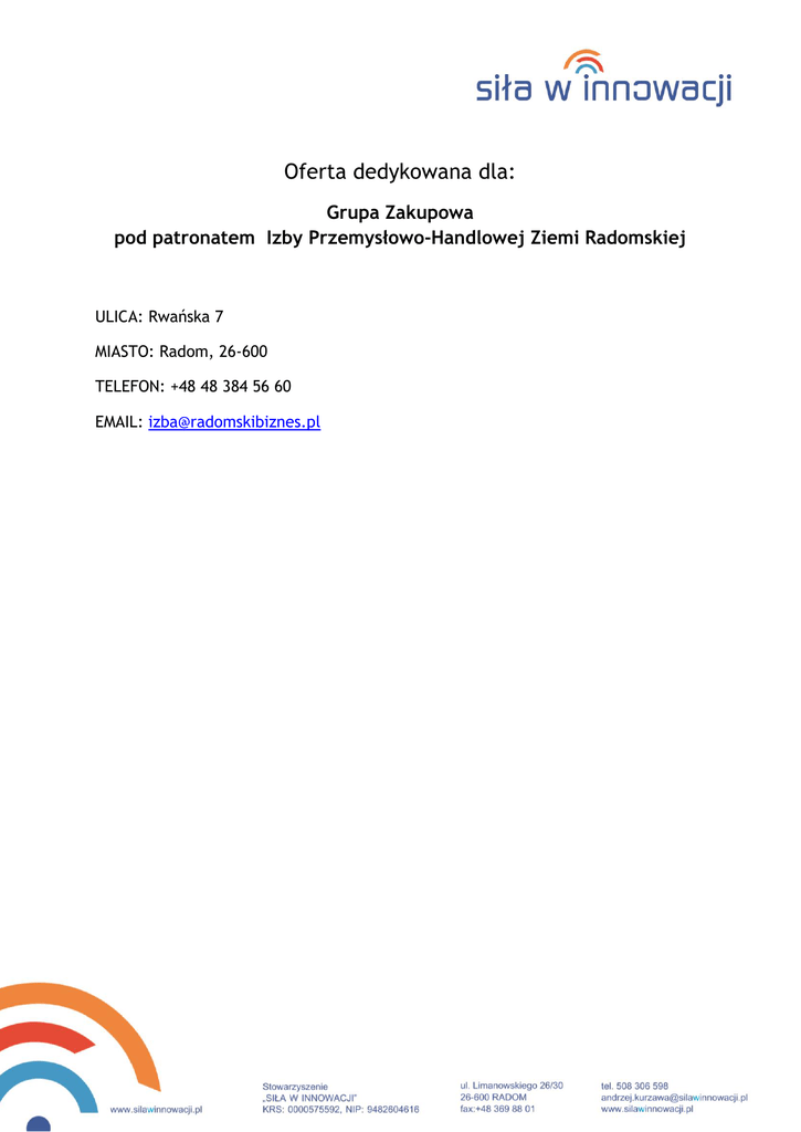 Oferta dedykowana dla: Grupa Zakupowa pod patronatem Izby Przemysłowo-Handlowej Ziemi Radomskiej ULICA: Rwańska 7 MIASTO: Radom, 26-600 TELEFON: +48 48 384 56 60 EMAIL: [email protected] Szczegóły oferty: 1. Zestaw komputerowy (poleasingowy) W skład zestawu wchodzi: 1. Poleasingowy komputer Dell Optiplex 780 w obudowie typu desktop wraz z systemem operacyjnym Windows 7 Professional, wyposażony w dwurdzeniowy procesor Intel Core2Duo 3.0 Ghz, 4GB pamięci operacyjnej DDR3, napęd DVD oraz dysk twardy o pojemności 160GB, 2. Nowy Monitor AOC z matrycą o przekątnej 21,5 cala i rozdzielczości FullHD z powłoką przeciwodblaskową i złączem VGA 3. Nowa klawiatura oraz mysz USB. Oferowany zestaw objęty jest gwarancją na okres 6 miesięcy na jednostkę główną, 36 miesięcy na monitor, 12 miesięcy na klawiaturę i mysz. Gwarancja realizowana jest w punkcie serwisowym dostawcy. Cena sugerowana oferowanego zestawu wynosi 995,00 zł netto Rabat 20% Cena zestawu po rabacie – 795,00 zł netto 2. Zestaw komputerowy – oferta limitowana W skład zestawu wchodzi: 4. Komputer Dell Optiplex 3040 w obudowie typu Mini Tower wraz z systemem operacyjnym Windows 10 Professional, wyposażony w procesor Intel Core i3 najnowszej generacji, 8GB pamięci operacyjnej oraz dysk twardy w technologii półprzewodnikowej SSD 128GB, 5. Monitor Dell z matrycą o przekątnej 23 cale i rozdzielczości FullHD, z powłoką przeciwodblaskową i cyfrowym złączem DisplayPort, 6. Klawiatura oraz mysz Dell. Oferowany zestaw objęty jest 5 letnią gwarancją producenta*, świadczoną w miejscu instalacji sprzętu, z czasem reakcji serwisu do końca następnego dnia roboczego od momentu zgłoszenia usterki. Po zdalnym zdiagnozowaniu usterki, certyfikowany technik serwisowy Dell naprawi sprzęt pod wskazanym przez użytkownika adresem. . Gwarancja obejmuje również zachowanie dysku twardego w przypadku jego awarii co chroni dodatkowo dane zawarte na nośniku przed ich niekontrolowaną utratą. Ogólnopolska infolinia serwisowa Dell jest czynna w dni robocze w godzinach 8:00-17:00 pod numerem tel. +48 22 57 95 700 *Okres gwarancji rozpoczął się z dniem produkcji sprzętu tj. 3 lipca 2016 r. Cena katalogowa oferowanego zestawu wynosi 4 978,00 zł netto Rabat specjalny 50% Cena zestawu po rabacie – 2 499,00 zł netto Oferta jest limitowana – ważna wyłącznie do wyczerpania zapadów magazynowych. 3. Notebook/Laptop W skład zestawu wchodzi: 1. Notebook Dell Vostro 3558 z matrycą o przekątnej 15,6’’ LED HD z powłoką przeciwodblaskową, z systemem operacyjnym Windows 10 Professional, wyposażony w dwurdzeniowy procesor Intel Pentium, 4GB pamięci operacyjnej, dysk twardy o pojemności 500GB, kamerę internetową z mikrofonem, baterię 4 komorową, 2. Torba przenośna, 3. Mysz bezprzewodowa. Oferowany notebook objęty jest 3 letnią gwarancją producenta, świadczoną w miejscu instalacji sprzętu, z czasem reakcji serwisu do końca następnego dnia roboczego od momentu zgłoszenia usterki. Po zdalnym zdiagnozowaniu usterki, certyfikowany technik serwisowy Dell naprawi sprzęt pod wskazanym przez użytkownika adresem. . Ogólnopolska infolinia serwisowa Dell jest czynna w dni robocze w godzinach 8:00-17:00 pod numerem tel. +48 22 57 95 700 Cena katalogowa oferowanego zestawu wynosi 2 099,00 zł netto Rabat 20% Cena zestawu po rabacie – 1 679,00 zł netto 4. Ultrabook W skład zestawu wchodzi: 1. Najmniejszy na świecie 13-calowy notebook dla firm Dell Latitude E7370 z matrycą o przekątnej 13,3’’ InfinityEdge FullHD z powłoką przeciwodblaskową, z systemem operacyjnym Windows 10 Professional, wyposażony w najnowszy dwurdzeniowy procesor Intel Core M5-6Y57, 8GB pamięci operacyjnej, dysk twardy w technologii półprzewodnikowej SSD 256GB, podświetlaną klawiaturę, czytnik linii papilarnych, modem 4G/LTE, kamerę internetową z mikrofonem, baterię 4 komorową, waga jedyne 1,12kg! 2. Dedykowany pokrowiec Dell Premier, 3. Mysz bezprzewodowa Dell. Oferowany zestaw objęty jest 5 letnią gwarancją producenta, świadczoną w miejscu instalacji sprzętu, z czasem reakcji serwisu do końca następnego dnia roboczego od momentu zgłoszenia usterki. Po zdalnym zdiagnozowaniu usterki, certyfikowany technik serwisowy Dell naprawi sprzęt pod wskazanym przez użytkownika adresem. . Gwarancja obejmuje również zachowanie dysku twardego w przypadku jego awarii co chroni dodatkowo dane zawarte na nośniku przed ich niekontrolowaną utratą. Ogólnopolska infolinia serwisowa Dell jest czynna w dni robocze w godzinach 8:00-17:00 pod numerem tel. +48 22 57 95 700 Cena katalogowa oferowanego zestawu wynosi 12 126,00 zł netto Rabat 40% Cena zestawu po rabacie – 7 256,00 zł netto Przy zakupie minimum 2 zestawów oferujemy 20% rabatu na usługi serwisowe związane z instalacją, konfiguracją oraz przenoszeniem danych zgodnie ze zleceniem Nabywcy. W przypadku zakupu opcji takich jak oprogramowanie biurowe Microsoft Office, oprogramowanie antywirusowe oraz szeregu innych pożądanych opcji, prosimy o kontakt w celu uzyskania spersonalizowanej oferty. Oferta przygotowana przez: Łukasz Kaca – Specjalista ds. obsługi Klientów Kluczowych Technet Sp. z o.o. Ul. Żwirki i Wigury 38 lok. 7/8 26-600 Radom Tel. 505519797 e-mail – [email protected]