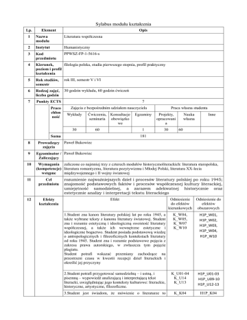 Sylabus modułu kształcenia Lp. Element Opis 1 Nazwa modułu Literatura współczesna 2 Instytut Humanistyczny 3 Kod przedmiotu PPWSZ-FP-1-5616-s 4 filologia polska, studia pierwszego stopnia, profil praktyczny Kierunek, poziom i profil kształcenia 5 Rok studiów, semestr rok III, semestr V i VI 6 Rodzaj zajęć, liczba godzin 30 godzin wykładu, 60 godzin ćwiczeń 7 Punkty ECTS Praco chłon ność 7 Zajęcia z bezpośrednim udziałem nauczyciela Wykłady Ćwiczenia, Konsultacje seminaria obowiązko we 30 60 Prowadzący zajęcia Egzaminy Projekty, opracowani a 1 30 Nauka własna Inne 60 181 Suma 8 Praca własna studenta Paweł Bukowiec 9 Egzaminator / Paweł Bukowiec Zaliczający 10 Wymagania zaliczone co najmniej trzy z czterech modułów historycznoliterackich: literatura staropolska, (kompetencje) literatura romantyzmu, literatura pozytywizmu i Młodej Polski, literatura XX-lecia międzywojennego i II wojny światowej wstępne 11 Cel przedmiotu 12 Efekty kształcenia rozumienie najważniejszych dzieł i procesów literatury polskiej po roku 1945; znajomość podstawowych faktów i procesów współczesnej kultury literackiej, umiejętność samodzielnej, a zarazem adekwatnej historycznie oraz estetycznie analizy i interpretacji tekstu literackiego Efekt Odniesienie Odniesienie do do efektów efektów kierunkowych obszarowych 1.Student zna kanon literatury polskiej lat po roku 1945, a także wybrane teksty z kanonu literatury światowej. Student zna i rozumie estetyczną i ideologiczną swoistość literatury współczesnej, a także ich wewnętrzne estetyczne i ideologiczne bogactwo. Student posiada podstawową wiedzę o antropologicznych i filozoficznych kontekstach literatury od roku 1945. Student zna i rozumie podstawowe pojęcia z zakresu prawa autorskiego, w zwłaszcza tym pojęcie plagiatu. Student potrafi wskazać przemiany zachodzące na przestrzeni czasu w kwestii recepcji dzieł literackich i określić jej przyczyny K_W04, K_W05, K_W07 K_W10 H1P_W01, H1P_W02, H1P_W03, H1P_W04, H1P_W10 2.Student potrafi przygotować samodzielną – i ustną, i pisemną – wypowiedź analizującą i interpretującą tekst literacki, uwzględniając jego konteksty kulturowe: literackie, historyczne, artystyczne, filozoficzne. K_U01-04 K_U14 K_U13 H1P_U01-03 H1P_U09-10 H1P_U12-13 3.Student jest świadom, że mówienie o literaturze to K_K04 H1P_K04 dyskursywna interwencja społeczna. Student ma poczucie wagi tej roli społecznej, do jakiej predestynuje go bycie humanistą 13 Forma i warunki potwierdzenia efektu kształcenia K_K05 K_K06 H1P_K05 H1P_K06 Sposób potwierdzenia (weryfikacji) Efekt nr 1 Egzamin ustny. nr 2 Ocena pisemnej pracy rocznej, bieżąca ocena aktywności studenta w trakcie ćwiczeń. nr 3 Bieżąca ocena aktywności studenta w czasie ćwiczeń 14 Treści literatura polska po roku 1945: kanon, wewnętrzna periodyzacja, merytoryczne najważniejsze prądy estetycznoliterackie epoki i ich uwarunkowania przedmiotu kulturowe; analiza historycznoliteracka i interpretacja wybranych tekstów epoki; wybrane zagadnienia kultury literackiej epoki: ugrupowania literackie, manifesty, czasopisma; wybrane zagadnienia z literatury powszechnej; problemy kultury popularnej; kultura alternatywna i kultura masowa; zagadnienie własności intelektualnej Wykłady: PRL – charakterystyka ustroju i kultury, najważniejsze daty i propozycje periodyzacyjne; Literatura i kultura emigracyjna: ogólna charakterystyka, najważniejsze ośrodki, najwybitniejsi twórcy; Druga połowa lat 40. i socrealizm: rys historyczno- i kulturowoliteracki; Odwilż i tzw. nasza mała stabilizacja: rys historyczno- i kulturowoliteracki; Rok 68 i jego znaczenie dla kultury Polski, Europy i świata; Lata 70.: rys historyczno- i kulturowoliteracki; Okres stanu wojennego, koniec PRL i III RP: rys historyczno- i kulturowo literacki; Fenomen: Gombrowicz; Fenomen: Miłosz; Fenomen: „Kultura”; Fenomen: Białoszewski; Fenomen: Parnicki; Fenomen: Herling-Grudziński; Fenomen: Różewicz; Fenomen: Szymborska. 15 P. Czapliński, P. Śliwiński, Literatura polska 1976-1998, Kraków 1999 lub wydanie następne. Wykaz M. Danilewicz-Zielińska, Szkice o literaturze emigracyjnej, Warszawa 1992. literatury podmiotowej T. Drewnowski, Próba scalenia. Obiegi, wzorce, style. Literatura polska 1944-1989, Warszawa 1997. A. Hutnikiewicz, Od czystej formy do literatury faktu, Toruń 1979 lub wydanie następne. Lektury polonistyczne. Literatura współczesna, t. 1, pod red. R. Nycza i J. Jarzębskiego, Kraków 1997; t. 2 pod red. R. Nycza, Kraków 1999. Literatura polska 1918-1975, t. 3: 1945-1975, cz. 1, pod red. A. Brodzkiej i T. Bujnickiego, Warszawa 1996. Literatura polska XX wieku. Przewodnik encyklopedyczny, t. 1, 2, Warszawa 2000. W. Maciąg, Nasz wiek XX. Przewodnie idee literatury polskiej, Wrocław 1992. Słownik literatury polskiej XX wieku, red. A. Brodzka i in.,Wrocław 1992. S. Stabro, Literatura polska 1944-2000: zarys, wyd drugie, Kraków 2005. 16 Literatura polska: Wykaz literatury przedmiotowe J. Andrzejewski, Popiół i diament, Bramy raju; S. Barańczak, wybór poezji; j M. Białoszewski, wybór poezji, Pamiętnik z powstania warszawskiego; A. Bobkowski, Szkice piórkiem (rozdział 1940); T. Borowski, Utwory wybrane BN I 276; L. Buczkowski, Czarny potok; W. Gombrowicz, Ślub, Trans-Atlantyk, Dziennik (wybrany tom), Kosmos; S. Grochowiak, wybór poezji; Z. Herbert, wybór poezji, Barbarzyńca w ogrodzie lub Martwa natura z wędzidłem; G. Herling-Grodziński, Inny świat; wybór opowiadań (stąd: Wieża, Pieta dell’Isola, Książę Niezłomny), Dziennik pisany nocą (wybrany tom); M. Hłasko, Pierwszy krok w chmurach. Następny do raju BN I 295 (wybór); J. Iwaszkiewicz, wybór poezji powojennej; R. Kapuściński, Cesarz lub Heban lub Imperium; T. Konwicki, Bohiń; M. Kuncewiczowa, Leśnik; S. Lem, Głos Pana; Kongres futurologiczny; E. Lipska, wybór poezji; Cz. Miłosz, wybór poezji powojennej. Dolina Issy, To, Zni