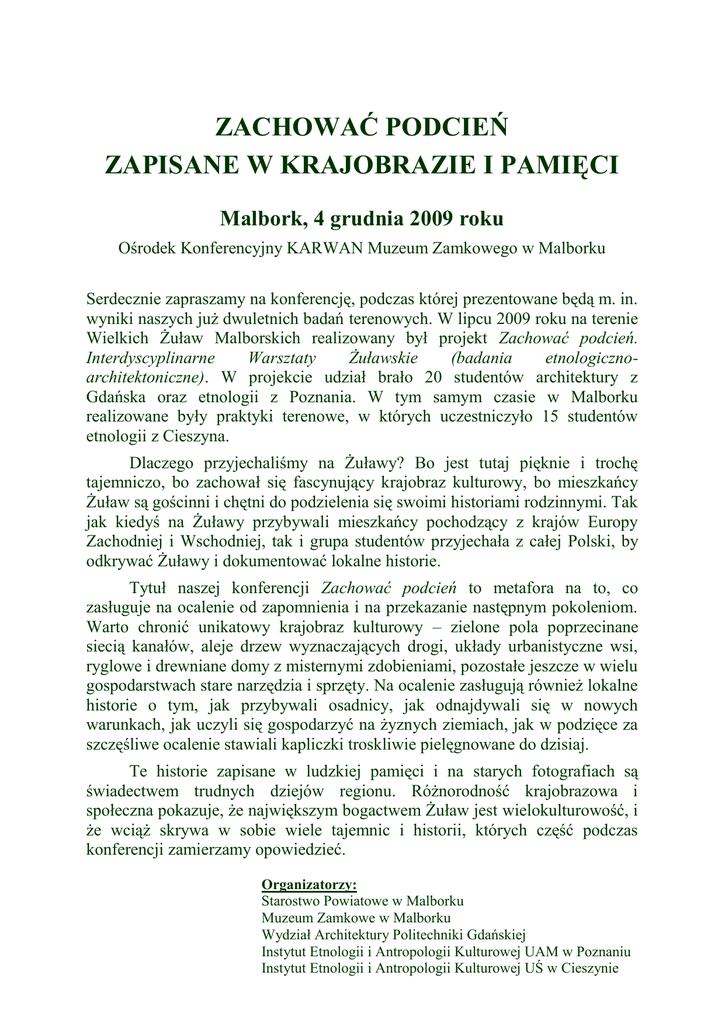 ZACHOWAĆ PODCIEŃ ZAPISANE W KRAJOBRAZIE I PAMIĘCI Malbork, 4 grudnia 2009 roku Ośrodek Konferencyjny KARWAN Muzeum Zamkowego w Malborku Serdecznie zapraszamy na konferencję, podczas której prezentowane będą m. in. wyniki naszych już dwuletnich badań terenowych. W lipcu 2009 roku na terenie Wielkich Żuław Malborskich realizowany był projekt Zachować podcień. Interdyscyplinarne Warsztaty Żuławskie (badania etnologicznoarchitektoniczne). W projekcie udział brało 20 studentów architektury z Gdańska oraz etnologii z Poznania. W tym samym czasie w Malborku realizowane były praktyki terenowe, w których uczestniczyło 15 studentów etnologii z Cieszyna. Dlaczego przyjechaliśmy na Żuławy? Bo jest tutaj pięknie i trochę tajemniczo, bo zachował się fascynujący krajobraz kulturowy, bo mieszkańcy Żuław są gościnni i chętni do podzielenia się swoimi historiami rodzinnymi. Tak jak kiedyś na Żuławy przybywali mieszkańcy pochodzący z krajów Europy Zachodniej i Wschodniej, tak i grupa studentów przyjechała z całej Polski, by odkrywać Żuławy i dokumentować lokalne historie. Tytuł naszej konferencji Zachować podcień to metafora na to, co zasługuje na ocalenie od zapomnienia i na przekazanie następnym pokoleniom. Warto chronić unikatowy krajobraz kulturowy – zielone pola poprzecinane siecią kanałów, aleje drzew wyznaczających drogi, układy urbanistyczne wsi, ryglowe i drewniane domy z misternymi zdobieniami, pozostałe jeszcze w wielu gospodarstwach stare narzędzia i sprzęty. Na ocalenie zasługują również lokalne historie o tym, jak przybywali osadnicy, jak odnajdywali się w nowych warunkach, jak uczyli się gospodarzyć na żyznych ziemiach, jak w podzięce za szczęśliwe ocalenie stawiali kapliczki troskliwie pielęgnowane do dzisiaj. Te historie zapisane w ludzkiej pamięci i na starych fotografiach są świadectwem trudnych dziejów regionu. Różnorodność krajobrazowa i społeczna pokazuje, że największym bogactwem Żuław jest wielokulturowość, i że wciąż skrywa w sobie wiele tajemnic i historii, których część podczas konferencji zamierzamy opowiedzieć. Organizatorzy: Starostwo Powiatowe w Malborku Muzeum Zamkowe w Malborku Wydział Architektury Politechniki Gdańskiej Instytut Etnologii i Antropologii Kulturowej UAM w Poznaniu Instytut Etnologii i Antropologii Kulturowej UŚ w Cieszynie PROGRAM KONFERENCJI: 09.00-09.15 otwarcie konferencji i powitanie gości 09.15-09.30 J. Borucka (PG Gdańsk), A. W. Brzezińska (UAM Poznań), Zapisane w krajobrazie i pamięci. 09.30-09.45 M. Knut, M. Mleczko (PG Gdańsk), Zachować podcień - Nowa Cerkiew, Gniazdowo, Pręgowo Żuławskie. 09.45-10.00 P. Baranowska, A. Frydrycka (UAM Poznań), "Zapuszczone korzenie" - czyli autochtoni na Żuławach Malborskich. 10.00-10.15 Z. Łaga, A. Żur (UŚ Cieszyn) Oswajanie krajobrazu kulturowego Żuław Malborskich przez osadników po 1945 roku. Analiza wybranych przykładów 10.15-10.30 A. Wilde, Ż. Nowodworska (PG Gdańsk), Zachować podcień – Parszewo, Lubieszewo, Starynia. 10.30-10.45 M. Jaworska, I. Kujawa (UAM Poznań), Żuławy – przestrzeń pisana dziejami. 10.45-11.00 przerwa 11.00-11.15 M. Szadokierska, A. Drapała, M. Kleczyk (PG Gdańsk), Zachować podcień – Kościeleczki, Tuja, Laski, Dębina. 11.15-11.30 K. Rybarczyk (UAM Poznań), Krzyże i kapliczki przydrożne jako wyróżnik tożsamości kulturowej mieszkańców Żuław. 11.30-11.45 B. Jesionowski (Muzeum Zamkowe w Malborku), Podcień jako obiekt badań konserwatorskich? 11.45-12.00 D. Tusiński (UŚ Cieszyn), Wartościowanie przestrzeni miejskiej na przykładzie Malborka 12.00-12.15 M. Olczak, A. Kondratowicz, A. Łopacka (PG Gdańsk), Zachować podcień - Nowy Staw. 12.15-12.30 B. Stańda, (UAM Poznań), Nowy Staw w oczach jego mieszkańców. 12.30-14.00 przerwa obiadowa 14.00-14.15 K. Piętowska, A. Łopacka, K. Krause (PG Gdańsk), Zachować podcień – Boręty, Pordenowo, Palczewo. 14.15-14.30 M. Różańska (UAM Poznań), Turystyka kulturowa na Żuławach, w perspektywie antropologicznej. 14.30-14.45 A. Drożdż (UŚ Cieszyn), Produkt regionalny jako element kształtowania żuławskiej tożsamości regionalnej. 14.45-15.00 M. Grosicka (Starostwo Powiatowe w Malborku), Promocja Żuław Malborskich 15.00-15.15 przerwa 15.15-15.30 M. Olczak, A. Kondratowicz (PG Gdańsk), Zachować podcień - Lasowice Wielkie, Lichnowy. 15.30-15.45 J. Poczobut (PG Gdańsk), Kilka słów o zagrodzie żuławskiej. 15.45-16.00 B. Lipińska (PG Gdańsk), „Archeologia” krajobrazu Żuław. 16.00-16.30 podsumowanie i zakończenie konferencji
