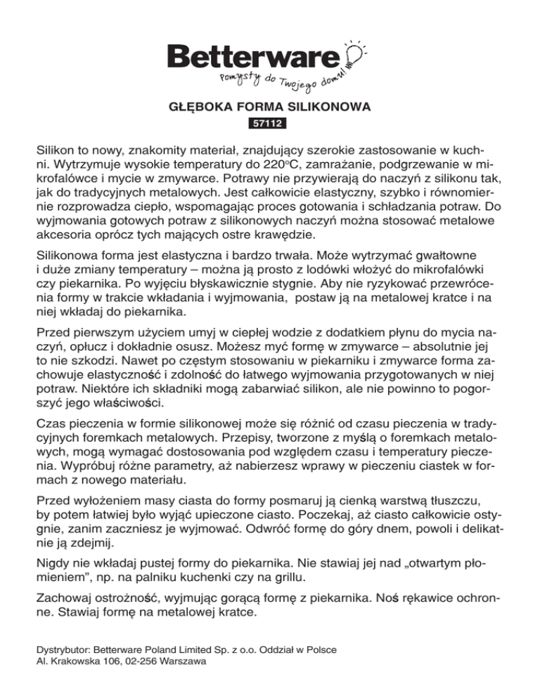 Głęboka forma silikonowa 57112 Silikon to nowy, znakomity materiał, znajdujący szerokie zastosowanie w kuchni. Wytrzymuje wysokie temperatury do 220oC, zamrażanie, podgrzewanie w mikrofalówce i mycie w zmywarce. Potrawy nie przywierają do naczyń z silikonu tak, jak do tradycyjnych metalowych. Jest całkowicie elastyczny, szybko i równomiernie rozprowadza ciepło, wspomagając proces gotowania i schładzania potraw. Do wyjmowania gotowych potraw z silikonowych naczyń można stosować metalowe akcesoria oprócz tych mających ostre krawędzie. Silikonowa forma jest elastyczna i bardzo trwała. Może wytrzymać gwałtowne i duże zmiany temperatury – można ją prosto z lodówki włożyć do mikrofalówki czy piekarnika. Po wyjęciu błyskawicznie stygnie. Aby nie ryzykować przewrócenia formy w trakcie wkładania i wyjmowania, postaw ją na metalowej kratce i na niej wkładaj do piekarnika. Przed pierwszym użyciem umyj w ciepłej wodzie z dodatkiem płynu do mycia naczyń, opłucz i dokładnie osusz. Możesz myć formę w zmywarce – absolutnie jej to nie szkodzi. Nawet po częstym stosowaniu w piekarniku i zmywarce forma zachowuje elastyczność i zdolność do łatwego wyjmowania przygotowanych w niej potraw. Niektóre ich składniki mogą zabarwiać silikon, ale nie powinno to pogorszyć jego właściwości. Czas pieczenia w formie silikonowej może się różnić od czasu pieczenia w tradycyjnych foremkach metalowych. Przepisy, tworzone z myślą o foremkach metalowych, mogą wymagać dostosowania pod względem czasu i temperatury pieczenia. Wypróbuj różne parametry, aż nabierzesz wprawy w pieczeniu ciastek w formach z nowego materiału. Przed wyłożeniem masy ciasta do formy posmaruj ją cienką warstwą tłuszczu, by potem łatwiej było wyjąć upieczone ciasto. Poczekaj, aż ciasto całkowicie ostygnie, zanim zaczniesz je wyjmować. Odwróć formę do góry dnem, powoli i delikatnie ją zdejmij. Nigdy nie wkładaj pustej formy do piekarnika. Nie stawiaj jej nad „otwartym płomieniem”, np. na palniku kuchenki czy na grillu. Zachowaj ostrożność, wyjmując gorącą formę z piekarnika. Noś rękawice ochronne. Stawiaj formę na metalowej kratce. Dystrybutor: Betterware Poland Limited Sp. z o.o. Oddział w Polsce Al. Krakowska 106, 02-256 Warszawa