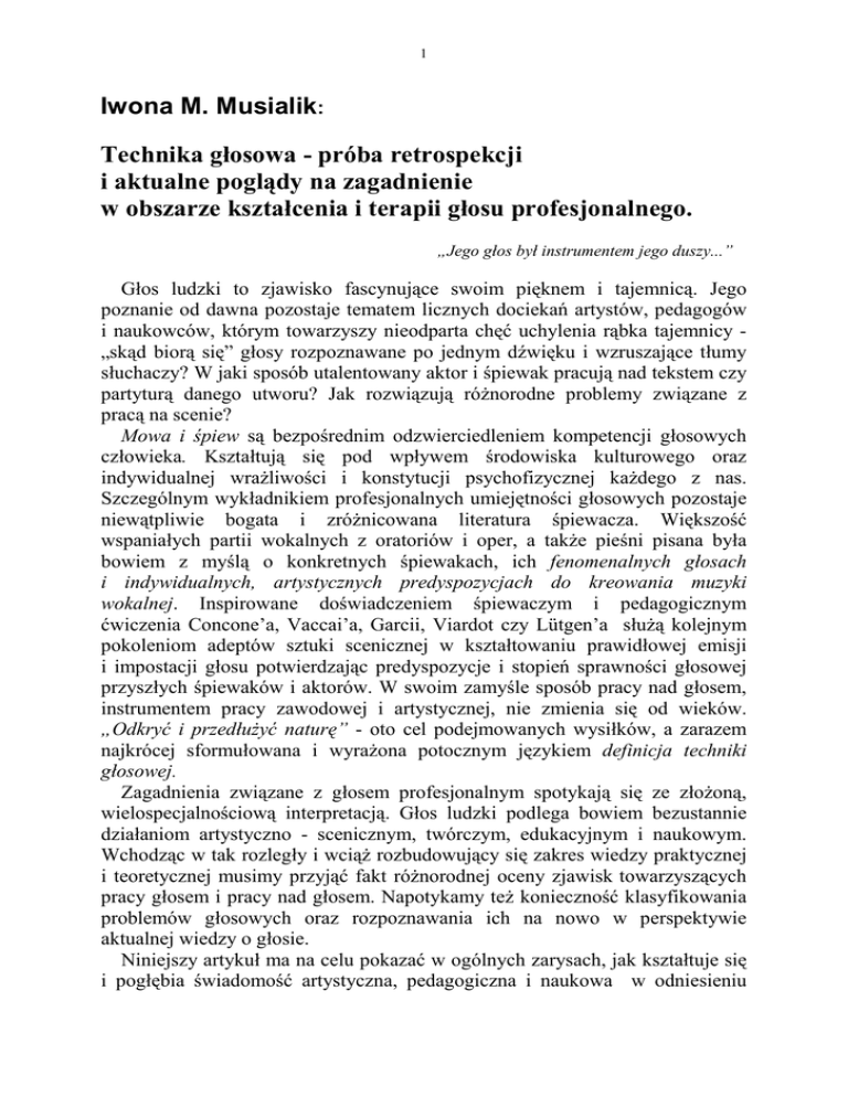 1 Iwona M. Musialik: Technika głosowa - próba retrospekcji i aktualne poglądy na zagadnienie w obszarze kształcenia i terapii głosu profesjonalnego. „Jego głos był instrumentem jego duszy...” Głos ludzki to zjawisko fascynujące swoim pięknem i tajemnicą. Jego poznanie od dawna pozostaje tematem licznych dociekań artystów, pedagogów i naukowców, którym towarzyszy nieodparta chęć uchylenia rąbka tajemnicy „skąd biorą się” głosy rozpoznawane po jednym dźwięku i wzruszające tłumy słuchaczy? W jaki sposób utalentowany aktor i śpiewak pracują nad tekstem czy partyturą danego utworu? Jak rozwiązują róŜnorodne problemy związane z pracą na scenie? Mowa i śpiew są bezpośrednim odzwierciedleniem kompetencji głosowych człowieka. Kształtują się pod wpływem środowiska kulturowego oraz indywidualnej wraŜliwości i konstytucji psychofizycznej kaŜdego z nas. Szczególnym wykładnikiem profesjonalnych umiejętności głosowych pozostaje niewątpliwie bogata i zróŜnicowana literatura śpiewacza. Większość wspaniałych partii wokalnych z oratoriów i oper, a takŜe pieśni pisana była bowiem z myślą o konkretnych śpiewakach, ich fenomenalnych głosach i indywidualnych, artystycznych predyspozycjach do kreowania muzyki wokalnej. Inspirowane doświadczeniem śpiewaczym i pedagogicznym ćwiczenia Concone’a, Vaccai’a, Garcii, Viardot czy Lütgen’a słuŜą kolejnym pokoleniom adeptów sztuki scenicznej w kształtowaniu prawidłowej emisji i impostacji głosu potwierdzając predyspozycje i stopień sprawności głosowej przyszłych śpiewaków i aktorów. W swoim zamyśle sposób pracy nad głosem, instrumentem pracy zawodowej i artystycznej, nie zmienia się od wieków. „Odkryć i przedłuŜyć naturę” - oto cel podejmowanych wysiłków, a zarazem najkrócej sformułowana i wyraŜona potocznym językiem definicja techniki głosowej. Zagadnienia związane z głosem profesjonalnym spotykają się ze złoŜoną, wielospecjalnościową interpretacją. Głos ludzki podlega bowiem bezustannie działaniom artystyczno - scenicznym, twórczym, edukacyjnym i naukowym. Wchodząc w tak rozległy i wciąŜ rozbudowujący się zakres wiedzy praktycznej i teoretycznej musimy przyjąć fakt róŜnorodnej oceny zjawisk towarzyszących pracy głosem i pracy nad głosem. Napotykamy teŜ konieczność klasyfikowania problemów głosowych oraz rozpoznawania ich na nowo w perspektywie aktualnej wiedzy o głosie. Niniejszy artykuł ma na celu pokazać w ogólnych zarysach, jak kształtuje się i pogłębia świadomość artystyczna, pedagogiczna i naukowa w odniesieniu 2 do problemów techniki głosowej, a takŜe w jaki sposób osiągnięcia współczesnej nauki znajdują swoje zastosowanie w kształceniu i terapii głosu profesjonalnego. Prace wymienione w przypisach do artykułu, związane tematycznie ze sztuką Ŝywego słowa, kształtowaniem się stylów wykonawczych, jak równieŜ metodami kształcenia i terapii głosu, stanowią bibliografię przedmiotu z konieczności zawęŜoną i fragmentaryczną. Zamierzeniem autora było ujęcie zagadnień techniki głosowej w sposób syntetyczny i zachęcający czytelnika do samodzielnych poszukiwań oraz studiowania bogatych materiałów źródłowych poświeconych problemom techniki głosowej. Początki głosu profesjonalnego - przegląd wybranych faktów do 1854 r. Technika głosowa, sztuka Ŝywego słowa i sztuka wokalna postrzegane są w perspektywie kulturowej i historycznej jako pojęcia bezpośrednio ze sobą powiązane. Mowę i śpiew oceniamy bowiem jako umiejętności naturalne, w róŜnym stopniu uświadamiane i oparte na spontanicznie stosowanych zasadach głosu naturalnego. 1 Istotnym staje się zatem stwierdzenie, kiedy i w jakich okolicznościach naturalne umiejętności głosowe nabrały charakteru opisowego: zostały rozpoznane, nazwane i usystematyzowane wg jasnych kryteriów, zyskując tym samym postawy i ramy téchnē.2 • II tysiąclecie p.n.e. - powstają teksty Rygweda (Wiedza hymnów) i Samaweda (Wiedza śpiewów), a w II w. p.n.e. Natyasastra - traktat Bharaty o teatrze, gdzie wskazane są związki słowa, muzyki i tańca; w sanskryckich tekstach zostaje bardzo precyzyjnie wyjaśniona techniczna strona śpiewu - sposób wydobywania dźwięków, a takŜe związki słowa i muzyki 3; • V-IV w. p.n.e. - Teatr Dionizosa w Atenach funkcjonuje jako przejaw toŜsamości społecznej, a festiwal Dionizosa stanowi waŜne święto religijne, wydarzenie społeczne i polityczne - mniej sztukę w dzisiejszym tego słowa rozumieniu; w praktyce teatru ateńskiego kształtują się ścisłe reguły kompozycyjne ruchu scenicznego, mowy i śpiewu. Grupy aktorów identyfikowane są z określeniem technitai (praktykujący techne). NaleŜy w tym miejscu wyraźnie podkreślić ścisły związek języka tragedii z retoryką, pojmowaną w kategoriach techne. W II w. p.n.e. termin technitai („ artyści Dionizosa”) jest oficjalnie przyjmowany jako nazwa cechu aktorskiego nb. odpowiadał mu w języku łacińskim termin artifices - „praktykujący ars” (rzemiosła i sztuki); ateński słownik dostarcza w zakresie głosowej praktyki scenicznej określeń dotyczących jakości poszukiwanych dźwięków najwyŜej ceni się piękny ton głosu; w traktatach O głosach (przypisywanych Arystotelesowi) idealny głos jest określany jako ligys lub ligyros - wysoki 3 i skoncentrowany, przypominający „cykady, szarańczę i słowiki”, jednocześnie czysty, słodki i wibrujący; Arystoteles w „Retoryce” zwraca uwagę na konieczność unikania przez aktora „sztuczności mówienia” oraz zdolność aktora do powtarzania tych samych słów ze zmienną intonacją głosu; kwintesencja sztuki aktorskiej (zgodnie z „Poetyką” Arystotelesa) to „ umiejętność właściwego rozpoznania form wypowiedzi (schema tes leksos), jak np. rozkaz, prośba, groźba, pytanie, odpowiedź itp.”; za nadrzędną w sztuce sc