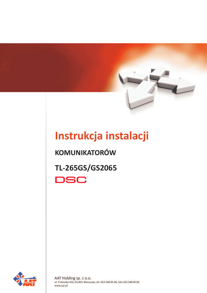 Instrukcja instalacji KOMUNIKATORÓW TL-265GS/GS2065 TL260GS/TL265GS/GS2060/GS2065 – Instrukcja instalacji SPIS TREŚCI 1. WSTĘP ................................................................................................................................................... 3 1.1. Dostępne modele ................................................................................................................................ 3 1.2. Cechy .................................................................................................................................................. 3 1.3. Specyfikacja techniczna ....................................................................................................................... 3 1.4. Kompatybilne urządzenia .................................................................................................................... 4 2. INSTALACJA KOMUNIKATORÓW ............................................................................................................ 4 2.1. Programowanie komunikatorów za pomocą DLS IV (przed instalacją) .................................................. 4 2.2. Zdalne programowanie komunikatorów za pomocą DLS IV (po instalacji) ............................................ 4 2.3. Zdalne programowanie komunikatorów za pomocą wiadomości SMS ................................................. 5 2.4. Podłączenie modułów TL260GS/GS2060 do central PC1616/1832/1864 .............................................. 5 2.5. Podłączenie modułów TL260GS/GS2060 do centrali PC9155 ................................................................ 7 2.6. Programowanie PC1616/1832/1864 .................................................................................................... 8 2.7. Programowanie PC9155 ...................................................................................................................... 8 3. DIODY STATUSU ..................................................................................................................................... 9 3.1. Dioda statusu usterek ......................................................................................................................... 9 3.2. Dioda statusu połączenia TCP/IP ........................................................................................................ 10 3.3. Dioda statusu siły sygnału .................................................................................................................. 10 4. OPIS SEKCJI PROGRAMOWALNYCH ...................................................................................................... 12 5. ARKUSZE PROGRAMOWANIA .............................................................................................................. 15 DODATEK A : TESTOWANIE I ROZWIĄZYWANIE PROBLEMÓW Uwaga! Urządzenie należy montować w pozycji jak opisano w powyższej instrukcji. Okablowanie wewnętrzne należy poprowadzić w sposób zapobiegający: − nadmiernemu przeciążeniu przewodu i połączeń styków; − poluzowaniu połączeń na stykach; − uszkodzeniu izolacji przewodu. Uwaga! Nigdy nie montować urządzenia podczas wyładowań atmosferycznych. Instalator ma obowiązek poinstruować użytkownika końcowego by: • Nie próbował samodzielnych napraw sprzętu. Otwieranie lub zdejmowanie obudowy może narazić użytkownika na porażenie prądem lub inne niebezpieczeństwa. Wszystkie naprawy powinny być wykonywane przez wykwalifikowany personel serwisowy. • Używać jedynie autoryzowane akcesoria Nie umieszczać baterii w ogniu lub wodzie. Umieszczenie baterii w ogniu może prowadzić do eksplozji. Zużyte baterie muszą być utylizowane w sposób bezpieczny dla środowiska. Nie wolno wrzucać zużytych baterii do odpadów domowych, do ognia ani do wody. Zużyte baterie należy usuwać/przetwarzać stosownie z wymogami przepisów krajowych. Niektóre z materiałów użytych do wyrobu baterii mogą stać się toksycznymi, jeżeli zużyta bateria nie zostanie poddana recyclingowi. AAT Holding sp. z o.o. Wszelkie prawa zastrzeżone. 2 TL260GS/TL265GS/GS2060/GS2065 – Instrukcja instalacji 1. Wprowadzenie Urządzenia GS2060/GS265 to komunikatory alarmowe GSM/GPRS wysyłające informacje o zdarzeniach zaistniałych w systemie do odbiorników SG-System III, SG-System II, oraz SG-System I przy wykorzystaniu sieci telefonii komórkowej GSM/GPRS. Urządzenia TL260GS/TL265GS to dwu torowe komunikatory alarmowe mogące wysyłać informacje o zdarzeniach zaistniałych w systemie do odbiorników SG-System III, SG-System II, oraz SG-System I przy wykorzystaniu sieci TCP/IP oraz sieci telefonii komórkowej GSM/GPRS. Funkcjonalność komunikatorów TL260GS/TL265GS/GS2060/GS2065 w dużym stopniu zależy od zasięgu sieci GSM. Przed montażem należy sprawdzić czy urządzenie wykrywa sieć GSM/GPRS (minimum jedna z zielonych diod powinna świecić). Jeżeli urządzenie nie wykrywa sieci należy zmienić miejsce montażu urządzenia, lub zaopatrzyć się w opcjonalny przewód antenowy. 1.1. Dostępne modele Poniżej podane modele komunikatorów alarmowych kompatybilne są z centralami PC1616/1832/1864 • TL260GS (komunikator o komunikacji dwu torowej TCP/IP + GSM/GPRS) • GS2060 (komunikator GSM/GPRS) Poniżej podane modele komunikatorów alarmowych kompatybilne są z centralą PC9155 • TL265GS (komunikator o komunikacji dwu torowej TCP/IP + GSM/GPRS) • GS2065 (komunikator GSM/GPRS) 1.2. Cechy • Dwutorowa komunikacja poprzez sieć TCP/IP oraz sieć GSM/GPRS (tylko TL265GS/TL260GS) • Możliwość pracy jako pomocniczy lub podstawowy komunikator GSM/GPRS • Zintegrowanie kierowanie połączeniami • Możliwość zdalnego programowania poprzez sieć TCP/IP lub sieć GSM/GPRS • Nadzór sygnałów kontrolnych poprzez sieć GSM/GPRS, oraz TCP/IP • Kodowanie kluczem 128 bitów AES • Pełne raportowanie zdarzeń • Format SIA • Złącze PC-Link • Status s
