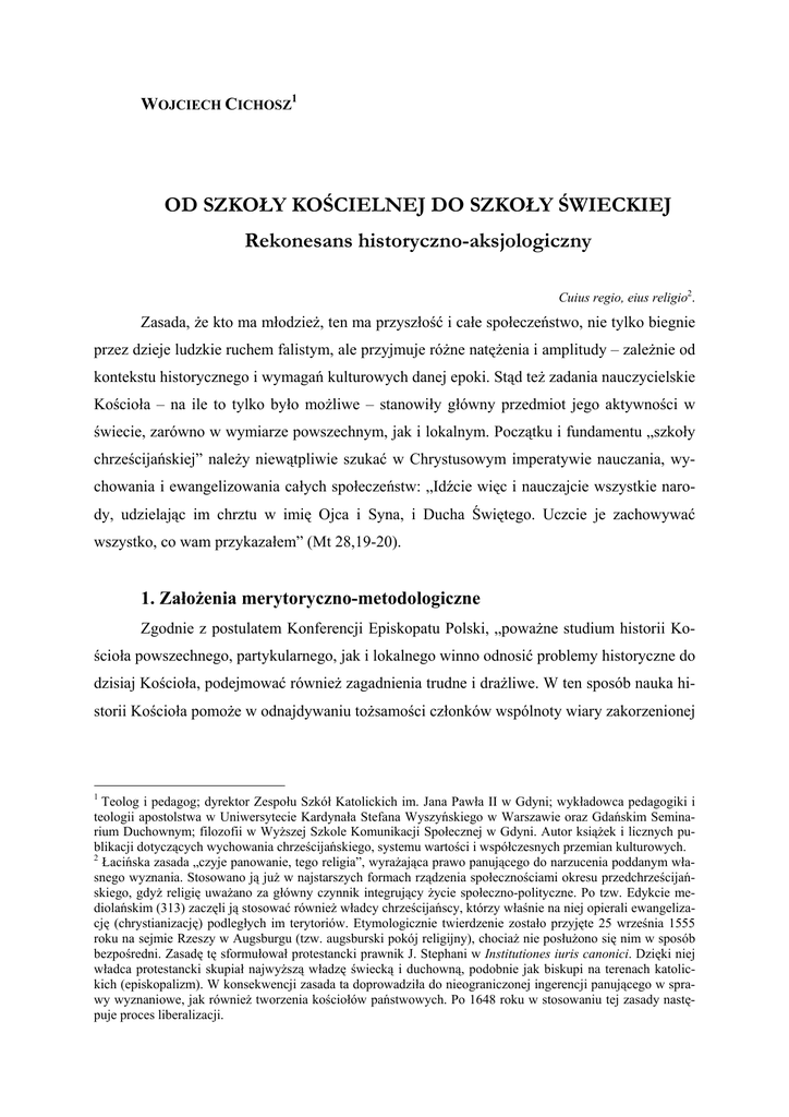WOJCIECH CICHOSZ1 OD SZKOŁY KOŚCIELNEJ DO SZKOŁY ŚWIECKIEJ Rekonesans historyczno-aksjologiczny Cuius regio, eius religio2. Zasada, że kto ma młodzież, ten ma przyszłość i całe społeczeństwo, nie tylko biegnie przez dzieje ludzkie ruchem falistym, ale przyjmuje różne natężenia i amplitudy – zależnie od kontekstu historycznego i wymagań kulturowych danej epoki. Stąd też zadania nauczycielskie Kościoła – na ile to tylko było możliwe – stanowiły główny przedmiot jego aktywności w świecie, zarówno w wymiarze powszechnym, jak i lokalnym. Początku i fundamentu „szkoły chrześcijańskiej” należy niewątpliwie szukać w Chrystusowym imperatywie nauczania, wychowania i ewangelizowania całych społeczeństw: „Idźcie więc i nauczajcie wszystkie narody, udzielając im chrztu w imię Ojca i Syna, i Ducha Świętego. Uczcie je zachowywać wszystko, co wam przykazałem” (Mt 28,19-20). 1. Założenia merytoryczno-metodologiczne Zgodnie z postulatem Konferencji Episkopatu Polski, „poważne studium historii Kościoła powszechnego, partykularnego, jak i lokalnego winno odnosić problemy historyczne do dzisiaj Kościoła, podejmować również zagadnienia trudne i drażliwe. W ten sposób nauka historii Kościoła pomoże w odnajdywaniu tożsamości członków wspólnoty wiary zakorzenionej 1 Teolog i pedagog; dyrektor Zespołu Szkół Katolickich im. Jana Pawła II w Gdyni; wykładowca pedagogiki i teologii apostolstwa w Uniwersytecie Kardynała Stefana Wyszyńskiego w Warszawie oraz Gdańskim Seminarium Duchownym; filozofii w Wyższej Szkole Komunikacji Społecznej w Gdyni. Autor książek i licznych publikacji dotyczących wychowania chrześcijańskiego, systemu wartości i współczesnych przemian kulturowych. 2 Łacińska zasada „czyje panowanie, tego religia”, wyrażająca prawo panującego do narzucenia poddanym własnego wyznania. Stosowano ją już w najstarszych formach rządzenia społecznościami okresu przedchrześcijańskiego, gdyż religię uważano za główny czynnik integrujący życie społeczno-polityczne. Po tzw. Edykcie mediolańskim (313) zaczęli ją stosować również władcy chrześcijańscy, którzy właśnie na niej opierali ewangelizację (chrystianizację) podległych im terytoriów. Etymologicznie twierdzenie zostało przyjęte 25 września 1555 roku na sejmie Rzeszy w Augsburgu (tzw. augsburski pokój religijny), chociaż nie posłużono się nim w sposób bezpośredni. Zasadę tę sformułował protestancki prawnik J. Stephani w Institutiones iuris canonici. Dzięki niej władca protestancki skupiał najwyższą władzę świecką i duchowną, podobnie jak biskupi na terenach katolickich (episkopalizm). W konsekwencji zasada ta doprowadziła do nieograniczonej ingerencji panującego w sprawy wyznaniowe, jak również tworzenia kościołów państwowych. Po 1648 roku w stosowaniu tej zasady następuje proces liberalizacji. w tradycji. Wiara przeżywana przez Kościół ma także wymiar historyczny, jest bowiem wiarą całego Ludu Bożego «rozbrzmiewającego w ciągu historii»”3. W sekularyzującym się współcześnie świecie warto zapytać o główne przyczyny oraz kontekst historyczno-kulturowy (tło↔moment) przekształcenia (przejścia) tradycyjnej szkoły kościelnej (fr. l’école chrétienne) w laicką szkołę publiczną (fr. l’école laïque). Szczególnie interesujące wydają się pytania: Jak należy rozumieć laicyzację? Co historycznie legło u jej podstaw? Czy słowo zeświecczenie (laicyzacja) nacechowane jest współczesnymi treściami (rozumiane jako ateizacja oraz walka z Kościołem i religią w ogóle), czy też może w historii wychowania ma ono nieco inne odniesienie i tym samym znaczenie (konotacje etymologiczne: dowartościowanie tego, co świeckie: gr. laikos, łac. laicus – świecki, ludowy)? Owa czytelność języka jest niesłychanie ważna, gdyż często „używamy tych samych słów i korzystamy z tych samych znaków, a zupełnie się nie rozumiemy”4. W kontekście zachodzących współcześnie przeobrażeń cywilizacyjnych powyższe pytania wydają się istotne, wręcz fundamentalne, gdyż oblicze Europy, z jednej strony, ukazuje swój chrześcijański charakter, a z drugiej – postępującą laicyzację i sekularyzację. 2. Początek „szkolnictwa kościelnego” Od wieków na Kościele spoczywa ogromna odpowiedzialność za edukację i wychowanie. Właśnie przed nim zostało postawione zadanie formowania młodego pokolenia w sposób chrześcijański. Stąd też w wielu miejscach szkoły zostały związane z parafiami, klasztorami i katedrami. Pojawiająca się nowa szkoła (tzw. szkoła kościelna) zwróciła się nie tylko ku moralności i kształtowaniu postaw (pedagogiczny ideał „wychowania do zbawienia”), ale – od samego początku swego istnienia – stanowiła prawdziwe centrum kultury. Sztuka wychowania stała się iście mistrzowską ars artium et scientia scientiarum (gr. paideia). Po upadku Cesarstwa Rzymskiego (476) daje się zaobserwować ogólny zanik szkół państwowych. Odtąd zadanie wychowania młodych pokoleń zaczęło spoczywać na dynamicznie rozwijającym się Kościele. Warto w tym miejscu przypomnieć, iż w Europie zachodniej imperium rzymskie obejmowało Włochy, Hiszpanię i Francję, a także Szwajcarię, południowe i zachodnie Niemcy (po Dunaj i Ren) oraz Brytanię. W krajach tych – podobnie jak w całym Cesarstwie Rzymskim – rozwój Kościoła był możliwy dzięki prowadzonej ewangelizacji i chrystianizacji, począwszy od władcy, a na poddanych kończąc. Od początku epoki 3 Konferencja Episkopatu Polski, Dyrektorium Katechetyczne Kościoła Katolickiego w Polsce, Kraków 2001, nr 68; Kongregacja ds. Duchowieństwa, Dyrektorium ogólne o katechizacji, Rzym 1997, nr 105. Zagadnieniu wiary poświęcono w całości tom 6 polskiej „Kolekcji Communio” z 1991 roku (Podstawy wiary – Teologia). 2 średniowiecza mamy do czyni