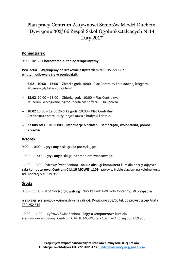 Plan pracy Centrum Aktywności Seniorów Młodzi Duchem, Dywizjonu 303/ 66 Zespół Szkół Ogólnokształcących Nr14 Luty 2017 Poniedziałek 9:00– 10: 30 Choreoterapia- taniec terapeutyczny Wycieczki – Wędrujemy po Krakowie z Ryszardem tel. 515 771 067 w lutym odbywają się w poniedziałki 6.02 10:00 – 13:00 Zbiórka godz.10:00 -Plac Centralny koło dawnej księgarni. Muzeum „Apteka Pod Orłem”. 13.02 10:00 – 13:00 Zbiórka godz. 10:00 – Plac Centralny. Muzeum Geologiczne, ogród Józefa Mehoffera ul. Krupnicza. 20.02 10:00 – 12:00 Zbiórka godz. 10:00 – Plac Centralny Architektura starej Huty- najciekawsze budynki i detale. 27 luty od 10:30 -13:00 - informacje o działaniu samorządu, wolontariat, pomoc prawna. Wtorek 9:00 – 10:00 - Język angielski grupa początkująca. 10:00 –11:00 - Język angielski grupa średniozaawansowana. 11:00 – 13:00 -Cyfrowy Świat Seniora - nauka obsługi komputera kurs dla początkujących sala komputerowa Centrum C bl.10 MOWIS s.109 (zapisy w trybie ciągłym na kolejne kursy tel. Andrzej 505 619 956 Środa 9:00 – 11:00 -Fit Senior Nordic walking. Zbiórka Park AWF koło fontanny. W przypadku niesprzyjającej pogody – gimnastyka na sali -oś. Dywizjonu 303/66 tel. do prowadzącej- Agata 739 252 515 10:00 – 11:00 - Cyfrowy Świat Seniora - Zajęcia komputerowe kurs dla średniozaawansowany. Centrum C bl. 10 MOWIS sala 109. Tel Andrzej 505 619 956 Projekt jest współfinansowany ze środków Gminy Miejskiej Kraków Fundacja LokoMotywa Tel. 722 -102 -173, [email protected] Czwartek 9:15 – 10:00 - Fit Senior gimnastyka usprawniająca - I grupa. 10:00 – 10:45 - Fit Senior gimnastyka usprawniająca - II grupa 10:45 – 11: 30 - Fit Senior gimnastyka usprawniająca, rozciągająca . 11:30 -13:15 - Otwarte drzwi - gry stolikowe, spotkania przy herbacie, wolontariat seniorów, Dyżur koordynatora projektu w każdy czwartek w godzinach otwartych drzwi. Anna Pietras tel. 722 -102 -173 Piątek 10:00 -11:00 - Cyfrowy Świat Seniora –nauka obsługi komputera kurs dla średniozaawansowanych ( zapisy w trybie ciągłym) Zajęcia sala komputerowa Centrum C bl. 10 MOWiS, sala 109 10:00-11:00 - zdrowe odżywianie, kulinaria. 11:00-12:00 - spotkanie przy herbatce, gry stolikowe 13:30-15:30 - zajęcia malarskie - Malowanie na szkle - można się zapisać . 16:00-17:00 - język angielski II grupa średniozaawansowana (można się zapisać). Projekt jest współfinansowany ze środków Gminy Miejskiej Kraków Fundacja LokoMotywa Tel. 722 -102 -173, [email protected]