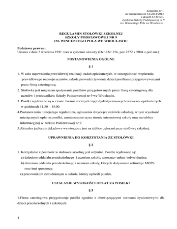 Załącznik nr 1 do zarządzenia nr 4A/2012/2013 z dnia28.12.2012r., dyrektora Szkoły Podstawowej nr 9 im. Wincentego Pola we Wrocławiu REGULAMIN STOŁÓWKI SZKOLNEJ SZKOŁY PODSTAWOWEJ NR 9 IM. WINCENTEGO POLA WE WROCŁAWIU Podstawa prawna: Ustawa z dnia 7 września 1991 roku o systemie oświaty (Dz.U.Nr 256, poz.2572 z 2004 z poź.zm.) POSTANOWIENIA OGÓLNE §1 1. W celu zapewnienia prawidłowej realizacji zadań opiekuńczych, w szczególności wspierania prawidłowego rozwoju uczniów, szkoła prowadzi żywienie dzieci posiłkami przygotowywanymi przez firmę cateringową. 2. Stołówka jest miejscem spożywania posiłków przygotowanych przez firmę cateringową, dla uczniów i pracowników Szkoły Podstawowej nr 9 we Wrocławiu. 3. Posiłki wydawane są w czasie trwania rocznych zajęć dydaktyczno-wychowawczo- opiekuńczych w godzinach 11.30 – 15.00. 4.Postanowienia niniejszego regulaminu, ogłoszenia dotyczące stołówki szkolnej, w tym wysokość miesięcznych opłat za posiłki, zamieszczone są na stronie internetowej szkoły oraz na tablicy informacyjnej w Szkole Podstawowej nr 9. 5.Aktualny jadłospis dekadowy wywieszony jest na tablicy ogłoszeń przy stołówce szkolnej. UPRAWNIENIA DO KORZYSTANIA ZE STOŁÓWKI §2 1. Korzystanie z posiłków w stołówce szkolnej jest odpłatne. Posiłki wydawane są: a) dzieciom oddziału przedszkolnego i uczniom szkoły, wnoszący opłaty indywidualne; b) dzieciom oddziału przedszkolnego i uczniom szkoły, których dożywianie refunduje MOPS oraz inni sponsorzy; c) pracownikom zatrudnionym w szkole, którzy opłacili posiłek. USTALANIE WYSOKOŚCI OPŁAT ZA POSIŁKI §3 1.Firma cateringowa przygotowuje posiłki zgodnie z obowiązującymi normami żywieniowymi dla dzieci przedszkolnych i szkolnych. 1 2.Posiłek – obiad dwudaniowy składa się z: • zupy • drugiego dania • napoju 3.Cena jednego obiadu dla dzieci/uczniów obejmuje koszt faktycznie zużytych produktów do przygotowania posiłku tzw. „wsad do kotła”. 4.Wysokość miesięcznej opłaty za obiady stanowi iloczyn ceny za jeden obiad i ilość dni żywieniowych w miesiącu. 5. Wysokość opłaty za posiłki dla dzieci/uczniów w stołówce szkolnej ustala dyrektor szkoły na podstawie norm żywieniowych dla dzieci przedszkolnych i uczniów szkoły oraz cen rynkowych artykułów spożywczych w porozumieniu z organem prowadzącym szkołę. 6.Pracownicy szkoły korzystający z posiłków w stołówce szkolnej pokrywają pełny koszt posiłku w wysokości surowców zużytych do przygotowania posiłku „wsad do kotła” powiększony o koszt przygotowania posiłku (koszt wynagrodzeń i pochodnych pracowników zatrudnionych w stołówce szkolnej, koszt mediów). 7.W sytuacjach wzrostu kosztu produktów w trakcie roku szkolnego dopuszcza się możliwość zmiany odpłatności, po poinformowaniu korzystających ze stołówki z co najmniej miesięcznym wyprzedzeniem. WNOSZENIE OPŁAT ZA POSIŁKI §4 1.W pierwszym tygodniu września prowadzone są zapisy na obiady w sekretariacie szkoły. Rodzice składają kartę zgłoszenia dziecka na obiady (załącznik nr 1), w której deklarują rodzaj spożywanego posiłku. 2.Pracownik szkoły sporządza listę osób zapisanych na obiady i przekazuje do księgowości celem zaksięgowania przypisu należności. 3. Opłaty za wyżywienie na dany miesiąc należy wpłacać na konto bankowe szkoły PKO BP S.A. nr 08 1020 5226 0000 6402 0416 3754 do 15-go każdego miesiąca lub gotówką w sekretariacie Szkoły Podstawowej nr 9 we Wrocławiu, w wyznaczonych dniach w godzinach od 7.00 do 17.00. 4. Za terminową wpłatę uznaje się datę wpływu środków na rachunek bankowy szkoły. 5. Za nieterminowe dokonywanie opłat za obiady, będą naliczane odsetki zgodnie z obowiązującymi przepisami. 6.Wnoszenie opłat gotówką za obiady potwierdzane jest dowodem wpłaty na numerowanym kwitariuszu i podpisem pracownika. Oryginał otrzymuje księgowa szkoły, kopię wpłaty otrzymuje wpłacający, druga kopia pozostaje do należnych rozliczeń. 7. Opłatę wnosi się za cały miesiąc z góry, do ostatniego dnia miesiąca poprzedzającego miesiąc, za który opłata jest wnoszona. 8.W przypadku braku wpłaty do 15-go każdego miesiąca rodzic zostaje poinformowany 2 o konieczności uiszczenia opłaty za posiłki. 9. Nieuregulowanie opłat za dwa kolejne miesiące powoduje wypisanie dziecka z obiadów. 10.Opłaty za posiłki dla uczniów przez Miejski Ośrodek Pomocy Społecznej dokonywane są do 15-go każdego miesiąca na konto szkoły, na podstawie noty obciążeniowej. 11.W okresie przerwy wakacyjnej odpłatność za korzystanie ze stołówki szkolnej pobierana jest tylko od dzieci przedszkolnych, w miesiącu dyżurowania oddziału przedszkolnego, które na okres wakacji zawarły umowę ( lipiec lub sierpień). ZWROTY ZA NIEWYKORZYSTANE OBIADY §5 1.Odliczeń za czasową nieobecność dziecka/ucznia w szkole dokonuje się w następnym miesiącu, licząc od dnia zgłoszenia. 2. Zwrotu nadpłaty za niewykorzystane posiłki w danym miesiącu dokonuje się w formie zwrotu gotówki w następnym miesiącu w ustalonych godzinach (§ 4 pkt.3). 3.Warunkiem uwzględnienia odliczeń jest zgłoszenie nieobecności dziecka/ucznia w danym dniu w sekretariacie szkoły, osobiście lub pod numer telefonu 71 3672431 lub 71 3672428 do godz.8.30. 4.W przypadku planowanej nieobecności dziecka/ucznia w szkole lub rezygnacji z obiadów należy fakt ten zgłosić do sekretariatu z jednodniowym wyprzedzeniem najpóźniej do godz.15.00. 5. Niezgłoszona nieobecność na posiłku nie podlega zwrotowi. 6.W przypadku planowanej nieobecności w szkole np. wycieczka, należy zgłosić ten fakt w sekretariacie szkoły, co najmniej na dwa dni wcześniej. 7. Uczniowie, którzy mają opłacony obiad a wyjeżdżają na wycieczkę, mogą otrzymać „suchy prowiant” w cenie obiadu, który wydaje pracownik stołówki szkolnej za pokwitowaniem w dniu wycieczki. ZASADY ZACHOWA