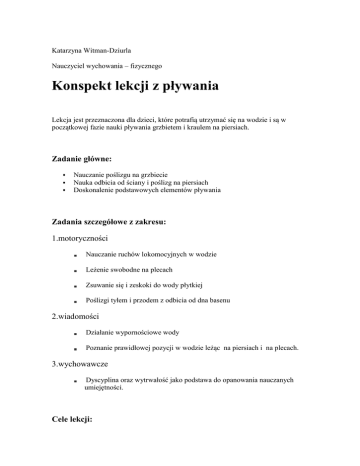 Katarzyna Witman-Dziurla Nauczyciel wychowania – fizycznego Konspekt lekcji z pływania Lekcja jest przeznaczona dla dzieci, które potrafią utrzymać się na wodzie i są w początkowej fazie nauki pływania grzbietem i kraulem na piersiach. Zadanie główne: Nauczanie poślizgu na grzbiecie Nauka odbicia od ściany i poślizg na piersiach Doskonalenie podstawowych elementów pływania Zadania szczegółowe z zakresu: 1.motoryczności Nauczanie ruchów lokomocyjnych w wodzie Leżenie swobodne na plecach Zsuwanie się i zeskoki do wody płytkiej Poślizgi tyłem i przodem z odbicia od dna basenu 2.wiadomości Działanie wypornościowe wody Poznanie prawidłowej pozycji w wodzie leżąc na piersiach i na plecach. 3.wychowawcze Dyscyplina oraz wytrwałość jako podstawa do opanowania nauczanych umiejętności. Cele lekcji: Umiejętność wykonania poślizgu na grzbiecie i na piersiach. Oswojenie się z wodą. Kształtowanie wydolności aerobowej. Temat: Nauczanie poślizgu na grzbiecie i na piersiach. Klasa: pierwsza Czas : 45 min Ilość ćwiczących: 8 / grupa mieszana / Miejsce: pływalnia Pomoce: deski pływackie, piłki, krążki, makarony Metody: zabawowe, ścisła, naśladowcza Tok lekcyjny Nazwa i opis ćwiczenia czas Uwagi organizacyjne 1.CZĘŚĆ WSTĘPNA 1.Cwiczenia organizacyjno Zbiórka, powitanie, sprawdzenie obecności -porządkowe Podanie zadań lekcji 3 min Niećwiczący siadają na ławce i obserwują zajęcia Kontrola ubioru i czystości 2.Rozgrzewka na lądzie i w wodzie Krążenia RR w przód i tył 5 min Ustawienie w rozsypce. Naprzemianstronnie W opadzie tułowia wymachy RR Zmiana ćwiczenia na polecenie nauczyciela. Skłony w bok i w tył W wodzie „marsz zwierząt” „Strzelec”: dwie wyznaczone Głębokość wody 80 cm. osoby starają się trafić piłką w pozostałe. Obroną jest schowanie się pod wodą. 2.CZĘŚĆ GŁÓWNA 1.Ćwiczenia kształtujące umiejętność i doskonalące sprawność „Pluskające rybki”- dzieci 8 min ustawione w szeregu wykonują przysiad, a następnie z odbicia obunóż wyskakują płasko w tył z RR wyciągniętymi za głowę – do zawiśnięcia w wodzie. Podział na grupy i tory. 5 powtórzeń, „Flisacy”- zespoły 3osobowe.Dwóch z każdego zespołu holuje leżącego na plecach . Wykonanie ćwiczeń na płytkiej wodzie „Wystrzelenie torpedy”- jeden z ćwiczących leży na plecach, drugi chwyta za stopy i mocno wypycha w przód. Odcinki 7-8 m Zmiana miejsc 2.Ćwiczenia techniczne Pływanie samymi nogami z deską na grzbiecie 2x 10 m Pływanie samymi nogami z deską, z głową zanurzoną w wodzie i z głową nad wodą 2x10m 15min Konkurs – wygrywa ten kto wykona najdłuższy ślizg Odbicie od dna basenu na sygnał. Zwracamy uwagę na wydech powietrza do wody. Poślizg na piersiach – 2x10m bez deski Poślizg na grzbiecie – 2x10m bez deski Strzałka na piersiach – 2x15m Zwracamy uwagę na wyprostowaną sylwetkę płynącego. Strzałka na grzbiecie –2x15m Przepłynięcie krótkich odcinków kraulem bez oddechu. 1.Zabawy w wodzie z elementami nurkowania. 3. CZĘŚĆ KOŃCOWA „Meduza” 10min Rozsypka „Poławiacze pereł” – nurkowanie po krążki. 2. Część porządkowa „Wesołe foki” – przysiad do zanurzenia się z głową. Zbiórka 4 min Na brzegu basenu – dwuszereg Podsumowanie i omówienie lekcji Wyróżnienie najlepiej ćwiczących dzieci. Dzieci pomagają zebrać pomoce lekcyjne. Osiągnięcia: Dzieci swobodnie wykonują poślizg na grzbiecie i piersiach. Opanowały lęk przed zanurzeniem głowy w wodzie.