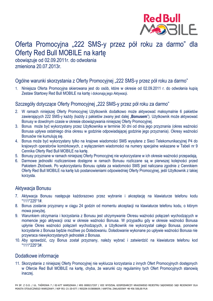 Oferta Promocyjna „222 SMS-y przez pół roku za darmo” dla Oferty Red Bull MOBILE na kartę obowiązuje od 02.09.2011r. do odwołania zmieniona 20.07.2013r. Ogólne warunki skorzystania z Oferty Promocyjnej „222 SMS-y przez pół roku za darmo” 1. Niniejsza Oferta Promocyjna skierowana jest do osób, które w okresie od 02.09.2011 r. do odwołania kupią Zestaw Startowy Red Bull MOBILE na kartę i dokonają jego Aktywacji. Szczegóły dotyczące Oferty Promocyjnej „222 SMS-y przez pół roku za darmo” 2. W ramach niniejszej Oferty Promocyjnej Użytkownik dodatkowo może aktywować maksymalnie 6 pakietów zawierających 222 SMS-y każdy (każdy z pakietów zwany jest dalej „Bonusem”). Użytkownik może aktywować Bonusy w dowolnym czasie w okresie obowiązywania niniejszej Oferty Promocyjnej. 3. Bonus może być wykorzystany przez Użytkownika w terminie 30 dni od dnia jego przyznania (okres ważności Bonusa upływa ostatniego dnia okresu w godzinie odpowiadającej godzinie jego przyznania). Okresy ważności Bonusów nie kumulują się. 4. Bonus może być wykorzystany tylko na krajowe wiadomości SMS wysyłane z Sieci Telekomunikacyjnej P4 do krajowych operatorów komórkowych, z wyłączeniem wiadomości na numery specjalne wskazane w Tabeli nr 9 Cennika Oferty Red Bull MOBILE na kartę. 5. Bonusy przyznane w ramach niniejszej Oferty Promocyjnej nie wykorzystane w ich okresie ważności przepadają. 6. Darmowe jednostki rozliczeniowe dostępne w ramach Bonusu rozliczane są w pierwszej kolejności przed Pakietem Złotówek. Po wykorzystaniu Bonusu opłata za wiadomości SMS jest naliczana zgodnie z Cennikiem Oferty Red Bull MOBILE na kartę lub postanowieniami odpowiedniej Oferty Promocyjnej, jeśli Użytkownik z takiej korzysta. Aktywacja Bonusu 7. Aktywacja Bonusu następuje każdorazowo przez wybranie i akceptację na klawiaturze telefonu kodu *111*225*1#. 8. Bonus zostanie przyznany w ciągu 24 godzin od momentu akceptacji na klawiaturze telefonu kodu, o którym mowa powyżej. 9. Warunkiem otrzymania i korzystania z Bonusu jest utrzymywanie Okresu ważności połączeń wychodzących w momencie jego aktywacji oraz w okresie ważności Bonusa. W przypadku gdy w okresie ważności Bonusa upłynie Okres ważności połączeń wychodzących, a Użytkownik nie wykorzystał całego Bonusa, ponowne korzystanie z Bonusa będzie możliwe po Doładowaniu. Doładowanie wykonane po upływie ważności Bonusa nie przywraca niewykorzystanych jednostek z Bonusa. 10. Aby sprawdzić, czy Bonus został przyznany, należy wybrać i zatwierdzić na klawiaturze telefonu kod *111*225*3#. Dodatkowe informacje 11. Skorzystanie z niniejszej Oferty Promocyjnej nie wyklucza korzystania z innych Ofert Promocyjnych dostępnych w Ofercie Red Bull MOBILE na kartę, chyba, że warunki czy regulaminy tych Ofert Promocyjnych stanowią inaczej. P4 SP. Z O.O. / UL. TAŚMOWA 7 / 02-677 WARSZAWA / KRS 0000217207 / XIII WYDZIAŁ GOSPODARCZY KRAJOWEGO REJESTRU SĄDOWEGO SĄD REJONOWY DLA MIASTA STOŁECZNEGO WARSZAWY / NIP 951-21-20-077 / REGON 015808609 / KAPITAŁ ZAKŁADOWY 48 456 500,00 PLN 12. Operator zastrzega sobie prawo do zmiany lub odwołania niniejszej Oferty Promocyjnej w każdym czasie bez podawania przyczyny, z zastrzeżeniem, iż zmiana lub odwołanie nie wpływa na prawa i obowiązki uprzednio nabyte przez Użytkownika. Informacja o zmianie lub odwołaniu zostanie opublikowana na stronie internetowej www.play.pl lub w inny sposób podana do wiadomości publicznej. 13. Regulamin niniejszej Oferty Promocyjnej jest dostępny na stronie internetowej www.play.pl. 14. Wszelkie wyrazy lub wyrażenia pisane w treści niniejszego regulaminu dużą literą i nie zdefiniowane w niniejszym regulaminie należy rozumieć zgodnie z ich definicją zawartą odpowiednio w Regulaminie świadczenia Usług Telekomunikacyjnych przez P4 sp. z o.o. dla Użytkowników lub Cenniku Oferty Red Bull MOBILE na kartę. 15. W sprawach nieuregulowanych treścią niniejszego regulaminu stosuje się odpowiednio postanowienia dokumentów wskazanych w pkt 14 powyżej. 16. W przypadku rozbieżności pomiędzy postanowieniami niniejszego regulaminu, a postanowieniami dokumentów wskazanych w pkt. 14 niniejszej Oferty Promocyjnej, postanowienia niniejszej Oferty Promocyjnej będą miały charakter nadrzędny. 17. W ramach niniejszej Oferty Promocyjnej Użytkownik zobowiązuje się: a. nie kierować bez zgody Operatora do Sieci Telekomunikacyjnej lub sieci innych przedsiębiorców telekomunikacyjnych, za pomocą jakichkolwiek urządzeń telekomunikacyjnych, przy użyciu Karty SIM/USIM otrzymanej przez Użytkownika ruchu pochodzącego z innych sieci telekomunikacyjnych; b. nie stosować bez zgody Operatora urządzeń umożliwiających dostęp do Sieci Telekomunikacyjnej lub realizowanie połączeń za pomocą urządzeń końcowych przeznaczonych do przyłączenia do sieci stacjonarnej lub działających na podobnej zasadzie, w których wykorzystywane będą karty SIM/USIM działające w Sieci Telekomunikacyjnej; c. nie generować sztucznego ruchu nie służącego wymianie informacji; d. nie używać Karty SIM/USIM w rozwiązaniach telemetrycznych; e. nie używać Karty SIM/USIM do ruchu generowanego maszynowo, w szczególności ruchu typu „maszyna do maszyny” lub „maszyna do użytkownika”; f. nie używać Karty SIM/USIM do generowania ruchu, który ma charakter ataku Denial of Service; g. Nie wykorzystywać Kart SIM/USIM bez zgody P4 do inicjowania ruchu, polegającego na masowym wykonywaniu połączeń, w szczególności w przypadku automatycznej dystrybucji połączeń lub automatycznej interaktywnej obsługi numeru wywołanego lub w przypadku integracji systemu telekomunikacyjnego i informatycznego Abonenta w celu obsługi tego ruchu. 18. W przypadku naruszenia przez Użytkownika postanowień określonych w pkt 17 niniejszej Oferty Promocyjnej, Operator może według własnego wyboru rozwiązać Umowę w każdym momenc