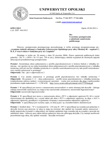 UNIWERSYTET OPOLSKI 45-040 Opole, pl. Kopernika 11A Dział Zamówień Publicznych Tel./Fax. 77 541 5977 / 77 541 6026 e-mail: [email protected] KPB 2/2012 L.dz. DZP: 464/2012 Opole, 05.06.2012 r. Do: Uczestnicy postępowania o udzielenie zamówienia publicznego Dotyczy: postępowania przetargowego prowadzonego w trybie przetargu nieograniczonego pn.: „wymiana stolarki okiennej w budynku Uniwersytetu Opolskiego przy ulicy Oleskiej 48 – segment C, D, E, F oraz 6 okien w budynku przy ul. Czaplaka” Działając w trybie art. 38 ustawy z dnia 29 stycznia 2004r. Prawo zamówień publicznych (tekst jednolity - Dz. U. z 2010 r. Nr 113 poz. 759 ze zm.), Zamawiający udziela wyjaśnień do złożonych zapytań dotyczących przedmiotowego postępowania: Pytanie1. Konstrukcja okien jednoramowa o profilu pięciokomorowym w kolorze białym z wkładką termiczną - nie spotyka się na rynku konstrukcji okien jednoramowych o profilu pięciokomorowym z wkładką termiczną, jeśli już ma być wkładka termiczna to w profilu sześciokomorowym czy taki profil sześciokomorowy można zastosować w przetargu? Odpowiedź: Tak - jak w odpowiedzi nr 2 Pytanie 2. Czy można zastosować w przetargu profil pięciokomorowy bez wkładki termicznej ? Odpowiedź: Do pytania 1 i 2 – okna jednoramowe – profile termo pięciokomorowe z wkładką termiczną (ciepłochronna stalowa ramka) i wzmocnionymi narożami – ważne jest uzyskanie dla okna współczynnika przenikania ciepła maksimum U = 1,5W/m2K http://www.swiat-szkla.pl/content/view/1710/lang,pl/ Pytanie 3. W specyfikacji jest mowa o zastosowaniu nawiewników w ramie okiennej lub skrzydle - Jakiego rodzaju nawiewniki zastosować czy mają to być nawiewniki ciśnieniowe; nawiewniki higrosterowane? Odpowiedź: nawiewniki higrosterowalne Pytanie 4. W specyfikacji jest mowa o zastosowaniu okien z PCV o odporności ogniowej EL 60 w wersji nieotwieranej nie spotkałem się z czymś takim jak okna z PCV o odporności ogniowej, są okna z ALU o odporności ogniowej, prosiłbym o wyjaśnienie związaną z zastosowaniem odporności ogniowej ? Odpowiedź: w specyfikacji jest wyraźny zapis, że okna p.poż. są z kształtowników aluminiowych Pytanie 5. Symbol okna - "6" o wymiarach So - 218 oraz H - 297 w specyfikacji na rysunku jest pokazane w skrzydle lewym oraz prawym, że okna te mają się otwierać; aby spełnić ten warunek należy zastosować dodać poprzeczkę [rysunek w załączniku], nie istnieje spełnienie tego warunku jak na rysunku z powodu nie stabilności okna - uchwyty przy takim dużym gabarycie okna nie udźwigną skrzydła. Czy istnieje możliwość przerobienia tego okna, aby spełnić warunek - skrzydła otwierane? UNIWERSYTET OPOLSKI 45-040 Opole, pl. Kopernika 11A Dział Zamówień Publicznych Tel./Fax. 77 541 5977 / 77 541 6026 e-mail: [email protected] Odpowiedź: Środkową ( centralną ) część okna stanowią drzwi balkonowe ( tarasowe ) rozwierane do środka, wszystkie skrzydła okien mają być rozwierane, wyjątek stanowi środkowe naświetle które ma być uchylne. Na wysokości około 90cm od dołu należy zastosować poprzeczne usztywnienie we wszystkich 3 kwaterach , dolne kwatery mogą być przeszklone lub pełne z zachowaniem parametrów termicznych okna. Zgodnie z załączonym rysunkiem zamiennym zestawienia stolarki – załącznik nr 1 do pisma Pytanie 6. W zestawieniu stolarki przy symbolu "10" oraz "10a" w uwagach jest napisane - "zastosować szkło przeźroczyste, okna antywłamaniowe, system otwierania dostępny od poziomu podłogi" nie rozumiem pojęcia okno antywłamaniowe czy okno antywłamaniowe dotyczy samej ramy okna a szyba w tych oknach ma być podwójna zespolona 4/16/4 czy zastosować tutaj szybę antywłamaniową ? Odpowiedź: zastosować tutaj szybę antywłamaniową Pytanie 7. Jaki system otwierania okna zastosować w pozycjach oznaczonych symbolami [chodzi mi tutaj o okna, które znajdują się na samej górze] - "2a"; "6"; "5"; Czy okna te mają się otwierać na zwykłą klamkę czy trzeba zastosować tutaj system otwierania dostępny z poziomu podłogi ? Odpowiedź: Dopuszcza się otwieranie na zwykłą klamkę – do mycia (uchył 90º) UNIWERSYTET OPOLSKI 45-040 Opole, pl. Kopernika 11A Dział Zamówień Publicznych Tel./Fax. 77 541 5977 / 77 541 6026 e-mail: [email protected] Pytanie 8. Jaki system otwierania okna zastosować w pozycjach oznaczonych symbolami - "12"; "13"; "14"; "15"; Czy okna te mają się otwierać na zwykłą klamkę czy trzeba zastosować tutaj system otwierania dostępny z poziomu podłogi ? Odpowiedź: W rysunku zamiennym otwieranie rozwierne. Wnęki okienne wymienionych okien (z wyjątkiem „12”) posiadają rolety wewnętrzne. W wycenie należy uwzględnić zabezpieczenie rolet istniejących w trakcie robót oraz dostawę i montaż rolet wewnętrznych (nieprzeziernych, niepalnych) dla okien „12 Pytanie 9. Na zestawieniu stolarki okiennej Nr rys. 8 przy symbolach okna - "17"; "18" nie ma pokazane czy te okna mają się uchylać, natomiast w opisie i wyliczeniach dla segmentu E i F jest zapis demontaż i montaż okien uchylnych jednodzielnych z PCV; Czy te okna mają się otwierać czy mają być stałe ? Odpowiedź: uchylne, z możliwością uchyłu do 90º Pytanie 10. Czy istnieje możliwość podesłania zdjęć rzutów planów chodzi mi głównie o wysokość okna od poziomu posadzki - głównie aula ? Odpowiedź: Ani zdjęcia ani rzuty czy widoki elewacji nie pokażą wysokości okna od posadzki. Pytanie 11. W zestawieniu stolarki przy symbolu "10" oraz "10a"na rysunku jest pokazane, że okno to ma być rozwierno-uchylne, natomiast gdy ma być zastosowany system otwierania dostępny od poziomu podłogi nie ma możliwości, aby okno to było rozwierno-uchylne może być tylko uchylne; Czy zastosować tutaj otwieranie okna w systemie uchylnym ? Odpowiedź: okna uchylne - system otwierania dostępny z poziomu podłogi Pytanie 12. W dokumencie Szczegółowa Specyfikacja