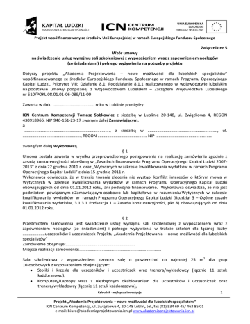 Projekt współfinansowany ze środków Unii Europejskiej w ramach Europejskiego Funduszu Społecznego Załącznik nr 5 Wzór umowy na świadczenie usług wynajmu sali szkoleniowej z wyposażeniem wraz z zapewnieniem noclegów (ze śniadaniami) i pełnego wyżywienia na potrzeby projektu Dotyczy projektu „Akademia Projektowania – nowe możliwości dla lubelskich specjalistów” współfinansowanego ze środków Europejskiego Funduszu Społecznego w ramach Programu Operacyjnego Kapitał Ludzki, Priorytet VIII; Działanie 8.1; Poddziałanie 8.1.1 realizowanego w województwie lubelskim na podstawie umowy podpisanej z Województwem Lubelskim – Zarządem Województwa Lubelskiego nr 510/POKL.08.01.01-06-089/11-00 Zawarta w dniu ………………………..………. roku w Lublinie pomiędzy: ICN Centrum Kompetencji Tomasz Sobkowicz z siedzibą w Lublinie 20-148, ul. Związkowa 4, REGON 430918966, NIP 946-151-23-17 zwanym dalej Zamawiającym, a .……………..…………………………….…….……………......, z siedzibą w ………………….…….……………………….…….., ul. …………………..………..……………..…, REGON ……………….……………….…….. NIP ……………………….….…….............. zwaną/ym dalej Wykonawcą. §1 Umowa została zawarta w wyniku przeprowadzonego postępowania na realizację zamówienia zgodnie z zasadą konkurencyjności określoną w „Zasadach finansowania Programu Operacyjnego Kapitał Ludzki 20072013” z dnia 22 grudnia 2011 r. oraz „Wytycznych w zakresie kwalifikowania wydatków w ramach Programu Operacyjnego Kapitał Ludzki” z dnia 15 grudnia 2011 r. Wykonawca oświadcza, że w trakcie trwania zlecenia nie wystąpi konflikt interesów o którym mowa w Wytycznych w zakresie kwalifikowania wydatków w ramach Programu Operacyjnego Kapitał Ludzki obowiązujących od dnia 01.01.2012 roku, ani podwójne finansowanie. Wykonawca oświadcza, że nie jest podmiotem powiązanym z Zamawiającym osobowo lub kapitałowo w rozumieniu Wytycznych w zakresie kwalifikowania wydatków w ramach Programu Operacyjnego Kapitał Ludzki (Rozdział 3 – Ogólne zasady kwalifikowania wydatków, 3.1.3.1 Podsekcja 1 – Zasada konkurencyjności, pkt 8) obowiązujących od dnia 01.01.2012 roku. §2 Przedmiotem zamówienia jest świadczenie usług wynajmu sali szkoleniowej z wyposażeniem wraz z zapewnieniem noclegów (ze śniadaniami) i pełnego wyżywienia w trakcie szkoleń dla łącznej liczby …………………uczestników i uczestniczek Projektu „Akademia Projektowania – nowe możliwości dla lubelskich specjalistów” Zamówienie obejmuje:……………………………………………………….. Miejsce realizacji zamówienia:………………………………………………………………….. Sala szkoleniowa z wyposażeniem oznacza salę o powierzchni co najmniej 25 m2 dla grup 10-osobowych z wyposażeniem obejmującym: Stoliki i krzesła dla uczestników i uczestniczek oraz trenera/wykładowcy (łącznie 11 sztuk każdorazowo), Komputery/Laptopy wraz z niezbędnym okablowaniem dla uczestników i uczestniczek oraz trenera/wykładowcy (łącznie 11 sztuk każdorazowo), Człowiek - najlepsza inwestycja Projekt „Akademia Projektowania – nowe możliwości dla lubelskich specjalistów” ICN Centrum Kompetencji, ul. Związkowa 4, 20-148 Lublin, tel./fax (81) 534 69 45/ 463 86 01 e-mail: [email protected] www.akademiaprojektowania.icn.pl 1 Projekt współfinansowany ze środków Unii Europejskiej w ramach Europejskiego Funduszu Społecznego Rzutnik i ekran projekcyjny, Flipchart z blokiem kartek i pisakiem, Dostęp do Internetu Sala szkoleniowa nie stanowi jednocześnie sali restauracyjnej. Miejsce podawania posiłków jest inne niż miejsce odbywania się zajęć podczas szkolenia. Wykonawca dysponuje co najmniej 2 salami szkoleniowymi, aby umożliwić przeprowadzenie w jednym terminie zajęć dla dwóch grup równocześnie. Na sprzęcie komputerowym zapewnionym przez Wykonawcę będą instalowane oprogramowania na potrzeby prowadzonych zajęć przez organizatora szkoleń wybranego przez Zamawiającego. Noclegi (ze śniadaniami) oznaczają: Noclegi (ze śniadaniami) w hotelu o standardzie minimum dwugwiazdkowym na terenie województwa lubelskiego/Lublina, w weekendy (z piątku na sobotę i z soboty na niedzielę), Pokoje 1- lub 2-osobowe (z możliwością wykorzystania pokoi 2-osobowych przez jedną osobę) o wysokim standardzie i wyposażeniu wraz z samodzielnymi łazienkami (w ciągu jednego weekendu liczba osób nie przekroczy 40), Śniadania obejmujące co najmniej: o pieczywo ciemne i jasne, o półmiski mięsne (min. 4 rodzaje wędlin, w tym pieczonych), o sery (białe, żółte, pleśniowe), o świeże owoce i warzywa sezonowe, o masło, o mleko, o płatki śniadaniowe (Nestle, Lubella, bądź też równorzędnej kategorii jakościowej), o kawę rozpuszczalną Jacobs Cronat Gold (bądź też równorzędnej kategorii jakościowej) oraz gorącą wodę w termosie, o herbatę czarną Lipton (bądź też równorzędnej kategorii jakościowej) - 2 saszetki na osobę dziennie oraz gorącą wodę w termosie, o cukier i słodzik w op. 5 g. – 4 porcje na osobę dziennie, o śmietankę do kawy 10 g. – 4 szt. na osobę dziennie lub 0,25l mleka na osobę dziennie, o naczynia i sztućce dla każdej osoby. Zamawiający zastrzega sobie prawo do wykorzystania pokoju 2-osobowego przez 1 osobę. Szczegóły co do ilości osób i pokoi będą ustalane ze Wykonawcą najpóźniej tydzień przed planowanym wynajmem. Szczegółowe terminy realizacji zostaną uzgodnione z Wykonawcą i zapisane w umowie. Śniadania powinny być serwowane w formie bufetu szwedzkiego. Szczegółowe menu posiłków zostanie dołączone do umowy do akceptacji Zamawiającego. Nie dopuszcza się podania plastikowych i papierowych naczyń i sztućców. Pełne wyżywienie oznacza: obiad obejmujący co na