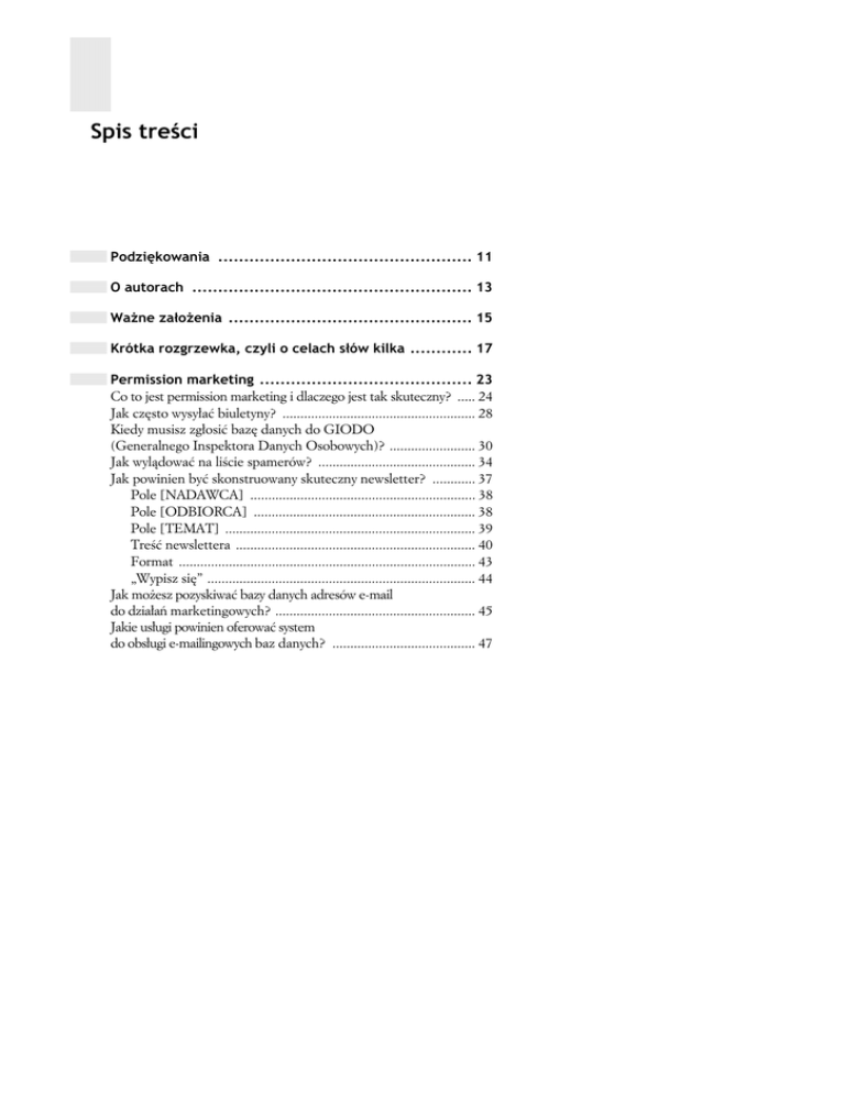 Spis treści Podziękowania ................................................. 11 O autorach ...................................................... 13 Ważne założenia ............................................... 15 Krótka rozgrzewka, czyli o celach słów kilka ............ 17 Permission marketing ......................................... 23 Co to jest permission marketing i dlaczego jest tak skuteczny? ..... 24 Jak często wysyłać biuletyny? ...................................................... 28 Kiedy musisz zgłosić bazę danych do GIODO (Generalnego Inspektora Danych Osobowych)? ........................ 30 Jak wylądować na liście spamerów? ............................................ 34 Jak powinien być skonstruowany skuteczny newsletter? ............ 37 Pole [NADAWCA] ............................................................... 38 Pole [ODBIORCA] .............................................................. 38 Pole [TEMAT] ...................................................................... 39 Treść newslettera ................................................................... 40 Format ................................................................................... 43 „Wypisz się” ........................................................................... 44 Jak możesz pozyskiwać bazy danych adresów e-mail do działań marketingowych? ........................................................ 45 Jakie usługi powinien oferować system do obsługi e-mailingowych baz danych? ........................................ 47 6 E-marketing w akcji Desktop marketing ............................................ 51 W jaki sposób desktop marketing może się przyczynić do realizacji moich celów marketingowych? ............................... 52 Czy desktop marketing to również tapety i wygaszacze? ............ 53 Tapeta interaktywna EMPiK ................................................. 53 BrandMate Agnieszka ........................................................... 54 Aplikacja desktopowa POP ................................................... 55 Oriflame Info ......................................................................... 56 Jakie funkcjonalności powinna zawierać aplikacja desktopmarketingowa? ................................................ 58 Co należy wziąć pod uwagę podczas wdrażania rozwiązania desktopmarketingowego? ........................................ 59 Jak motywować Klientów do instalacji rozwiązania desktopmarketingowego? ........... 60 Jak motywować do instalacji aplikacji? .................................. 61 Co zrobić, aby jak najdłużej komunikować się z Klientem? ......................................................................... 62 Co robić, aby nakłonić Klienta do pożądanej akcji? .............. 63 Jak mierzyć skuteczność rozwiązań desktopmarketingowych? .........64 Marketing wirusowy ........................................... 67 Marketing wirusowy — broń masowego rażenia czy groźny niewypał? ................................................................... 68 Co marketing partyzancki ma wspólnego z marketingiem wirusowym? ....................................................... 72 No dobrze, więc jak się do tego zabrać? ..................................... 73 Jak zbudować dobrego wirusa? ................................................... 77 Viral Spoof — co to takiego? ...................................................... 80 W jakim stopniu czas emisji wirusa może decydować o sukcesie kampanii? ................................................................... 83 Strategiczne planowanie mediów w Internecie ......... 85 Jak rozumieć affinity index i czy jest to ważny wskaźnik? ........... 86 Co to jest współoglądalność i co z niej wynika? .......................... 87 Dlaczego capping nie oznacza ilości kontaktów z kampanią? .... 88 Czym jest średnia częstotliwość? ................................................. 89 Co oznaczają te wszystkie 3-literowe skróty? .............................. 90 Spis treści Osiągnąłem CTR 21%! Czy powinienem być szczęśliwy? ........... 93 Jak mierzyć skuteczność kampanii? ............................................ 94 Skąd biorą się użytkownicy na mojej stronie? ............................. 95 Bonus termin: responsywność ..................................................... 96 Czym kierować się przy doborze formatów do kampanii? .......... 97 Modele zakupu — dlaczego znów 3-literowe terminy? .................... 97 Dokąd powinienem przenosić ruch z kampanii? ........................ 99 O jakich zasadach muszę pamiętać, konstruując produkcję reklamową? .......................................... 102 Co wchodzi w skład wydatków na kampanię i jak podzielić jej budżet? .......................................................... 103 Jakie badania Internetu są wykorzystywane? ............................ 103 Z kim współpracować przy planowaniu kampanii — z agencją, domem mediowym czy bezpośrednio z siecią, portalem, wyszukiwarką? .......................................................... 104 Czy lepiej reklamować się w niszowych serwisach, czy raczej w dużych wortalach i portalach? ............................... 105 Marketing w wyszukiwarkach ..............................107 Zwariuję od tych akronimów. SEM, SEO, PPC — nie można jakoś prościej? ..................................................... 108 Jak powinniśmy mierzyć skuteczność kampanii w wyszukiwarkach internetowych? ............................................ 116 Jak mierzyć skuteczność działań w danym okresie? ............ 118 Czy warto reklamować się w innych wyszukiwarkach niż Google? .. 120 Kampania sprzedażowa ....................................................... 121 Kampania trafficowa ............................................................ 121 Kampania wizerunkowa ..................