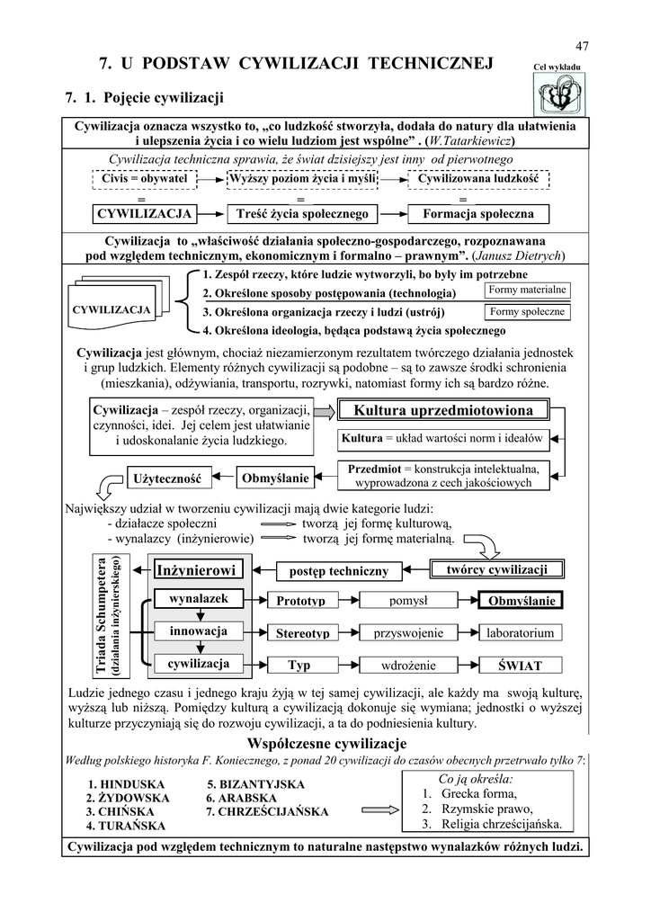 47 7. U PODSTAW CYWILIZACJI TECHNICZNEJ Cel wykładu 7. 1. Pojęcie cywilizacji Cywilizacja oznacza wszystko to, „co ludzkość stworzyła, dodała do natury dla ułatwienia i ulepszenia Ŝycia i co wielu ludziom jest wspólne” . (W.Tatarkiewicz) Cywilizacja techniczna sprawia, Ŝe świat dzisiejszy jest inny od pierwotnego Civis = obywatel WyŜszy poziom Ŝycia i myśli Cywilizowana ludzkość = CYWILIZACJA = Treść Ŝycia społecznego = Formacja społeczna Cywilizacja to „właściwość działania społeczno-gospodarczego, rozpoznawana pod względem technicznym, ekonomicznym i formalno – prawnym”. (Janusz Dietrych) 1. Zespół rzeczy, które ludzie wytworzyli, bo były im potrzebne CYWILIZACJA 2. Określone sposoby postępowania (technologia) Formy materialne 3. Określona organizacja rzeczy i ludzi (ustrój) Formy społeczne 4. Określona ideologia, będąca podstawą Ŝycia społecznego Cywilizacja jest głównym, chociaŜ niezamierzonym rezultatem twórczego działania jednostek i grup ludzkich. Elementy róŜnych cywilizacji są podobne – są to zawsze środki schronienia (mieszkania), odŜywiania, transportu, rozrywki, natomiast formy ich są bardzo róŜne. Kultura uprzedmiotowiona Cywilizacja – zespół rzeczy, organizacji, czynności, idei. Jej celem jest ułatwianie i udoskonalanie Ŝycia ludzkiego. Kultura = układ wartości norm i ideałów Obmyślanie Przedmiot = konstrukcja intelektualna, wyprowadzona z cech jakościowych UŜyteczność Triada Schumpetera (działania inŜynierskiego) Największy udział w tworzeniu cywilizacji mają dwie kategorie ludzi: - działacze społeczni tworzą jej formę kulturową, - wynalazcy (inŜynierowie) tworzą jej formę materialną. InŜynierowi twórcy cywilizacji postęp techniczny wynalazek Prototyp pomysł Obmyślanie innowacja Stereotyp przyswojenie laboratorium cywilizacja Typ wdroŜenie ŚWIAT Ludzie jednego czasu i jednego kraju Ŝyją w tej samej cywilizacji, ale kaŜdy ma swoją kulturę, wyŜszą lub niŜszą. Pomiędzy kulturą a cywilizacją dokonuje się wymiana; jednostki o wyŜszej kulturze przyczyniają się do rozwoju cywilizacji, a ta do podniesienia kultury. Współczesne cywilizacje Według polskiego historyka F. Koniecznego, z ponad 20 cywilizacji do czasów obecnych przetrwało tylko 7: 1. HINDUSKA 2. śYDOWSKA 3. CHIŃSKA 4. TURAŃSKA 5. BIZANTYJSKA 6. ARABSKA 7. CHRZEŚCIJAŃSKA Co ją określa: 1. Grecka forma, 2. Rzymskie prawo, 3. Religia chrześcijańska. Cywilizacja pod względem technicznym to naturalne następstwo wynalazków róŜnych ludzi. 48 7. 2. Cywilizacja przedmaszynowa Cywilizacja zmienia się w wyniku postępu technicznego, wyraŜającego się wprowadzaniem do procesu produkcji nowych materiałów, udoskonalonych maszyn i sposobów obróbki Biorąc pod uwagę dominujący rodzaj materiału i sposób jego obróbki moŜna wyróŜnić trzy okresy: 1. Cywilizacja przedmaszynowa („cywilizacja „drewna”), orientacyjnie – do końca X wieku, 2. Cywilizacja - maszynowa („cywilizacja metalu”), ‘’ – do końca XX wieku, 3. Cywilizacja postmaszynowa („cywilizacja plastiku”) ‘’ – rozpoczyna się obecnie . Podstawy materialne cywilizacji przedmaszynowej oparte są na drewnie Z chwilą wynalezienia kamiennej siekiery, ścinanie drzew stało się zadaniem stosunkowo łatwym. Sukcesy, jakie człowiek w tym względzie osiągnął, tłumaczy do pewnego stopnia materiał, którym się posługiwał. Drewno to surowiec szczególny: Kora Łyko Miazga Biel Twardziel Rdzeń Słój Promień Przekrój pnia sosny *Jaki inny materiał odznacza się tak charakterystycznymi cechami w szerokim zakresie rozmiarów i daje się łupać niemal bez końca najprostszymi narzędziami? *Jaki inny materiał moŜna tak łatwo transportować? *Jaki inny materiał moŜe dać poŜywienie, ciepło i ochronę? *Jaki inny materiał moŜe być tak mocno odtwarzalny? *Jaki inny materiał jest podstawą róŜnorodnych konstrukcji? Jak podaje prof. W. Dzbeński („Przegląd Techniczny 26/2005”) drewno ma obecnie 20-30 tys. zastosowań! Drewno jest materiałem palnym, właściwość ta była dla postępu początkowo bardziej istotna i korzystniejsza niŜ inne jego cechy (ogień był bowiem niewątpliwie największym pierwotnym osiągnięciem ludzkości). Drewno wyzwoliło człowieka z niewoli jaskiń i zabezpieczyło przed chłodem ziemi. NajwaŜniejsze osiągnięcia przedmaszynowego postępu technicznego przypisać naleŜy zmyślności człowieka lasu, związanego z obróbką drewna. Człowiek lasu to nie zwykły drwal, który przerzedza lasy i dostarcza paliwa. Jest on wraz z górnikiem i kowalem protoplastą inŜyniera; bez jego kunsztu praca górnika i murarza byłaby utrudniona, a postęp w tych zawodach spowolniony. To człowiek lasu wynalazł: koło garncarskie, koło do wozu, koło młyńskie, kołowrotek, a przede wszystkim najwspanialszą obrabiarkę – tokarkę. Pozwalała ona bowiem wytworzyć oś (aby dowolny pojazd ciągnięty mógł zakręcać, jego przednia oś musi obracać się na sworzniu). Przyjmuje się, Ŝe układ „koło – oś” jest podstawą techniki, bowiem to on pozwolił zamienić ruch postępowo-zwrotny na ruch obrotowy. Łódź i wóz są szczytowym wkładem człowieka lasu w dziedzinę transportu, natomiast beczka, przy której budowie kołodzieje pomysłowo wykorzystali ściskanie i rozciąganie dla osiągnięcia wodoszczelności, stanowi jeden z najbardziej pomysłowych sprzętów uŜytecznych człowiekowi. Jest bowiem trwalsza i lŜejsza od uŜywanych naczyń glinianych. Kołodziejstwo i bednarstwo to podstawowe rzemiosła cywilizacji drewna. PoniewaŜ drewno jest najbardziej róŜnorodnym, najłatwiejszym do kształtowania i najpoŜyteczniejszym materiałem technologicznym, a do jego obróbki moŜna stosować najrozmaitsze techniki: strugać, piłować, toczyć, rzeźbić łupać, skrawać warstwami, a nawet zmiękczać i giąć, nic więc dziwnego, Ŝe człowiek nada