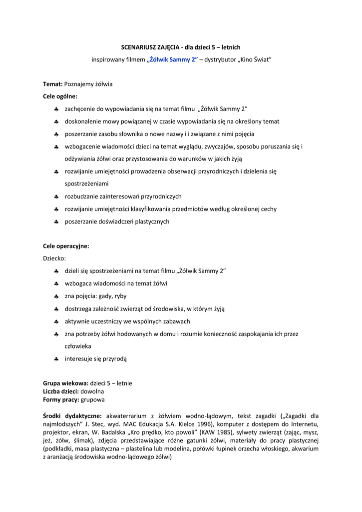 SCENARIUSZ ZAJĘCIA - dla dzieci 5 – letnich inspirowany filmem „Żółwik Sammy 2” – dystrybutor „Kino Świat” Temat: Poznajemy żółwia Cele ogólne: zachęcenie do wypowiadania się na temat filmu „Żółwik Sammy 2” doskonalenie mowy powiązanej w czasie wypowiadania się na określony temat poszerzanie zasobu słownika o nowe nazwy i i związane z nimi pojęcia wzbogacenie wiadomości dzieci na temat wyglądu, zwyczajów, sposobu poruszania się i odżywiania żółwi oraz przystosowania do warunków w jakich żyją rozwijanie umiejętności prowadzenia obserwacji przyrodniczych i dzielenia się spostrzeżeniami rozbudzanie zainteresowań przyrodniczych rozwijanie umiejętności klasyfikowania przedmiotów według określonej cechy poszerzanie doświadczeń plastycznych Cele operacyjne: Dziecko: dzieli się spostrzeżeniami na temat filmu „Żółwik Sammy 2” wzbogaca wiadomości na temat żółwi zna pojęcia: gady, ryby dostrzega zależność zwierząt od środowiska, w którym żyją aktywnie uczestniczy we wspólnych zabawach zna potrzeby żółwi hodowanych w domu i rozumie konieczność zaspokajania ich przez człowieka interesuje się przyrodą Grupa wiekowa: dzieci 5 – letnie Liczba dzieci: dowolna Formy pracy: grupowa Środki dydaktyczne: akwaterrarium z żółwiem wodno-lądowym, tekst zagadki („Zagadki dla najmłodszych” J. Stec, wyd. MAC Edukacja S.A. Kielce 1996), komputer z dostępem do Internetu, projektor, ekran, W. Badalska „Kro prędko, kto powoli” (KAW 1985), sylwety zwierząt (zając, mysz, jeż, żółw, ślimak), zdjęcia przedstawiające różne gatunki żółwi, materiały do pracy plastycznej (podkładki, masa plastyczna – plastelina lub modelina, połówki łupinek orzecha włoskiego, akwarium z aranżacją środowiska wodno-lądowego żółwi) PRZEBIEG: 1. Nawiązanie do filmu „Żółwik Sammy 2” swobodne wypowiedzi dzieci na temat filmu zachęcenie do rozwiązania zagadki i odkrycia nagrody ukrytej za parawanem „Jest leniwy wielce, krok wolno odmierza. Chodzi w kamizelce z twardego pancerza.” (żółw) 2. Odkrycie niespodzianki – akwaterrarium z żółwiem wyjaśnienie pojęcia: akwaterrarium zwrócenie uwagi na budowę akwaterrarium (odpowiednia ilość wody, filtry, grzałka, oświetlenie, wyspa) Wiwarium - ogólna nazwa sztucznego pomieszczenia służącego do przetrzymywania drobnych zwierząt lub roślin w warunkach maksymalnie zbliżonych do naturalnych, w celu ich prezentacji, chowu, hodowli lub badań. Terrarium – wiwarium przeznaczone do hodowli przeważnie płazów i gadów, ale także bezkręgowców, przystosowane do ich wymagań w naturalnych środowiskach. Akwaterrarium – odmiana wiwarium zawierająca wycinek przestrzeni wodnej i część służącą jako ląd. Przeznaczone do hodowli zwierząt wodno-lądowych takich jak np. żółwie wodno-lądowe. Najczęściej jest to akwarium wypełnione wodą, a część lądową stanowi podwieszana lub pływająca wysepka, bądź wystające z wody góry kamieni lub korzenie. 3. Obserwacja żółwia w akwaterrarium lub filmu video na serwisie internetowym YouTube „Żółw żółtlicy i czerwonolicy” http://www.youtube.com/watch?v=iDLteyDTkIY&NR=1&feature=endscreen dzielenie się spostrzeżeniami na temat wyglądu żółwia określanie budowy zwrócenie uwagi na sposób poruszania się, odżywiania, przystosowania do środowiska wodno-lądowego poznanie zasad opiekowania się żółwiem Żółwie - charakteryzują się obecnością pancerza chroniącego cały tułów. Wśród żółwi spotyka się zwierzęta zarówno mięsożerne, jak i roślinożerne, wodne i lądowe. Mają rogowy dziób, w którym zamiast zębów są ostre rogowe listwy na krawędziach szczęki i żuchwy, które u gatunków mięsożernych są ostre jak noże a działają jak nożyce, natomiast u gatunków roślinożernych ich zewnętrzne krawędzie są ząbkowane co ułatwia im odgryzanie twardych, zdrewniałych części roślin. Wszystkie żółwie są jajorodne; samice kopią tylnymi odnóżami dołki w gruncie, gdzie znoszą jaja. Występują na wszystkich kontynentach z wyjątkiem Antarktydy. Jedynym żółwiem występującym na terenie Polski w granicach swojego naturalnego obszaru występowania jest żółw błotny. 4. Zabawa „Żółwie” (wg K.W. Vopla) dzieci spacerują na czworakach po dywanie i wyobrażają sobie, że są żółwiami; kiedy usłyszą klaśnięcie, zatrzymują się i chowają się swoich pancerzach (podnoszą wysoko barki i przyciskają brodę do klatki piersiowej); gdy jest cicho, wolno wyciągają szyje ze swoich skorup i podnoszą powoli głowy do góry, rozglądając się dookoła, czy są bezpieczne. 5. Słuchanie opowiadania W. Badalskiej „Kto prędko, kto powoli” ilustrowanej sylwetami zwierząt: określanie, które ze zwierząt było szybsze, które wolniejsze, które porusza się prędko, a które powoli układanie sylwet zwierząt w kolejności, zaczynając od tego, które porusza się najszybciej: zając, mysz, jeż, żółw, ślimak 6. Oglądanie zdjęć przedstawiających różne gatunki żółwi: określanie różnic i podobieństw między żółwiami zwrócenie uwagi na fakt, że żółw jest gadem zapoznanie z pojęciem: gady przedstawienie różnic i podobieństw między gadem a rybą żółw lądowy żółw grecki żółw stepowy żółw wodno-lądowy żółw pustynny żółw morski 7. Praca plastyczna „Mój żółw”: lepienie z plasteliny (lub modeliny) żółwia kolorowanie flamastrami, mazakami lub pastelami pancerza (połówka łupinki orzecha włoskiego) przymocowanie pancerza żółwia w odpowiednim miejscu nadanie żółwiowi imienia umieszczenie w akwaterrarium (akwarium z aranżacją środowiska wodnolądowego żółwi) prezentacja prac dzieci na wystawie dla rodziców ……………………………………………………………………………………………… Opracowała: mgr Wiesława Twardowska SCENARIUSZ 