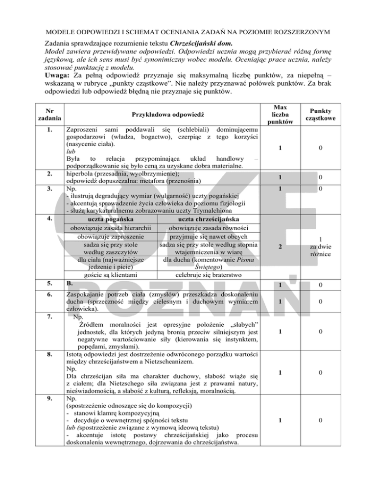 MODELE ODPOWIEDZI I SCHEMAT OCENIANIA ZADAŃ NA POZIOMIE ROZSZERZONYM Zadania sprawdzające rozumienie tekstu Chrześcijański dom. Model zawiera przewidywane odpowiedzi. Odpowiedzi ucznia mogą przybierać różną formę językową, ale ich sens musi być synonimiczny wobec modelu. Oceniając prace ucznia, należy stosować punktację z modelu. Uwaga: Za pełną odpowiedź przyznaje się maksymalną liczbę punktów, za niepełną – wskazaną w rubryce „punkty cząstkowe”. Nie należy przyznawać połówek punktów. Za brak odpowiedzi lub odpowiedź błędną nie przyznaje się punktów. Nr zadania 1. 2. 3. 4. 5. 6. 7. 8. 9. Przykładowa odpowiedź Zaproszeni sami poddawali się (schlebiali) dominującemu gospodarzowi (władza, bogactwo), czerpiąc z tego korzyści (nasycenie ciała). lub Była to relacja przypominająca układ handlowy – podporządkowanie się było ceną za uzyskane dobra materialne. hiperbola (przesadnia, wyolbrzymienie); odpowiedź dopuszczalna: metafora (przenośnia) Np. - ilustrują degradujący wymiar (wulgarność) uczty pogańskiej - akcentują sprowadzenie życia człowieka do poziomu fizjologii - służą karykaturalnemu zobrazowaniu uczty Trymalchiona uczta pogańska uczta chrześcijańska obowiązuje zasada hierarchii obowiązuje zasada równości obowiązuje zaproszenie przyjmuje się nawet obcych sadza się przy stole sadza się przy stole według stopnia według zaszczytów wtajemniczenia w wiarę dla ciała (najważniejsze dla ducha (komentowanie Pisma jedzenie i picie) Świętego) goście są klientami celebruje się braterstwo B. Zaspokajanie potrzeb ciała (zmysłów) przeszkadza doskonaleniu ducha (sprzeczność między cielesnym i duchowym wymiarem człowieka). Np. Źródłem moralności jest opresyjne położenie „słabych” jednostek, dla których jedyną bronią przeciw silniejszym jest negatywne wartościowanie siły (kierowania się instynktem, popędami, zmysłami). Istotą odpowiedzi jest dostrzeżenie odwróconego porządku wartości między chrześcijaństwem a Nietzscheanizem. Np. Dla chrześcijan siła ma charakter duchowy, słabość wiąże się z ciałem; dla Nietzschego siła związana jest z prawami natury, nieświadomością, a słabość z kulturą, refleksją, moralnością. Np. (spostrzeżenie odnoszące się do kompozycji) - stanowi klamrę kompozycyjną - decyduje o wewnętrznej spójności tekstu lub (spostrzeżenie związane z wymową ideową tekstu) - akcentuje istotę postawy chrześcijańskiej jako procesu doskonalenia wewnętrznego, dojrzewania do chrześcijaństwa. Max liczba punktów Punkty cząstkowe 1 0 1 0 1 0 2 1 za dwie różnice 1 0 1 0 1 0 1 0 1 0 Temat 1. Zanalizuj wypowiedzi bohaterów Rozmowy lirycznej Konstantego Ildefonsa Gałczyńskiego i Wesela Stanisława Wyspiańskiego. Porównaj relacje uczuciowe między rozmówcami, zwracając uwagę na poetykę wyznania. I. ROZWINIĘCIE TEMATU (można uzyskać maksymalnie 26 punktów) 1. Rozpoznanie zasady doboru tekstów, np.: a. są to rozmowy par związanych ze sobą uczuciowo (prawdziwie/ pozornie), b. bohaterowie wyznają miłość partnerce, c. teksty są odmienne rodzajowo i gatunkowo, d. utrzymane są w odmiennej konwencji językowej. Rozmowa liryczna 2. Sytuacja komunikacyjna, np.: a. podmiot liryczny – zakochany mężczyzna, b. „ty” liryczne – ukochana kobieta, c. monolog liryczny z elementami dialogu, d. intymność sceny wyznania, e. konwencja flirtu. 3. Funkcjonalna analiza języka, np.: a. rozmówcy posługują się tym samym kodem, b. język potoczny współistnieje z poetyckim, c. dominuje funkcja poetycka: d. wyliczenia (w bzach i w brzozach, i w malinach), e. peryfraza (włosy grzebieniem rozdzielisz), f. porównanie (jak treść lata), g. metafora (zima posrebrzy ramy okien), h. stylizacja na język mówiony, i. eliptyczna składnia. 4. Charakterystyka uczucia, np. a. szczere, b. połączone z akceptacją drugiej osoby, c. niezależne od okoliczności życiowych, d. poparte zrozumieniem i przyjaźnią. Wesele 5. Sytuacja komunikacyjna, np.: a. rozmowa ma miejsce w czasie wesela bohaterów, b. przedstawienie bohaterów: poeta młodopolski-ludoman i wiejska dziewczyna, c. bohaterowie reprezentują odmienne kultury, mentalności, d. rozmówcy nie rozumieją intencji wypowiedzi partnera, e. kontrast zestawień (bohaterów, języka) źródłem satyryczności sceny. 6. Funkcjonalna analiza języka, np.: a. bohaterowie posługują się różnymi kodami, b. Pan Młody posługuje się stylem poetyckim; stosuje: c. porównania (jak mi serce wali młotem), d. metafory (światłem gorą lica), e. wyliczenia (zapaseczka, gors, spódnica), f. epitety (sercem złotem), g. Panna Młoda posługuje się gwarą, cechy stylizacji jej języka: h. mazurzenie (moze), i. ścieśnienie samogłosek (godos), j. charakterystyczne formy fleksyjne (trza), k. dialektyzmy (ciegiem, ino, juści), l. dosadność wypowiedzi. Punktacja: 0-3 0-3 0-5 0-2 0-3 0-5 7. Charakterystyka uczucia, np.: a. nie jest poparte duchową bliskością partnerów, b. Panna Młoda jest znudzona mówieniem o miłości, c. Pan Młody patrzy na uczucie przez pryzmat poezji. 8. Wnioski Pełne, np. powinny dotyczyć związku między sposobem mówienia o uczuciu a charakterem miłości ujętego w kontekstach (historycznoliterackim, teoretycznoliterackim, językowym). Częściowe, np.: dostrzeżenie związku między sposobem mówienia o uczuciu a jego charakterem. Próba podsumowania, np.: dostrzeżenie różnic między porównywanymi utworami. 0-2 3 (2) (1) Temat 2. Interpretując fraszkę Jana Kochanowskiego O żywocie ludzkim i fragment Traktatu teologicznego Czesława Miłosza, porównaj refleksje poetów na temat świata i człowieka. I. ROZWINIĘCIE TEMATU (można uzyskać maksymalnie 26 punktów) 1. Zasada zestawienia tekstów, np.: a. teksty z odległych czasowo epok, b. zróżnicowane gatunkowo (fraszka, poemat), c. odmienne pod względem wersyfikacji (wiersz sylabiczny, wiersz wol