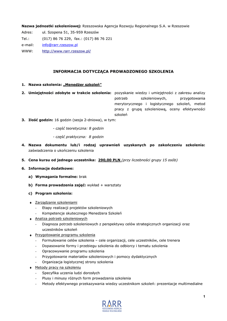 Nazwa jednostki szkoleniowej: Rzeszowska Agencja Rozwoju Regionalnego S.A. w Rzeszowie Adres: ul. Szopena 51, 35-959 Rzeszów Tel.: (017) 86 76 229, fax.: (017) 86 76 221 e-mail: [email protected] WWW: http://www.rarr.rzeszow.pl/ INFORMACJA DOTYCZĄCA PROWADZONEGO SZKOLENIA 1. Nazwa szkolenia: „Menedżer szkoleń” 2. Umiejętności zdobyte w trakcie szkolenia: pozyskanie wiedzy i umiejętności z zakresu analizy potrzeb szkoleniowych, merytorycznego i logistycznego przygotowania szkoleń, metod pracy z grupą szkoleniową, oceny efektywności szkoleń 3. Ilość godzin: 16 godzin (sesja 2-dniowa), w tym: - część teoretyczna: 8 godzin - część praktyczna: 8 godzin 4. Nazwa dokumentu lub/i rodzaj uprawnień uzyskanych po zakończeniu szkolenia: zaświadczenia o ukończeniu szkolenia 5. Cena kursu od jednego uczestnika: 290,00 PLN (przy liczebności grupy 15 osób) 6. Informacje dodatkowe: a) Wymagania formalne: brak b) Forma prowadzenia zajęć: wykład + warsztaty c) Program szkolenia: Zarządzanie szkoleniami - Etapy realizacji projektów szkoleniowych - Kompetencje skutecznego Menedżera Szkoleń Analiza potrzeb szkoleniowych - Diagnoza potrzeb szkoleniowych z perspektywy celów strategicznych organizacji oraz uczestników szkoleń Przygotowanie programu szkolenia - Formułowanie celów szkolenia – cele organizacji, cele uczestników, cele trenera - Dopasowanie formy i przebiegu szkolenia do odbiorcy i tematu szkolenia - Opracowywanie programu szkolenia - Przygotowanie materiałów szkoleniowych i pomocy dydaktycznych - Organizacja logistycznej strony szkolenia Metody pracy na szkoleniu - Specyfika uczenia ludzi dorosłych - Plusy i minusy różnych form prowadzenia szkolenia - Metody efektywnego przekazywania wiedzy uczestnikom szkoleń: prezentacje multimedialne 1 - Metody rozwoju umiejętności: ćwiczenia indywidualne, analiza case study, symulacje rzeczywistych sytuacji zawodowych i pozazawodowych uczestników - Metody budowania postaw uczestników szkoleń: dyskusje grupowe, moderacje wizualne Praca z grupą szkoleniową - Metody nawiązywania kontaktu z grupą szkoleniową i motywowania uczestników szkoleń do aktywnego udziału w zajęciach - Techniki komunikacyjne wspierające proces szkoleniowy – techniki aktywnego słuchania, precyzyjnego przekazywania informacji, prowadzenia dyskusji grupowych - Sposoby radzenia sobie w trudnych sytuacjach w trakcie szkolenia Ocena efektywności szkolenia d) Wykładowcy: pracownicy Rzeszowskiej Agencji Rozwoju Regionalnego S.A. w Rzeszowie 2