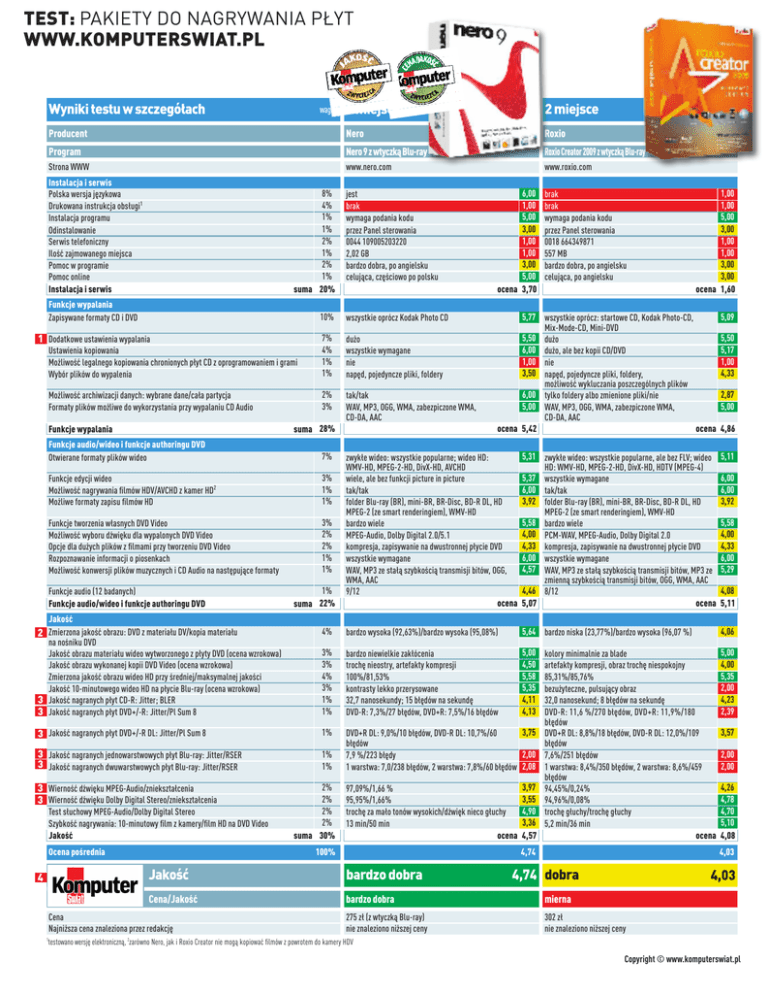 TEST: PAKIETY DO NAGRYWANIA PŁYT WWW.KOMPUTERSWIAT.PL Wyniki testu w szczegółach 1 miejsce 2 miejsce Producent Nero Roxio Program Nero 9 z wtyczką Blu-ray Roxio Creator 2009 z wtyczką Blu-ray Strona WWW www.nero.com www.roxio.com Instalacja i serwis Polska wersja językowa Drukowana instrukcja obsługi1 Instalacja programu Odinstalowanie Serwis telefoniczny Ilość zajmowanego miejsca Pomoc w programie Pomoc online Instalacja i serwis waga jest brak wymaga podania kodu przez Panel sterowania 0044 109005203220 2,02 GB bardzo dobra, po angielsku celująca, częściowo po polsku 6,00 1,00 5,00 3,00 1,00 1,00 3,00 5,00 ocena 3,70 10% wszystkie oprócz Kodak Photo CD Ustawienia kopiowania Możliwość legalnego kopiowania chronionych płyt CD z oprogramowaniem i grami Wybór plików do wypalenia 7% 4% 1% 1% dużo wszystkie wymagane nie napęd, pojedyncze pliki, foldery Możliwość archiwizacji danych: wybrane dane/cała partycja Formaty plików możliwe do wykorzystania przy wypalaniu CD Audio 2% 3% tak/tak WAV, MP3, OGG, WMA, zabezpiczone WMA, CD-DA, AAC 5,77 wszystkie oprócz: startowe CD, Kodak Photo-CD, Mix-Mode-CD, Mini-DVD 5,50 dużo 6,00 dużo, ale bez kopii CD/DVD 1,00 nie 3,50 napęd, pojedyncze pliki, foldery, możliwość wykluczania poszczególnych plików 6,00 tylko foldery albo zmienione pliki/nie 5,00 WAV, MP3, OGG, WMA, zabezpiczone WMA, CD-DA, AAC ocena 5,42 ocena 8% 4% 1% 1% 2% 1% 2% 1% suma 20% Funkcje wypalania Zapisywane formaty CD i DVD 1 Dodatkowe ustawienia wypalania Funkcje wypalania suma 28% Funkcje audio/wideo i funkcje authoringu DVD Otwierane formaty plików wideo 7% Funkcje edycji wideo Możliwość nagrywania filmów HDV/AVCHD z kamer HD2 Możliwe formaty zapisu filmów HD 3% 1% 1% Funkcje tworzenia własnych DVD Video Możliwość wyboru dźwięku dla wypalonych DVD Video Opcje dla dużych plików z filmami przy tworzeniu DVD Video Rozpoznawanie informacji o piosenkach Możliwość konwersji plików muzycznych i CD Audio na następujące formaty 3% 2% 2% 1% 1% brak brak wymaga podania kodu przez Panel sterowania 0018 664349871 557 MB bardzo dobra, po angielsku celująca, po angielsku 1,00 1,00 5,00 3,00 1,00 1,00 3,00 3,00 ocena 1,60 5,09 5,50 5,17 1,00 4,33 2,87 5,00 4,86 zwykłe wideo: wszystkie popularne; wideo HD: WMV-HD, MPEG-2-HD, DivX-HD, AVCHD wiele, ale bez funkcji picture in picture tak/tak folder Blu-ray (BR), mini-BR, BR-Disc, BD-R DL, HD MPEG-2 (ze smart renderingiem), WMV-HD bardzo wiele MPEG-Audio, Dolby Digital 2.0/5.1 kompresja, zapisywanie na dwustronnej płycie DVD wszystkie wymagane WAV, MP3 ze stałą szybkością transmisji bitów, OGG, WMA, AAC 9/12 ocena 5,31 zwykłe wideo: wszystkie popularne, ale bez FLV; wideo HD: WMV-HD, MPEG-2-HD, DivX-HD, HDTV (MPEG-4) 5,37 wszystkie wymagane 6,00 tak/tak 3,92 folder Blu-ray (BR), mini-BR, BR-Disc, BD-R DL, HD MPEG-2 (ze smart renderingiem), WMV-HD 5,58 bardzo wiele 4,00 PCM-WAV, MPEG-Audio, Dolby Digital 2.0 4,33 kompresja, zapisywanie na dwustronnej płycie DVD 6,00 wszystkie wymagane 4,57 WAV, MP3 ze stałą szybkością transmisji bitów, MP3 ze zmienną szybkością transmisji bitów, OGG, WMA, AAC 4,46 8/12 5,07 ocena 4,08 5,11 4% bardzo wysoka (92,63%)/bardzo wysoka (95,08%) 5,64 bardzo niska (23,77%)/bardzo wysoka (96,07 %) 4,06 3% 3% 4% 3% 1% 1% bardzo niewielkie zakłócenia trochę nieostry, artefakty kompresji 100%/81,53% kontrasty lekko przerysowane 32,7 nanosekundy; 15 błędów na sekundę DVD-R: 7,3%/27 błędów, DVD+R: 7,5%/16 błędów 5,00 4,50 5,58 5,35 4,11 4,13 5,00 4,00 5,35 2,00 4,23 2,39 3 Jakość nagranych płyt DVD+/-R DL: Jitter/Pl Sum 8 1% 3 Jakość nagranych jednowarstwowych płyt Blu-ray: Jitter/RSER 3 Jakość nagranych dwuwarstwowych płyt Blu-ray: Jitter/RSER 1% 1% 3,75 DVD+R DL: 9,0%/10 błędów, DVD-R DL: 10,7%/60 błędów 2,00 7,9 %/223 błędy 1 warstwa: 7,0/238 błędów, 2 warstwa: 7,8%/60 błędów 2,08 Funkcje audio (12 badanych) Funkcje audio/wideo i funkcje authoringu DVD 1% suma 22% 5,11 6,00 6,00 3,92 5,58 4,00 4,33 6,00 5,29 Jakość 2 Zmierzona jakość obrazu: DVD z materiału DV/kopia materiału na nośniku DVD Jakość obrazu materiału wideo wytworzonego z płyty DVD (ocena wzrokowa) Jakość obrazu wykonanej kopii DVD Video (ocena wzrokowa) Zmierzona jakość obrazu wideo HD przy średniej/maksymalnej jakości Jakość 10-minutowego wideo HD na płycie Blu-ray (ocena wzrokowa) 3 Jakość nagranych płyt CD-R: Jitter; BLER 3 Jakość nagranych płyt DVD+/-R: Jitter/Pl Sum 8 3 Wierność dźwięku MPEG-Audio/zniekształcenia 3 Wierność dźwięku Dolby Digital Stereo/zniekształcenia Test słuchowy MPEG-Audio/Dolby Digital Stereo Szybkość nagrywania: 10-minutowy film z kamery/film HD na DVD Video Jakość Ocena pośrednia 4 2% 2% 2% 2% suma 30% 97,09%/1,66 % 95,95%/1,66% trochę za mało tonów wysokich/dźwięk nieco głuchy 13 min/50 min ocena 100% 3,97 3,55 4,90 3,36 4,57 kolory minimalnie za blade artefakty kompresji, obraz trochę niespokojny 85,31%/85,76% bezużyteczne, pulsujący obraz 32,0 nanosekund; 8 błędów na sekundę DVD-R: 11,6 %/270 błędów, DVD+R: 11,9%/180 błędów DVD+R DL: 8,8%/18 błędów, DVD-R DL: 12,0%/109 błędów 7,6%/251 błędów 1 warstwa: 8,4%/350 błędów, 2 warstwa: 8,6%/459 błędów 94,45%/0,24% 94,96%/0,08% trochę głuchy/trochę głuchy 5,2 min/36 min ocena 4,74 2,00 2,00 4,26 4,78 4,70 5,10 4,08 4,03 Jakość bardzo dobra Cena/Jakość bardzo dobra mierna 275 zł (z wtyczką Blu-ray) nie znaleziono niższej ceny 302 zł nie znaleziono niższej ceny Cena Najniższa cena znaleziona przez redakcję 3,57 4,74 dobra 4,03 1 testowano wersję elektroniczną, 2zarówno Nero, jak i Roxio Creator nie mogą kopiować filmów z powrotem do kamery HDV Copyright © www.komputerswiat.pl