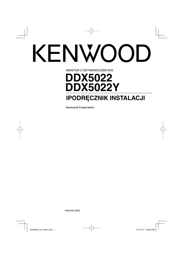 MONITOR Z ODTWARZACZEM DVD DDX5022 DDX5022Y IPODRĘCZNIK INSTALACJI Polish/00 (KEE) DDX5022_Inst_Polish.indd 1 07.12.27 7:36:29 PM Akcesoria 1 ..........1 2 ..........2 3 ..........1 2 | DDX5022/DDX5022Y DDX5022_Inst_Polish.indd 2 07.12.27 7:36:29 PM Procedura instalacji 1. Aby zapobiec zwarciom, wyjmij kluczyki samochodu ze stacyjki i odłącz końcówkę akumulatora. 2. Podłącz poprawny przewód wejścia i wyjścia do obu urządzeń. 3. Podłącz przewód z wiązki kabli. 4. Połącz złącze B wiązki kabli z wtyczką głośnika w twoim samochodzie. 5. Połącz złącze A wiązki kabli z zewnętrzną wtyczką zasilania w twoim samochodzie. 6. Połącz złącze wiązki kabli z urządzeniem. 7. Zainstaluj urządzenie w samochodzie. 8. Podłącz zacisk - akumulatora. 9. Naciśnij przycisk reset. 2 OSTRZEŻENIE • Połączenie przewodu zapłonu (czerwony) i przewodu akumulatora (żółty) do podwozia samochodu (masy) może spowodować zwarcie i pożar. Zawsze należy łączyć te przewody ze źródłem zasilania poprzez skrzynkę bezpieczników. ¤ • Instalacja i podłączenie tego urządzenia wymaga odpowiednich zdolności i doświadczenia. Ze względów bezpieczeństwa instalację i podłączenie urządzenia musi przeprowadzić kwalifikowana osoba. • Nie zapomnij uziemić urządzenia do ujemnego bieguna zasilania 12V DC. • Nie instaluj urządzenia w miejscu, które jest wystawione na bezpośrednie działanie promieni słonecznych, na działanie zbytniego ciepła lub wysokiej wilgotności. Unikaj również miejsc nadmiernie zakurzonych czy narażonych na rozbryzgi wody. • Nie należy używać własnych śrub. Stosuj tylko śruby załączone do urządzenia. Użycie nieprawidłowych śrub może uszkodzić urządzenie. • Jeśli zasilanie nie jest włączone (wyświetlane jest “PROTECT”), przewód głośnika może mieć zwarcie lub dotykać podwozia pojazdu, z powodu czego mogła zostać włączona funkcja ochrony. Sprawdź przewód głośnika. • Upewnij się czy wszystkie podłączenia są pewne wkładając końcówki tak aż zamkną się całkowicie. • Jeżeli układ zapłonowy w twoim samochodzie nie posiada pozycji ACC, albo przewód zapłonu jest podłączony do źródła zasilania o stałym napięciu, takiego jak przewód akumulatora, zasilanie nie będzie sprzężone z zapłonem (tzn. nie będzie włączane ani wyłączane razem z zapłonem). Jeżeli chcesz połączyć włączenie zasilania radioodtwarzacza z zapłonem, podłącz przewód zapłonu do źródła zasilania, które może być włączone i wyłączone kluczem zapłonu. • Użyj dostępnej w sprzedaży przejściówki, jeśli domyślny wtyk nie pasuje do gniazda pojazdu. • Zaizoluj wolne przewody taśmą izolacyjną lub podobnym materiałem. Aby zapobiec zwarciom, nie zdejmuj nasadki z końców wolnych przewodów lub przyłączy. • Jeśli konsola jest wyposażona w pokrywę, należy zainstalować urządzenie w taki sposób, aby panel czołowy nie uderzał w pokrywę podczas zamykania i otwierania. • Po spaleniu się bezpiecznika najpierw sprawdź, czy przewody nie powodują spięcia, a następnie włóż nowy bezpiecznik o takiej samej obciążalności. • Należy zawsze podłączać przewody głośników do przeznaczonych dla nich przyłączy. Urządzenie może zostać uszkodzone lub przestać działać, gdy przewody - będą łączone razem lub uziemiane używając metalowych części w samochodzie. • Po zainstalowaniu urządzenia sprawdź, czy prawidłowo działają światła stopu, kierunkowskazy, wycieraczki itp. • Zamocuj urządzenie tak, aby kąt montażu wynosił najwyżej 30°. • Urządzenie jest wyposażone w wentylator (strona 5), który służy do obniżania wewnętrznej temperatury. Wentylator nie powinien być niczym zasłonięty. Blokowanie otworów wentylatora przeszkadza w chłodzeniu i może spowodować usterkę. • Nie naciskaj mocno na powierzchnię panelu podczas instalacji urządzenia w pojeździe. W przeciwnym wypadku może dojść do porysowania, uszkodzenia lub usterki. Polski | DDX5022_Inst_Polish.indd 3 3 07.12.27 7:36:30 PM Podłączenie Złącze A Przewód masy (czarny) 8 7 6 5 4 3 2 1 8 7 6 5 4 3 2 1 Przewód akumulatora (żółty) Przewód zapłonu (czerwony) Złącze B Przewód antenowy (pomarańczowy/biały) Przewód sterowania ściemniaczem (pomarańczowy/biały) ILLUMI Podłącz do wiązki kabli wykrywania włączenia hamulca postojowego pojazdu. Przewód czujnika parkowania (jasno-zielony) PRK SW Dla bezpieczeństwa sprawdź, czy został podłączony czujnik parkowania. Podłącz do wiązki kabli światła cofania pojazdu w przypadku używania opcjonalnej kamery wstecznej. Przewód czujnika wstecznego biegu (purpurowy/biały) Wejście pilota (jasno-niebieski/żółty) Do pilota Aby korzystać z pilota przy kierownicy, wymagany jest odpowiedni adapter pilota (niedołączony) dopasowany do samochodu. Kiedy złącze nie jest używane, pozostaw jego osłonę na miejscu. Podłącz do uziemionego gniazda, gdy dzwoni telefon lub podczas rozmowy. Przewód ściszania (brązowy) Aby podłączyć system nawigacyjny firmy Kenwood, przeczytaj jego instrukcję obsługi. Podłącz do przyłącza sterowania anteną lub, w przypadku korzystania z opcjonalnego wzmacniacza, do przyłącza sterowania mocą. Przewód sterowania mocą/sterowania silnikiem anteny (niebieski/biały) Gdy nie wykonano połączeń, kable nie powinny wyjść z pętli. 4 | DDX5022/DDX5022Y DDX5022_Inst_Polish.indd 4 07.12.27 7:36:30 PM Wentylator Wejście anteny FM/AM (JASO) BEZPIECZNIK (15A) Wiązka przewodów (Wyposażenie 1) REVERSE REMO.CONT MUTE ANT. CONT P CONT Polski | DDX5022_Inst_Polish.indd 5 5 07.12.27 7:36:31 PM Podłączanie przewodów do przyłączy Lista funkcji złączy Numery bolców dla złącz ISO Złącze zasilania zewnętrznego A-4 A-5 A-6 A-7 A-8 Złącze głośników B-1 B-2 B-3 B-4 B-5 B-6 B-7 B-8 Kolor przewodu Funkcje Żółty Niebiesko/biały Pomarańczowy/ biały Czerwony
