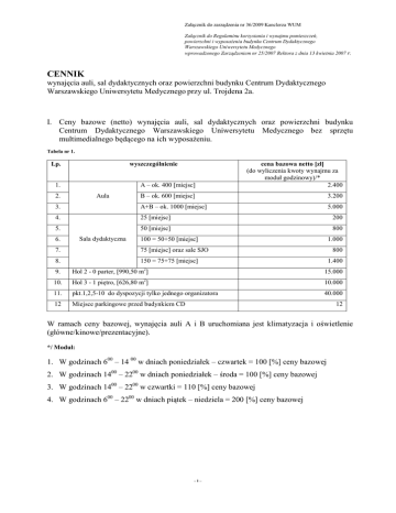 Załącznik do zarządzenia nr 36/2009 Kanclerza WUM Załącznik do Regulaminu korzystania i wynajmu pomieszczeń, powierzchni i wyposaŜenia budynku Centrum Dydaktycznego Warszawskiego Uniwersytetu Medycznego wprowadzonego Zarządzeniem nr 25/2007 Rektora z dnia 13 kwietnia 2007 r. CENNIK wynajęcia auli, sal dydaktycznych oraz powierzchni budynku Centrum Dydaktycznego Warszawskiego Uniwersytetu Medycznego przy ul. Trojdena 2a. I. Ceny bazowe (netto) wynajęcia auli, sal dydaktycznych oraz powierzchni budynku Centrum Dydaktycznego Warszawskiego Uniwersytetu Medycznego bez sprzętu multimedialnego będącego na ich wyposaŜeniu. Tabela nr 1. Lp. wyszczególnienie A – ok. 400 [miejsc] cena bazowa netto [zł] (do wyliczenia kwoty wynajmu za moduł godzinowy)/* 2.400 B – ok. 600 [miejsc] 3.200 3. A+B – ok. 1000 [miejsc] 5.000 4. 25 [miejsc] 200 5. 50 [miejsc] 800 1. Aula 2. Sala dydaktyczna 6. 100 = 50+50 [miejsc] 7. 75 [miejsc] oraz sale SJO 8. 150 = 75+75 [miejsc] 9. Hol 2 - 0 parter, [990,50 m2] 1.000 800 1.400 15.000 10. 2 Hol 3 - 1 piętro, [626,80 m ] 10.000 11. pkt.1,2,5-10 do dyspozycji tylko jednego organizatora 40.000 12 Miejsce parkingowe przed budynkiem CD 12 W ramach ceny bazowej, wynajęcia auli A i B uruchomiana jest klimatyzacja i oświetlenie (główne/kinowe/prezentacyjne). */ Moduł: 1. W godzinach 600 – 14 00 w dniach poniedziałek – czwartek = 100 [%] ceny bazowej 2. W godzinach 1400 – 2200 w dniach poniedziałek – środa = 100 [%] ceny bazowej 3. W godzinach 1400 – 2200 w czwartki = 110 [%] ceny bazowej 4. W godzinach 600 – 2200 w dniach piątek – niedziela = 200 [%] ceny bazowej -1– Załącznik do Regulaminu korzystania i wynajmu pomieszczeń, powierzchni i wyposaŜenia budynku Centrum Dydaktycznego Warszawskiego Uniwersytetu Medycznego wprowadzonego Zarządzeniem nr 25/2007 Rektora z dnia 13 kwietnia 2007 r. II. Ceny (netto) wynajęcia sprzętu multimedialnego będącego na wyposaŜeniu auli i sal dydaktycznych mieszczących się w budynku Centrum Dydaktycznego Warszawskiego Uniwersytetu Medycznego za czas uŜytkowania auli i sal dydaktycznych w godz. 600 - 2200, we wszystkie dni tygodnia. Sprzęt wykorzystywany moŜe być wyłącznie na terenie budynku Centrum Dydaktycznego i obsługiwany jest wyłącznie przez pracowników WUM aula A Lp. 1 2 3 4 5 6 7 8 9 10 11 12 13 14 15 16 17 18 19 Wyszczególnienie Nagłośnienie auli systemem głośników sufitowych, mikrofon stacjonarny. Dodatkowy mikrofon stacjonarny (max 3 szt.) Mikrofon bezprzewodowy Sennheiser ew100, ręczny (max 2 szt.), klapowy (max 2 szt.) Nagłośnienie dodatkowe parą głośników stereo JBL, do prezentacji z dźwiękiem. Rzutnik do przeźroczy System konferencyjny DIS CUE - System sterowania. Projektor multimedialny Sanyo PLC-XF-41,XGA, 7700 ANSI Im Ekran projekcyjny Lodo 400x300 cm. Ice White Wizualizer Lumens PS550 Komputer stacjonarny wbudowany w katedrę, typu PC lub Laptop Telewizor plazmowy 42” PD42 G W STRIPE TV Odtwarzacz DVD z magnetowidem VHS Panasonic Rejestrator DVD z dyskiem twardym/magnetowid VHS Panasonic. Nagranie ścieŜki dźwiękowej z auli. Nagranie video z auli (DVD lub VHS) z kamer stacjonarnych na auli. Połączenie konferencyjne, transmisja sygnału Audio/Video w standardzie H.323/SIP przy uŜyciu TCP/IP po LAN/WAN do 2Mbps. Terminal Tandberg MXP 990 Wysyłka sygnału audio/video z auli do sali dydaktycznej Udostępnienie połączenia internetowego w holu, 1 przyłącze RJ-45. (Ethernet 10/100Mbps) lub połączenia do sieci WLAN 802.11b/g cena netto [zł] /za urządzenie/za dzień 500 20/szt. 50/szt. 200 40 700 300 3100 200 300 150 200 100 300 100 250 1700 300 200 aula B Lp. 1 2 3 4 5 6 7 8 9 10 11 12 13 Wyszczególnienie Nagłośnienie auli systemem głośników sufitowych, mikrofon stacjonarny. Dodatkowy mikrofon stacjonarny (max 3 szt.) Mikrofon bezprzewodowy Sennheiser ew100, ręczny (max 2 szt.), klapowy (max 2 szt.) Nagłośnienie dodatkowe parą głośników stereo YAMAHA, do prezentacji z dźwiękiem. Rzutnik do przeźroczy System konferencyjny DIS CUE - System sterowania. Projector multimedialny Sanyo PLC-XF-45,XGA, 10000 ANSI Im Ekran projekcyjny Lodo 500x375 cm. Ice White Wizualizer Lumens PS550 Komputer stacjonarny wbudowany w katedrę, typu PC lub Laptop Telewizor plazmowy 42” PD42 G W STRIPE TV Odtwarzacz DVD z magnetowidem VHS Panasonic -2– cena netto [zł] /za urządzenie/za dzień 500 20/szt. 50/szt. 200 40 700 300 3600 250 300 150 200 100 Załącznik do Regulaminu korzystania i wynajmu pomieszczeń, powierzchni i wyposaŜenia budynku Centrum Dydaktycznego Warszawskiego Uniwersytetu Medycznego wprowadzonego Zarządzeniem nr 25/2007 Rektora z dnia 13 kwietnia 2007 r. 14 15 16 17 Rejestrator DVD z dyskiem twardym/magnetowid VHS Panasonic. Nagranie ścieŜki dźwiękowej z auli. Nagranie video z auli (DVD lub VHS) z kamer stacjonarnych na auli. Połączenie konferencyjne, transmisja sygnału Audio/Video w standardzie H.323/SIP przy uŜyciu TCP/IP po LAN/WAN do 2Mbps. Terminal Tandberg MXP 990 Wysyłka sygnału audio/video z auli do sali dydaktycznej 18 19 Udostępnienie połączenia internetowego w holu, 1 przyłącze RJ-45. (Ethernet 10/100Mbps) lub połączenia do sieci WLAN 802.11b/g 300 100 250 1700 300 200 sale dydaktyczne* Lp. Wyszczególnienie 1 2 3 4 5 6 7 8 9 10 11 Komputer stacjonarny typu PC lub Laptop Projector multimedialny XGA 2000 Rzutnik slajdów Rzutnik pisma 4300 ANSI Rzutnik pisma 2500 ANSI Tablica interaktywna Nagłośnienie* Telewizor plazmowy 42” PD42 G W STRIPE TV Nagranie ścieŜki dźwiękowej z sali. Projekcja audio/video z auli w dowolnej sali dydaktycznej Połączenie konferencyjne, transmisja sygnału Audio/Video w standardzie H.323/SIP przy uŜyciu TCP/IP po LAN/WAN do 2Mbps. Terminal Tandberg MXP 990 Cena netto [zł] urządzenie/za dzień 150 500 50 50 50 300 400 200 100 300 1700 */ nie dotyczy sal dydaktycznych 25 miejsc III. Ceny bazowe (netto) wynajęcia powierzchni budynku Centrum Dydaktycznego War