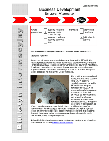 Data: 10/01/2010 Business Development European Aftermarket Grupa produktowa systemy rozrządu X systemy paska pomocniczego systemy chłodzenia systemy paliwowe inne Informacja techniczna handlowa X aktualizacja ogólna dot.: narzędzie SFT002 (7468-10103) do montażu paska Stretch Fit™ Szanowni Państwo, Niniejszym informujemy o zmianie konstrukcji narzędzia SFT002. Aby można było stosować to narzędzie do montażu pasków w nowym modelu Ford Fiesta (08/2008-), konieczne było wprowadzenie pewnych modyfikacji. W związku z ograniczoną przestrzenią przy montażu paska, skrócono długość elementu o kształcie sześciokąta z 25 do 22.5/23mm. Wszystkie części pozostałe na magazynie uległy wymianie. Aby odróżnić starą wersję od nowej, w oznaczeniu dodano literę “A”. W pudełku zmodyfikowanego narzędzia SFT002 klient otrzyma narzędzie SFT002AA do mocowania na kole pasowym pompy wody (Rys. 1) i SFT002B do mocowania na kole wału. Dotychczas rozpropagowane na rynku narzędzia SFT002 mogą być stosowane w aplikacjach, do których zostały przeznaczone. Jeżeli klienci chcieliby ich używać w samochodach Ford Fiesta (po 08/2008), narzędzie 002A (Rys.1) musi zostać zmodyfikowane poprzez zeszlifowanie sześciokąta do pożądanej długości. Informacja ta jest zamieszczona w instrukcji montażu paska 6PK1019SF, którą przesyłamy poniżej. Najbardziej aktualne dane dotyczące zastosowań dostępne są w katalogu internetowym na stronie www.gatesautocat.com. Data: 10/01/2010 Business Development European Aftermarket Jesteśmy do dyspozycji w przypadku ewentualnych pytań. Pozdrawiam, Marcin Perzyna tel.: 0 694 457 622 e-mail: [email protected]