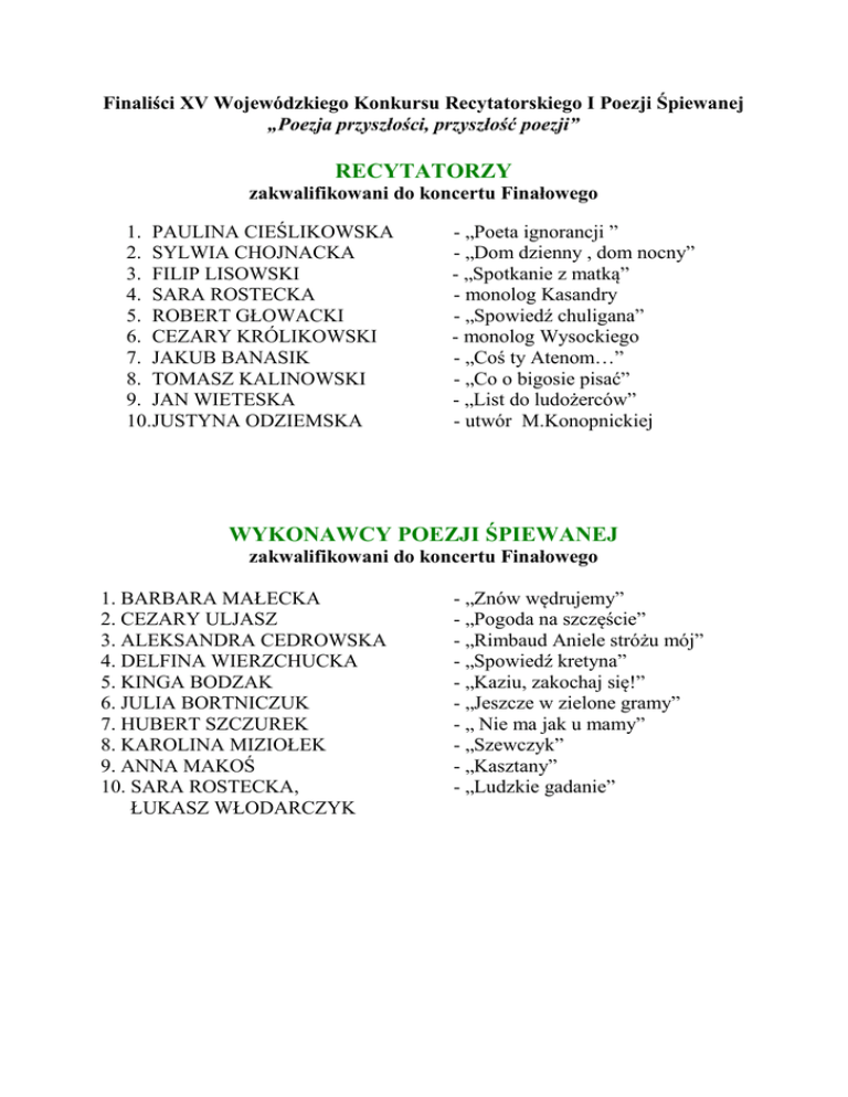 Finaliści XV Wojewódzkiego Konkursu Recytatorskiego I Poezji Śpiewanej „Poezja przyszłości, przyszłość poezji” RECYTATORZY zakwalifikowani do koncertu Finałowego 1. PAULINA CIEŚLIKOWSKA 2. SYLWIA CHOJNACKA 3. FILIP LISOWSKI 4. SARA ROSTECKA 5. ROBERT GŁOWACKI 6. CEZARY KRÓLIKOWSKI 7. JAKUB BANASIK 8. TOMASZ KALINOWSKI 9. JAN WIETESKA 10.JUSTYNA ODZIEMSKA - „Poeta ignorancji ” - „Dom dzienny , dom nocny” - „Spotkanie z matką” - monolog Kasandry - „Spowiedź chuligana” - monolog Wysockiego - „Coś ty Atenom…” - „Co o bigosie pisać” - „List do ludożerców” - utwór M.Konopnickiej WYKONAWCY POEZJI ŚPIEWANEJ zakwalifikowani do koncertu Finałowego 1. BARBARA MAŁECKA 2. CEZARY ULJASZ 3. ALEKSANDRA CEDROWSKA 4. DELFINA WIERZCHUCKA 5. KINGA BODZAK 6. JULIA BORTNICZUK 7. HUBERT SZCZUREK 8. KAROLINA MIZIOŁEK 9. ANNA MAKOŚ 10. SARA ROSTECKA, ŁUKASZ WŁODARCZYK - „Znów wędrujemy” - „Pogoda na szczęście” - „Rimbaud Aniele stróżu mój” - „Spowiedź kretyna” - „Kaziu, zakochaj się!” - „Jeszcze w zielone gramy” - „ Nie ma jak u mamy” - „Szewczyk” - „Kasztany” - „Ludzkie gadanie” WARSZTATY DLA FINALISTÓW 22.03/SOBOTA/ - RECYTATORZY (w 2 grupach pięcioosobowych) godz.10.00 ( z listy nr 1-5) Ogród Zimowy po godz.12.30 (z listy nr 6-10) sala widowiskowa - 413 3.03 /NIEDZIELA/ godz.10.00 OGRÓD ZIMOWY - PARTER WSZYSCY WYKONAWCY POEZJI ŚPIEWANEJ Każdy wykonawca który śpiewa do półplaybacku zostawia płytę CD. Na warsztatach m.in.: - wspólne ćwiczenia z emisji głosu, rozśpiewanie – wszyscy wykonawcy - indywidualna praca nad interpretacją. 29.03./sobota/ godz. 10.30 (potrwa do ok. godz.15.30) – sala teatralna 407 III p. WSZYSCY FINALIŚCI – PRÓBA GENERALNA! Finalistów obowiązuje na koncercie strój i obuwie galowe!!! (stonowane, niejaskrawe kolory, odświętny charakter ubioru) PRÓBA GENERALNA w STROJACH GALOWYCH (takich jak na KONCERCIE )- przebranie do sesji zdjęciowej. Praca na próbie w ubraniu codziennym. 10.03/niedziela/ godz. 11.00 – sala teatralna 407 III p. KONCERT FINAŁOWY z udziałem publiczności – każdy wykonawca ma prawo zaprosić 3-4 osoby. Zaproszenia będą rozdawane na warsztatach lub próbie generalnej . Przed koncertem krótka próba - spotkanie o godz. 9.45. Prosimy o przygotowanie repertuaru - piosenek i nagrań- na spontaniczne prezentacje w czasie przerwy na obrady Jury.
