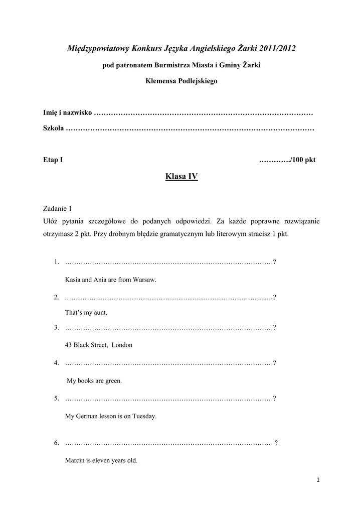 Międzypowiatowy Konkurs Języka Angielskiego Żarki 2011/2012 pod patronatem Burmistrza Miasta i Gminy Żarki Klemensa Podlejskiego Imię i nazwisko ……………………………………………………………………………… Szkoła ………………………………………………………………………………………… Etap I …………./100 pkt Klasa IV Zadanie 1 Ułóż pytania szczegółowe do podanych odpowiedzi. Za każde poprawne rozwiązanie otrzymasz 2 pkt. Przy drobnym błędzie gramatycznym lub literowym stracisz 1 pkt. 1. …………………………………………………………………………………? Kasia and Ania are from Warsaw. 2. .……………………………………………………………………………...…? That’s my aunt. 3. …………………………………………………………………………………? 43 Black Street, London 4. …………………………………………………………………………………? My books are green. 5. …………………………………………………………………………………? My German lesson is on Tuesday. 6. ………………………………………………………………………………… ? Marcin is eleven years old. 1 7. ………………………………………………………………………………… ? My favourite teacher is Mrs Smith. 8. ………………………………………………………………………………… ? My father is at home. 9. ………………………………………………………………………………… ? His birthday is in June. 10. ………………………………………………………………………………… ? I’m Polish. …………../20 pkt Zadanie 2 Napisz (zgodnie z prawdą) krótkie odpowiedzi na pytania. Za każde prawidłowe rozwiązanie otrzymujesz 2 pkt. Za jeden błąd literowy stracisz 1 pkt. Nie wolno popełnić żadnego błędu gramatycznego. Na przykład: Are you a student? …Yes, I am……….. 1. Is your name Anna Green? ……………………………………. 2. Is your mum English? ………………………………………… 3. Are oranges purple? …………………………………………….. 4. Is your best friend from Scotland? ……………………………… 5. Is it Wednesday today? ………………………………………….. 6. Are your parents at home? ………………………………………. 7. Have your mum and dad got a car? ……………………………… 8. Are you thirteen? ………………………………………………… 9. Has your friend got a parrot? …………………………………….. 10. Is London in Poland?.. …………………………………………… ………./20 pkt 2 Zadanie 3 Przeczytaj uważnie treść maila i uzupełnij luki poprawnym słowem lub słowami. Nie wolno popełnić żadnego błędu. From: [email protected] To: [email protected] Subject: About me Hi! My name’s Melissa. I’m ………. Wales and I ……….. eleven years old. I am a………. at Primary School in Cardiff. My ……….is big and I’m in……….five. My favourite ………. is blue and ………. favourite………. are Saturday and Sunday because these days are free. I’ve ………. a brother. ………. name’s Matthew. ………. ………. fifteen years old. His favourite school ………. are IT and Maths. He’s very good at counting. His best………. is Mark. They ………. in the same class. My favourite ………. is Mrs Black because I love Science. I’ve got a lot of animals at home. ………. got a turtle, a cat and four mice. Mark’s ………. animals………. dogs and parrots. Write to me ………………. ………./20 pkt Zadanie 4 Zapisz słownie literowane wyrazy. Za każde poprawnie zapisane słowo otrzymasz 2 pkt. Za jeden błąd odejmujemy 1 pkt. 1. /dżi, ar, ei, en, di, ef, ei, ti, eicz, i, ar/ ……………………………………………………….. 2. / ti, eicz, ju, ar, es, di, ei, łaj/………………………………………………………………… 3. / i, el,i, pi, eicz, ei, en, ti/…………………………………………………………………….. 4. / ti, dabliu, i, el, wi, i/………………………………………………………………………... 5. /pi, i, ei, si, eicz/……………………………………………………………………………… …………/10pkt 3 Zadanie 5 Wykreśl z każdego rzędu jedno słowo, które nie pasuje do pozostałych. Na przykład: Mum Dad Sister Pen 1. Wales 2. niece Ireland nephew 3. German 4. eagle 5. eraser 6. Science Scottish uncle Scottish bear sharpener IT ankle Irish elbow England England sheep notebook pet Poland English 7. pear grapes plums tomato 8. carrot cucumber 9. silver cherry lettuce golden belly indigo 10. basketball painting boxing volleyball …………./10 pkt Zadanie 6 Zapisz słownie godziny i działania matematyczne. Za każde poprawne rozwiązanie otrzymasz 2 pkt. Za jeden błąd odejmujemy 1 pkt. GODZINY: 1. 23.20 …………………………………………………………………………………….. 2. 10.30……………………………………………………………………………………... 3. 15.15……………………………………………………………………………………... 4. 14.35……………………………………………………………………………………... 5. 1.58 ……………………………………………………………………………………… DZIAŁANIA: 1. 34+ 20= 54……………………………………………………………………………….. 2. 97-65= 32………………………………………………………………………………… 3. 40× 2= 80………