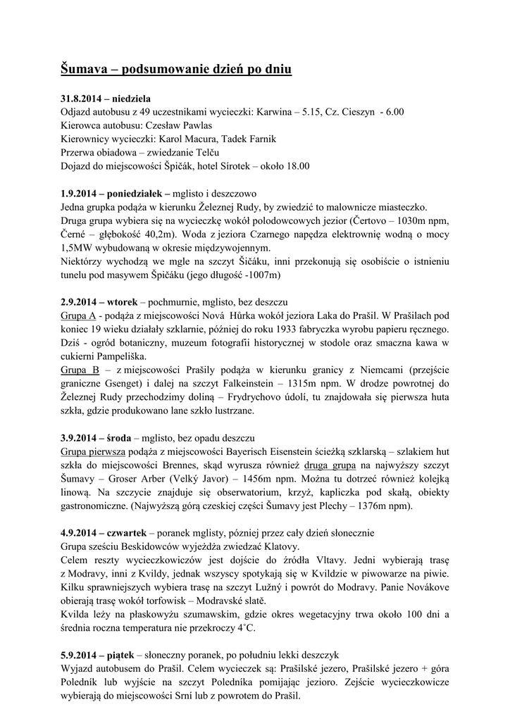 Šumava – podsumowanie dzień po dniu 31.8.2014 – niedziela Odjazd autobusu z 49 uczestnikami wycieczki: Karwina – 5.15, Cz. Cieszyn - 6.00 Kierowca autobusu: Czesław Pawlas Kierownicy wycieczki: Karol Macura, Tadek Farnik Przerwa obiadowa – zwiedzanie Telču Dojazd do miejscowości Špičák, hotel Sírotek – około 18.00 1.9.2014 – poniedziałek – mglisto i deszczowo Jedna grupka podąża w kierunku Železnej Rudy, by zwiedzić to malownicze miasteczko. Druga grupa wybiera się na wycieczkę wokół polodowcowych jezior (Čertovo – 1030m npm, Černé – głębokość 40,2m). Woda z jeziora Czarnego napędza elektrownię wodną o mocy 1,5MW wybudowaną w okresie międzywojennym. Niektórzy wychodzą we mgle na szczyt Šičáku, inni przekonują się osobiście o istnieniu tunelu pod masywem Špičáku (jego długość -1007m) 2.9.2014 – wtorek – pochmurnie, mglisto, bez deszczu Grupa A - podąża z miejscowości Nová Hůrka wokół jeziora Laka do Prašil. W Prašilach pod koniec 19 wieku działały szklarnie, później do roku 1933 fabryczka wyrobu papieru ręcznego. Dziś - ogród botaniczny, muzeum fotografii historycznej w stodole oraz smaczna kawa w cukierni Pampeliška. Grupa B – z miejscowości Prašily podąża w kierunku granicy z Niemcami (przejście graniczne Gsenget) i dalej na szczyt Falkeinstein – 1315m npm. W drodze powrotnej do Železnej Rudy przechodzimy doliną – Frydrychovo údolí, tu znajdowała się pierwsza huta szkła, gdzie produkowano lane szkło lustrzane. 3.9.2014 – środa – mglisto, bez opadu deszczu Grupa pierwsza podąża z miejscowości Bayerisch Eisenstein ścieżką szklarską – szlakiem hut szkła do miejscowości Brennes, skąd wyrusza również druga grupa na najwyższy szczyt Šumavy – Groser Arber (Velký Javor) – 1456m npm. Można tu dotrzeć również kolejką linową. Na szczycie znajduje się obserwatorium, krzyż, kapliczka pod skałą, obiekty gastronomiczne. (Najwyższą górą czeskiej części Šumavy jest Plechy – 1376m npm). 4.9.2014 – czwartek – poranek mglisty, pózniej przez cały dzień słonecznie Grupa sześciu Beskidowców wyjeżdża zwiedzać Klatovy. Celem reszty wycieczkowiczów jest dojście do źródła Vltavy. Jedni wybierają trasę z Modravy, inni z Kvildy, jednak wszyscy spotykają się w Kvildzie w piwowarze na piwie. Kilku sprawniejszych wybiera trasę na szczyt Lužný i powrót do Modravy. Panie Novákove obierają trasę wokół torfowisk – Modravské slatě. Kvilda leży na płaskowyżu szumawskim, gdzie okres wegetacyjny trwa około 100 dni a średnia roczna temperatura nie przekroczy 4˚C. 5.9.2014 – piątek – słoneczny poranek, po południu lekki deszczyk Wyjazd autobusem do Prašil. Celem wycieczek są: Prašilské jezero, Prašilské jezero + góra Poledník lub wyjście na szczyt Poledníka pomijając jezioro. Zejście wycieczkowicze wybierają do miejscowości Srní lub z powrotem do Prašil. Na Poledníku stoi wieża widokowa z ciekawą ekspozycją fotografii fauny i flory na schodach, ekspozycją zatarasów i systemu ochrony granicy z okresu żelaznej kurtyny oraz wspaniałymi widokami. Jest drugą najwyżej położoną wieżą widokową w RC a na platformę widikową trzeba się wspiąć po 227 schodach i szczeblach drabiny. 6.9.2014 – sobota – słonecznie, po południu lekki deszcz Niektórzy postanowoli skorzystać ze słonecznej pogody i ponownie zwiedzić okolice jezior (Čertovo, Černé), wejść na Špičák i Pancíř. Zaplanowana jest też wycieczka na Velký Ostrý – szczyt graniczny, najpiękniejszy szczyt Šumavy ze wspaniałymi widokami (słowa Janka Raszki po wejściu na szczyt – kurdi, to je piekne) . Wychodzimy z Hamrów. W drodze powrotnej jedni wychodzą jeszcze na Špičák (wieża widokowa z panoramatycznymi widokami) lub Pancíř. Przez cały tydzień amatorzy grzybobrania mieli po temu wyśmienite warunki. Przyjemne były wieczory ze śpiewem (na gitarze grał Władek Raszyk). Wyżywienie w hotelu pierwszorzędne – na śniadanie talerz szynkowo-serowy, jogurt, płatki, ciasto, kawa, herbata, rogaliki i chleb. Wszystkiego do woli. Kolacja – kanapeczki jako przystawka, wyśmienita zupa i drugie danie. Może mogło być trochę więcej jarzyn, ale nie szukajmy dziury w całym, zawsze można było sobie kupić. 7.9.2014 – niedziela – słonecznie Wspólne foto przed hotelem. Wyjeżdżamy 8.20, kierowca (Czesław Pawlas) szczęśliwie dowozi nas do domu (Czeski Cieszyn – 16.30) To był udany tydzień! Wszystkim serdeczne podziękowania za towarzystwo!
