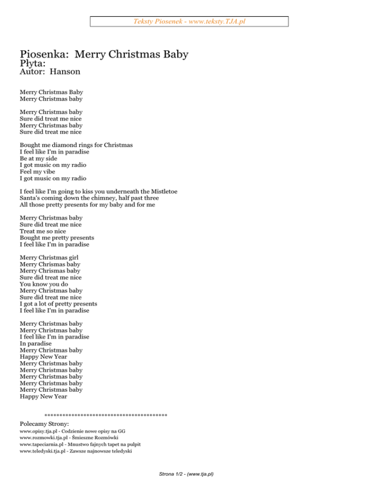 Teksty Piosenek - www.teksty.TJA.pl Piosenka: Merry Christmas Baby Płyta: Autor: Hanson Merry Christmas Baby Merry Christmas baby Merry Christmas baby Sure did treat me nice Merry Christmas baby Sure did treat me nice Bought me diamond rings for Christmas I feel like I'm in paradise Be at my side I got music on my radio Feel my vibe I got music on my radio I feel like I'm going to kiss you underneath the Mistletoe Santa's coming down the chimney, half past three All those pretty presents for my baby and for me Merry Christmas baby Sure did treat me nice Treat me so nice Bought me pretty presents I feel like I'm in paradise Merry Christmas girl Merry Chrismas baby Merry Chrismas baby Sure did treat me nice You know you do Merry Christmas baby Sure did treat me nice I got a lot of pretty presents I feel like I'm in paradise Merry Christmas baby Merry Christmas baby I feel like I'm in paradise In paradise Merry Christmas baby Happy New Year Merry Christmas baby Merry Christmas baby Merry Christmas baby Merry Christmas baby Merry Christmas baby Happy New Year ***************************************** Polecamy Strony: www.opisy.tja.pl - Codzienie nowe opisy na GG www.rozmowki.tja.pl - Śmieszne Rozmówki www.tapeciarnia.pl - Mnustwo fajnych tapet na pulpit www.teledyski.tja.pl - Zawsze najnowsze teledyski Strona 1/2 - (www.tja.pl) Teksty Piosenek - www.teksty.TJA.pl www.lol2.pl - Śmieszne Filmiki, Kabarety www.wkinach.pl - Co jest grane w kinach ? Strona 2/2 - (www.tja.pl)
