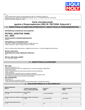 1/8 Karta charakterystyki zgodna z Rozporządzeniem (WE) Nr 1907/2006, Załącznik II Opracowano w dniu: 04.02.2009 Zastąpiona redakcja z dnia: 20.10.2008 Data PDF: 05.02.2009 PETROL ADDITIVE 300ML Art.: 2642 Karta charakterystyki zgodna z Rozporządzeniem (WE) Nr 1907/2006, Załącznik II 1. IDENTYFIKACJA SUBSTANCJI/PREPARATU I IDENTYFIKACJA PRZEDSIĘBIORSTWA Identyfikacja substancji lub preparatu PETROL ADDITIVE 300ML Art.: 2642 Zastosowanie substancji/preparatu Dodatki Identyfikacja przedsiębiorstwa LIQUI MOLY GmbH, Jerg-Wieland-Straße 4, D-89081 Ulm-Lehr Telefon (+49) 0731-1420-0, Telefax (+49) 0731-1420-88 Adres e-mailowy osoby kompetentnej: [email protected], [email protected] Numer alarmowy Ambulatorium przy objawach zatrucia : Tel.: Numer alarmowy spółki: Tel. (+49) 0731-1420-0 2. IDENTYFIKACJA ZAGROŻEŃ Dla ludzi Patrz również punkt 11 i 15. Preparat jest sklasyfikowany jako niebezpieczny w rozumieniu dyrektywy 1999/45/WE. Produkt jest zapalny. Użycie: możliwe powstanie wybuchowej mieszaniny parowo-powietrznej. Działa szkodliwie może powodować uszkodzenie płuc w przypadku połknięcia. Powtarzające się narażenie może powodować wysuszenie lub pękanie skóry. Pary mogą wywoływać uczucie senności i zawroty głowy. Dla środowiska Patrz punkt 12. Działa toksycznie na organizmy wodne może powodować długo utrzymujące się niekorzystne zmiany w środowisku wodnym. 3. SKŁAD/INFORMACJA O SKŁADNIKACH Nazwa Substancji Stęż.% Symbol ostrze-gawczy Numer rejestracji (ECHA) Zwroty R DNEL EINECS, ELINCS PNEC Benzyna ciężka hydroodsiarczona (ropa naftowa) 70 - 95 Xn/N 10-51-53-65-66-67 265-185-4 Solwent nafta (ropa naftowa), węglowodory ciężkie aromatyczne 1-5 Xn/N 51-53-65-66-67 265-198-5 Poliolefinoamidoalkenoamina 1-5 53 --- 2/8 Karta charakterystyki zgodna z Rozporządzeniem (WE) Nr 1907/2006, Załącznik II Opracowano w dniu: 04.02.2009 Zastąpiona redakcja z dnia: 20.10.2008 Data PDF: 05.02.2009 PETROL ADDITIVE 300ML Art.: 2642 1,2,4-trimetylobenzen 0,1 -< 1 Xn/Xi/N 10-20-36/37/38-51-53 202-436-9 Naftalen 0,1 -< 1 Xn/N 22-40-50-53 202-049-5 Pełne brzmienie zwrotów R patrz punkt 16. 4. PIERWSZA POMOC 4.1 Drogi oddechowe Osobę usunąć z zagrożonej strefy. Osobie zapewnić dopływ świeżego powietrza, w zależności od objawów skonsultować się z lekarzem. W przypadku utraty przytomności poszkodowanego położyć w stabilnej pozycji bocznej i bezzwłocznie zasięgnąć porady lekarskiej. Bezdech - potrzebny aparat sztucznego oddychania. 4.2 Kontakt z oczami Usunąć szkła kontaktowe. Przez kilka minut dokładnie spłukać dużą ilością wody, jeżeli potrzeba, udać się do lekarza. 4.3 Kontakt ze skórą Umyć gruntownie mydłem z dużą ilością wody, zanieczyszczone, przesiąknięte części ubrania niezwłocznie usunąć, przy podrażnieniu skóry (zaczerwienienie itp.), skonsultować się z lekarzem. Zalecany krem ochronny do rąk. 4.4 Drogi pokarmowe Jamę ustną dokładnie przepłukać wodą. Nie wywoływać wymiotów, podać dużą ilość wody do picia, natychmiast udać się do lekarza. Niebezpieczeństwo aspiracji Przy wymiotach trzymać głowę nisko, aby treść żołądka nie dostała się do płuc. 4.5 Szczególnie polecane środki pierwszej pomocy Wskazówki dla lekarza: Połknięcie: Węgiel aktywny Płukanie żołądka tylko pod intubacją śródtchawiczą. Następnie obserwacja co do zapalenia płuc i obrzęku płuc. 5. POSTĘPOWANIE W PRZYPADKU POŻARU 5.1 Stosownych środków gaśniczych Dwutlenek wegla (CO2). proszek gaśniczy Piana. Rozpylony strumień wody. Zagrożone pojemniki chłodzić wodą. 5.2 Środków gaśniczych, które nie są używane ze względów bezpieczeństwa Pełny strumień wody. 5.3 Specjalnych zagrożeń związanych z narażeniem wynikających z właściwości substancji lub preparatu jako takiego, produktów spalania, powstających gasów W przypadku pożaru mogą powstać: Tlenki węgla. Węglowodory Toksyczne produkty rozkładu termicznego. Wybuchowa mieszanina parowo-powietrzna. Niebezpieczne opary, cięższe od powietrza. Rozkład w pobliżu ziemi może spowodować ponowny zapłon w oddalonych źródłach zapłonu. 5.4 Specjalnego sprzętu ochronnego dla strażaków Nie wdychać dymów powstających w wyniku pożaru lub wybuchu. Sprzęt ochrony dróg oddechowych niezależny od powietrza otoczenia. Według wielkości pożaru. W razie potrzeby - pełna ochrona. 3/8 Karta charakterystyki zgodna z Rozporządzeniem (WE) Nr 1907/2006, Załącznik II Opracowano w dniu: 04.02.2009 Zastąpiona redakcja z dnia: 20.10.2008 Data PDF: 05.02.2009 PETROL ADDITIVE 300ML Art.: 2642 5.5 Pozostałe uwagi Skażoną wodę gaśniczą zneutralizować zgodnie z przepisami administracyjnymi 6. POSTĘPOWANIE W PRZYPADKU NIEZAMIERZONEGO UWOLNIENIA DO ŚRODOWISKA Patrz punkt 13., odnośnie osobistego wyposażenia ochronnego patrz punkt 8. 6.1 Indywidualnych środków ostrożności Oddalić źródło ognia, nie palić tytoniu. Dbać o wystarczającą wentylację nawiewną. Unikać kontaktu z oczami, skórą, a także wdychania (inhalacji). W danym przypadku mieć na względzie niebezpieczeństwo poślizgu. 6.2 Środków ostrożności w odniesieniu do środowiska Przy ulatnianiu się większej ilości zatamować. Unikać przenikania do wód gruntowych i powierzchniowych, a również do gruntu. Zapobiec przedostawaniu się do kanalizacji, piwnicy, wykopów roboczych lub innych miejsc, gdzie nagromadzenie się mogłoby być niebezpieczne. Przy przedostaniu się do kanalizacji w wyniku wypadku, informować właściwe władze. 6.3 Metody oczyszczania Zebrać materiałem chłonnym (np.: uniwersalny środek wiążący) i usuwać zgodnie z punktem 13. Zadbać o wystarczającą wentylację nawiewną i wywiewną. 7. POSTĘPOWANIE Z SUBSTANCJĄ/PREPARATEM I JEJ/JEGO MAGAZYNOWANIE 7.1 Postępowanie z substancją/preparatem Wskazówki bezpiecznego postępowania: Patrz punkt 6.1 Dbać o dobrą wentylację pomieszczenia. Unikać wdychani