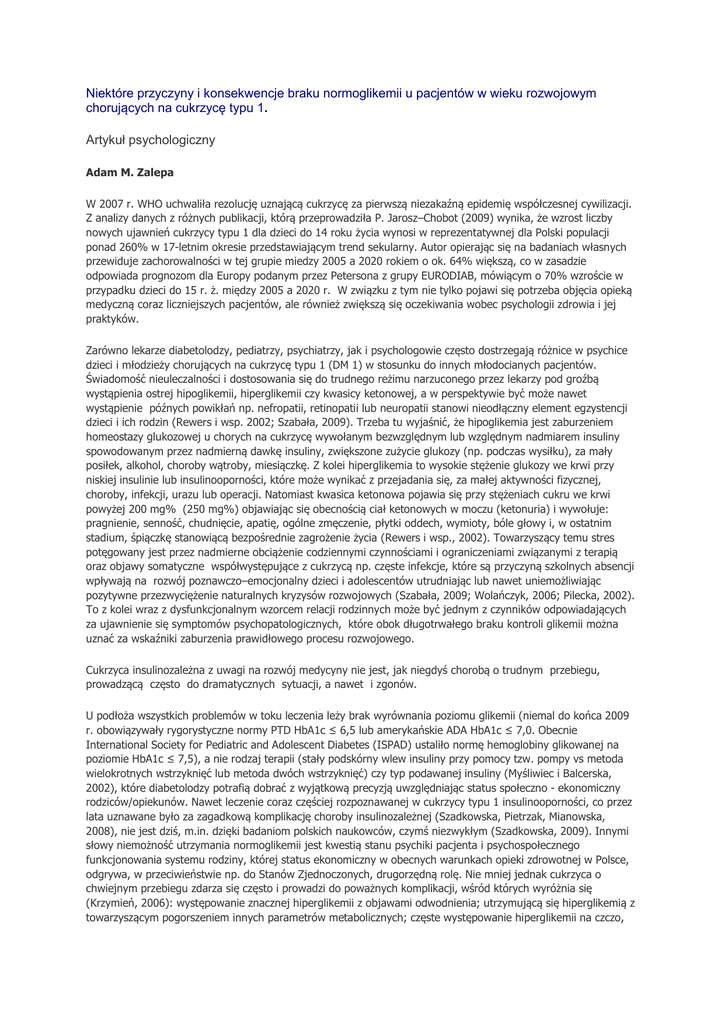Niektóre przyczyny i konsekwencje braku normoglikemii u pacjentów w wieku rozwojowym chorujących na cukrzycę typu 1. Artykuł psychologiczny Adam M. Zalepa W 2007 r. WHO uchwaliła rezolucję uznającą cukrzycę za pierwszą niezakaźną epidemię współczesnej cywilizacji. Z analizy danych z różnych publikacji, którą przeprowadziła P. Jarosz–Chobot (2009) wynika, że wzrost liczby nowych ujawnień cukrzycy typu 1 dla dzieci do 14 roku życia wynosi w reprezentatywnej dla Polski populacji ponad 260% w 17-letnim okresie przedstawiającym trend sekularny. Autor opierając się na badaniach własnych przewiduje zachorowalności w tej grupie miedzy 2005 a 2020 rokiem o ok. 64% większą, co w zasadzie odpowiada prognozom dla Europy podanym przez Petersona z grupy EURODIAB, mówiącym o 70% wzroście w przypadku dzieci do 15 r. ż. między 2005 a 2020 r. W związku z tym nie tylko pojawi się potrzeba objęcia opieką medyczną coraz liczniejszych pacjentów, ale również zwiększą się oczekiwania wobec psychologii zdrowia i jej praktyków. Zarówno lekarze diabetolodzy, pediatrzy, psychiatrzy, jak i psychologowie często dostrzegają różnice w psychice dzieci i młodzieży chorujących na cukrzycę typu 1 (DM 1) w stosunku do innych młodocianych pacjentów. Świadomość nieuleczalności i dostosowania się do trudnego reżimu narzuconego przez lekarzy pod groźbą wystąpienia ostrej hipoglikemii, hiperglikemii czy kwasicy ketonowej, a w perspektywie być może nawet wystąpienie późnych powikłań np. nefropatii, retinopatii lub neuropatii stanowi nieodłączny element egzystencji dzieci i ich rodzin (Rewers i wsp. 2002; Szabała, 2009). Trzeba tu wyjaśnić, że hipoglikemia jest zaburzeniem homeostazy glukozowej u chorych na cukrzycę wywołanym bezwzględnym lub względnym nadmiarem insuliny spowodowanym przez nadmierną dawkę insuliny, zwiększone zużycie glukozy (np. podczas wysiłku), za mały posiłek, alkohol, choroby wątroby, miesiączkę. Z kolei hiperglikemia to wysokie stężenie glukozy we krwi przy niskiej insulinie lub insulinooporności, które może wynikać z przejadania się, za małej aktywności fizycznej, choroby, infekcji, urazu lub operacji. Natomiast kwasica ketonowa pojawia się przy stężeniach cukru we krwi powyżej 200 mg% (250 mg%) objawiając się obecnością ciał ketonowych w moczu (ketonuria) i wywołuje: pragnienie, senność, chudnięcie, apatię, ogólne zmęczenie, płytki oddech, wymioty, bóle głowy i, w ostatnim stadium, śpiączkę stanowiącą bezpośrednie zagrożenie życia (Rewers i wsp., 2002). Towarzyszący temu stres potęgowany jest przez nadmierne obciążenie codziennymi czynnościami i ograniczeniami związanymi z terapią oraz objawy somatyczne współwystępujące z cukrzycą np. częste infekcje, które są przyczyną szkolnych absencji wpływają na rozwój poznawczo–emocjonalny dzieci i adolescentów utrudniając lub nawet uniemożliwiając pozytywne przezwyciężenie naturalnych kryzysów rozwojowych (Szabała, 2009; Wolańczyk, 2006; Pilecka, 2002). To z kolei wraz z dysfunkcjonalnym wzorcem relacji rodzinnych może być jednym z czynników odpowiadających za ujawnienie się symptomów psychopatologicznych, które obok długotrwałego braku kontroli glikemii można uznać za wskaźniki zaburzenia prawidłowego procesu rozwojowego. Cukrzyca insulinozależna z uwagi na rozwój medycyny nie jest, jak niegdyś chorobą o trudnym przebiegu, prowadzącą często do dramatycznych sytuacji, a nawet i zgonów. U podłoża wszystkich problemów w toku leczenia leży brak wyrównania poziomu glikemii (niemal do końca 2009 r. obowiązywały rygorystyczne normy PTD HbA1c ≤ 6,5 lub amerykańskie ADA HbA1c ≤ 7,0. Obecnie International Society for Pediatric and Adolescent Diabetes (ISPAD) ustaliło normę hemoglobiny glikowanej na poziomie HbA1c ≤ 7,5), a nie rodzaj terapii (stały podskórny wlew insuliny przy pomocy tzw. pompy vs metoda wielokrotnych wstrzyknięć lub metoda dwóch wstrzyknięć) czy typ podawanej insuliny (Myśliwiec i Balcerska, 2002), które diabetolodzy potrafią dobrać z wyjątkową precyzją uwzględniając status społeczno - ekonomiczny rodziców/opiekunów. Nawet leczenie coraz częściej rozpoznawanej w cukrzycy typu 1 insulinooporności, co przez lata uznawane było za zagadkową komplikację choroby insulinozależnej (Szadkowska, Pietrzak, Mianowska, 2008), nie jest dziś, m.in. dzięki badaniom polskich naukowców, czymś niezwykłym (Szadkowska, 2009). Innymi słowy niemożność utrzymania normoglikemii jest kwestią stanu psychiki pacjenta i psychospołecznego funkcjonowania systemu rodziny, której status ekonomiczny w obecnych warunkach opieki zdrowotnej w Polsce, odgrywa, w przeciwieństwie np. do Stanów Zjednoczonych, drugorzędną rolę. Nie mniej jednak cukrzyca o chwiejnym przebiegu zdarza się często i prowadzi do poważnych komplikacji, wśród których wyróżnia się (Krzymień, 2006): występowanie znacznej hiperglikemii z objawami odwodnienia; utrzymującą się hiperglikemią z towarzyszącym pogorszeniem innych parametrów metabolicznych; częste występowanie hiperglikemii na czczo, przekraczającej 300 mg/dl (>16,7 mmol/l) bez względu na stosowaną terapię, poziom HbA1c przekraczający o 100 proc. normę ustaloną dla osób bez cukrzycy; nawracające epizody hipoglikemii mimo wdrożonego leczenia; naprzemiennie występujące epizody hipo i hiperglikemii; nawracające epizody kwasicy lub ketozy niezwiązane z wystąpieniem infekcji czy urazem. Wynikiem tych komplikacji jest oczywiście pogorszenie funkcjonowania poznawczego (Talarowska – Bogusz, Florkowski, Zboralski i Gałecki, 2006; Talarowska, Florkowski, Orzechowska, Wysokiński i Zboralski, 2008) i emocjonalnego (Florys, Grabowska, Głowińska, Urban, Mirucka i Peczyńska, 2005; Pilecka 2002), obniżenie jakości życia (Pietrzykowska, Zozulińska i Wierusz-Wysocka, 2007), a nieobecności w szkole 
