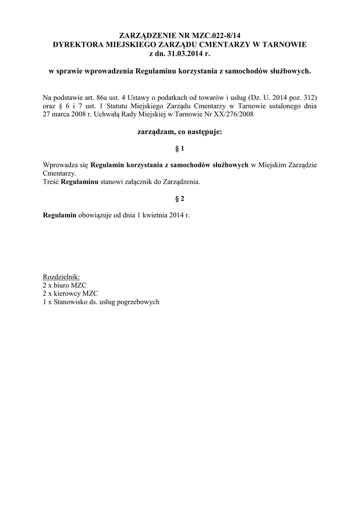 ZARZĄDZENIE NR MZC.022-8/14 DYREKTORA MIEJSKIEGO ZARZĄDU CMENTARZY W TARNOWIE z dn. 31.03.2014 r. w sprawie wprowadzenia Regulaminu korzystania z samochodów służbowych. Na podstawie art. 86a ust. 4 Ustawy o podatkach od towarów i usług (Dz. U. 2014 poz. 312) oraz § 6 i 7 ust. 1 Statutu Miejskiego Zarządu Cmentarzy w Tarnowie ustalonego dnia 27 marca 2008 r. Uchwałą Rady Miejskiej w Tarnowie Nr XX/276/2008 zarządzam, co następuje: §1 Wprowadza się Regulamin korzystania z samochodów służbowych w Miejskim Zarządzie Cmentarzy. Treść Regulaminu stanowi załącznik do Zarządzenia. §2 Regulamin obowiązuje od dnia 1 kwietnia 2014 r. Rozdzielnik: 2 x biuro MZC 2 x kierowcy MZC 1 x Stanowisko ds. usług pogrzebowych Załącznik do Zarządzenia Dyrektora MZC nr 022-8/2014 z dnia 31 marca 2014 r. REGULAMIN KORZYSTANIA Z SAMOCHODÓW SŁUŻBOWYCH § 1 Postanowienia ogólne Ilekroć mowa w Regulaminie o: 1. Zarządzie – należy przez to rozumieć Miejski Zarząd Cmentarzy w Tarnowie 2. Samochodzie służbowym – należy przez to rozumieć samochód firmowy stanowiący środek trwały Zarządu 3. Użytkowniku – należy przez to rozumieć pracowników Zarządu . § 2 Cel i zakres użytkowania 1. Samochody wykazane w Załączniku nr 1 niniejszego Regulaminu wykorzystywane są przez Użytkowników uprawnionych do korzystania z aut służbowych (Załącznik nr 2) wyłącznie dla celów związanych z działalnością gospodarczą Zarządu. W szczególności samochody służbowe służą następującym celom: przewóz zwłok ze szpitala lub z domu na cmentarz przewozy zmarłych do kremacji przewozy szczątków po ekshumacji przejazdy między cmentarzami obsługa pogrzebów, kondukty pogrzebowe zakupy materiałów eksploatacyjnych rozklejanie klepsydr, przewożenie wieńców wykonywanie innych usług pogrzebowych i cmentarnych 2. Samochód służbowy pozostaje do dyspozycji Użytkowników tylko i wyłącznie w czasie pracy lub w czasie wypełniania przez nich obowiązków na rzecz Zarządu. Użytkownik nie jest uprawniony do korzystania z samochodu w czasie wolnym od pracy lub w celach niezwiązanych z działalnością gospodarczą. § 3 Koszty eksploatacji Koszty eksploatacji samochodu ponosi Zarząd. § 4 Odpowiedzialność za samochód Użytkownik samochodu służbowego odpowiedzialny jest za: 1. eksploatację samochodu z zachowaniem bezpieczeństwa i ekonomicznych warunków jazdy; 2. utrzymywanie czystości w pojeździe; 3. kontrolę techniczną samochodu przed jego użyciem, w szczególności mowa tu o kontroli: oświetlenia, stanu ogumienia, poziomu oleju silnikowego, płynu chłodniczego, płynu do spryskiwaczy; 4. zgłoszenie awarii lub usterek dyrekcji Zarządu lub osobie przez niego wyznaczonej. § 5 Miejsce parkowania samochodu Po godzinach pracy lub po wykonaniu zadań związanych z działalnością, parkowanie samochodów służbowych może mieć miejsce jedynie w garażu będącym własnością Miejskiego Zarządu Cmentarzy w Tarnowie przy ul. Ziaji lub we wskazanym przez Zarząd miejscu. § 6 Dokumentacja 1. Użytkownik samochodu służbowego zobowiązany jest dokonywać wpisów rejestrujących każde wykorzystanie tego pojazdu. 2. Wpis o którym mowa w pkt. 1 powinien zawierać co najmniej: 1) kolejny numer wpisu, 2) datę i cel wyjazdu, 3) opis trasy (skąd – dokąd), 4) liczbę przejechanych kilometrów, 5) imię i nazwisko osoby kierującej pojazdem, 3. Zarząd zobowiązany jest do prowadzenia Ewidencji przebiegu pojazdu oddzielnie dla każdego z samochodów służbowych, która powinna zawierać co najmniej: 1) 2) 3) 4) 5) 6) 7) 8) 9) numer rejestracyjny pojazdu samochodowego; dzień rozpoczęcia i zakończenia prowadzenia ewidencji; stan licznika przebiegu pojazdu samochodowego na dzień rozpoczęcia prowadzenia ewidencji, na koniec każdego okresu rozliczeniowego oraz na dzień zakończenia prowadzenia ewidencji; wpis osoby kierującej pojazdem samochodowym dotyczący każdego wykorzystania tego pojazdu (zgodnie z pkt 1-2); liczbę przejechanych kilometrów na koniec każdego okresu rozliczeniowego oraz na dzień zakończenia prowadzenia ewidencji. 4. Zarząd zobowiązany jest na koniec każdego okresu rozliczeniowego (miesiąc) potwierdzić autentyczność wpisu osoby kierującej pojazdem, o którym mowa w pkt 2. 5. W Miejskim Zarządzie Cmentarzy ewidencja przebiegu pojazdu prowadzona jest w formie kart drogowych, które spełniają wymienione w podpunktach 1-5 warunki .…………………………………………… (podpis dyrektora Zarządu) Załącznik nr 1 do Regulaminu w sprawie zasad korzystania z samochodów służbowych Wykaz samochodów wykorzystywanych wyłącznie do działalności gospodarczej Lp. Marka Model Numer rejestracyjny Rok produkcji Data nabycia pojazdu 1. Renault traffic 1,9D karawan KT 43090 2005 17.10.2005 2. Renault traffic 2.0D karawan KT 65056 2008 31.12.2008 Uwagi Załącznik nr 2 do Regulaminu w sprawie zasad korzystania z samochodów służbowych Wykaz osób upoważnionych do korzystania z samochodów służbowych Lp. Imię i nazwisko Stanowisko 1. Marek Król kierowca 2. Janusz Wroński kierowca Uwagi