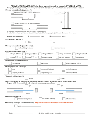 FORMULARZ POMIAROWY dla drzwi całoszklanych w kasecie SYNTESIS VITRO Niniejszy formularz powinien być wypełniony we wszystkich obowiązkowych polach(*zaznaczyć x) i potwierdzony podpisem 1.Proszę wskazać rodzaj systemu (*). Kaseta SYNTESIS VITRO pojedyncza Dolna krawędź górnej belki kasety Syntesis po otynkowaniu A H Kaseta SYNTESIS VITRO podwójna A Gotowa podłoga A - odległość pomiędzy pionowymi słupkami kasety – światło przejścia H - odległość pomiędzy wykończoną podłogą (płytki, parkiet) a dolną krawędzią górnej belki kasety Syntesis po otynkowaniu.. A Wskazać pobrane wymiary: (mm) H (mm) 2.Spowalniacz do tafli(*). tak nie 3.Proszę wskazać rodzaj zamknięcia(*). uchwyt do przesuwu zamek hakowy 4.Uchwyt do przesuwu tafli(*). reling dł. 300mm reling dł. 400mm reling dł. 500mm reling kwadrat C reling kwadrat T okrągły fi 50 mm okrągły fi 70 mm okrągły anoda 1 okrągły anoda 2 prostokątny 5.Uchwyt do mocowania tafli(*). zaciskowe aluminiowe do 120 kg float decormat (satyna) antisol brązowy satyna grafitowa satyna brązowa antisol grafitowy frezowane 6.Kolorystyka tafli szklanej(*). 7.Grubość tafli szklanej(*). 8 mm 10 mm 8.W przypadku drzwi pojedynczych wskazać stronę otwarcia ustawiając się od strony satynowej(*). - dotyczy tafli: decormat (satyna), satyna brązowa, satyna grafitowa SX DX satyna satyna 9.Piaskowanie wzoru(*). na stronie satynowej na stronie gładkiej tafla bez wzoru 10.Wzór wg katalogu Eclisse lub strony: http://www.eclisse.pl/Produkty/Drzwi/Drzwi-szklane wzór Data Czytelny podpis wraz z pieczątką