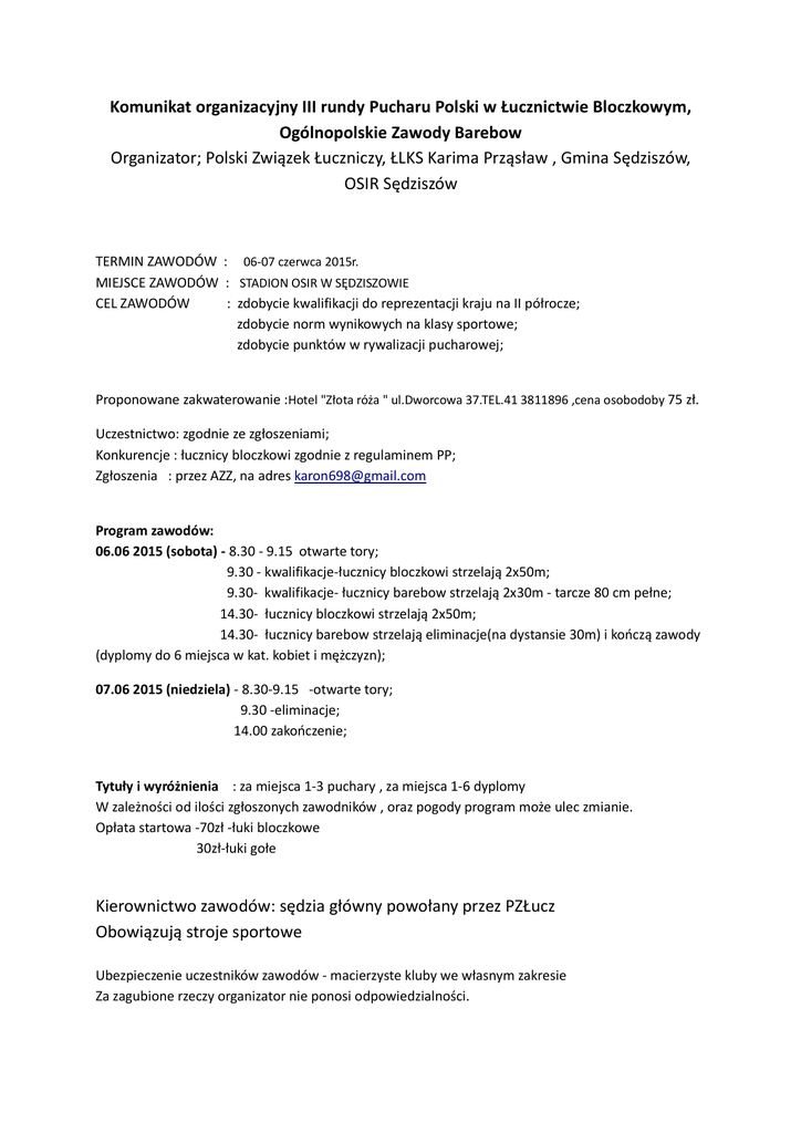 Komunikat organizacyjny III rundy Pucharu Polski w Łucznictwie Bloczkowym, Ogólnopolskie Zawody Barebow Organizator; Polski Związek Łuczniczy, ŁLKS Karima Prząsław , Gmina Sędziszów, OSIR Sędziszów TERMIN ZAWODÓW : 06-07 czerwca 2015r. MIEJSCE ZAWODÓW : STADION OSIR W SĘDZISZOWIE CEL ZAWODÓW : zdobycie kwalifikacji do reprezentacji kraju na II półrocze; zdobycie norm wynikowych na klasy sportowe; zdobycie punktów w rywalizacji pucharowej; Proponowane zakwaterowanie :Hotel "Złota róża " ul.Dworcowa 37.TEL.41 3811896 ,cena osobodoby 75 zł. Uczestnictwo: zgodnie ze zgłoszeniami; Konkurencje : łucznicy bloczkowi zgodnie z regulaminem PP; Zgłoszenia : przez AZZ, na adres [email protected] Program zawodów: 06.06 2015 (sobota) - 8.30 - 9.15 otwarte tory; 9.30 - kwalifikacje-łucznicy bloczkowi strzelają 2x50m; 9.30- kwalifikacje- łucznicy barebow strzelają 2x30m - tarcze 80 cm pełne; 14.30- łucznicy bloczkowi strzelają 2x50m; 14.30- łucznicy barebow strzelają eliminacje(na dystansie 30m) i kończą zawody (dyplomy do 6 miejsca w kat. kobiet i mężczyzn); 07.06 2015 (niedziela) - 8.30-9.15 -otwarte tory; 9.30 -eliminacje; 14.00 zakończenie; Tytuły i wyróżnienia : za miejsca 1-3 puchary , za miejsca 1-6 dyplomy W zależności od ilości zgłoszonych zawodników , oraz pogody program może ulec zmianie. Opłata startowa -70zł -łuki bloczkowe 30zł-łuki gołe Kierownictwo zawodów: sędzia główny powołany przez PZŁucz Obowiązują stroje sportowe Ubezpieczenie uczestników zawodów - macierzyste kluby we własnym zakresie Za zagubione rzeczy organizator nie ponosi odpowiedzialności.