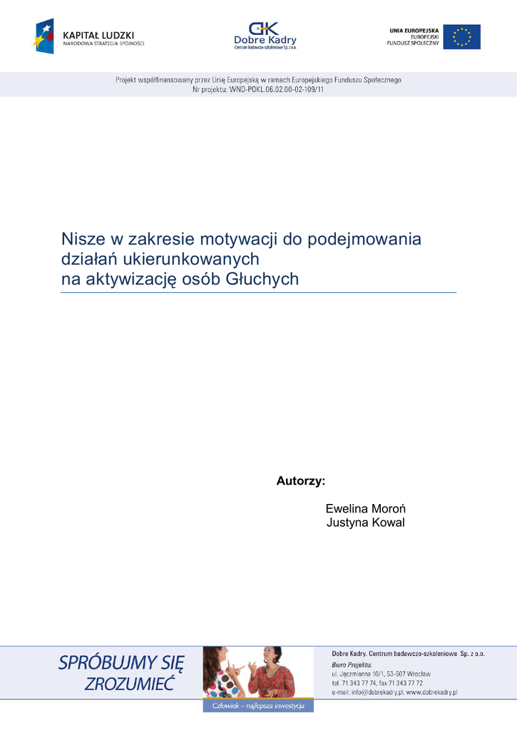 Nisze w zakresie motywacji do podejmowania działań ukierunkowanych na aktywizację osób Głuchych Autorzy: Ewelina Moroń Justyna Kowal Spis treści Wstęp....................................................................................................................................................... 4 I Nisze w zakresie działań aktywizacyjnych osób głuchych – przyczyny............................................ 5 1. Zasiłki, renty i inne świadczenia ................................................................................................. 5 2. Specyfika niepełnosprawności .................................................................................................... 7 3. Ustawa o języku migowym i innych środkach porozumiewania się ........................................... 9 4. Bariera komunikacyjna ............................................................................................................. 10 5. Stereotyp głuchego ................................................................................................................... 11 6. Niskie kompetencje językowe niesłyszących ........................................................................... 15 7. Ideologia oralności .................................................................................................................... 19 II Nisze w zakresie działań aktywizacyjnych osób głuchych – postulowane działania ..................... 21 1. Status polskiego języka migowego (PJM) ................................................................................ 21 2. Lektorat PJM ............................................................................................................................. 23 3. Model nauczania dwujęzycznego ............................................................................................. 25 4. Działania w obrębie systemu szkolnictwa wyższego ................................................................ 27 5. Komunikacja międzykulturowa ................................................................................................. 31 6. Life Skills ................................................................................................................................... 32 III Przykłady działań aktywizujących ................................................................................................. 36 1. Projekt „Wolontariat-włącz się!” – inspiracja w opracowywaniu programów aktywizacji zawodowej i społecznej ................................................................................................................ 36 2. Projekt „4 kroki – wsparcie Osób Niesłyszących na Rynku Pracy II” jako przykład różnorodnych działań aktywizujących ........................................................................................... 37 3. Programy Państwowego Funduszu Rehabilitacji Osób Niepełnosprawnych ........................... 38 Podsumowanie ...................................................................................................................................... 41 2 Słowa kluczowe: Głuchy/a; głuchy/a; niesłyszący/a; PJM; SJM - Głuchy/a - osoba obdarzona lub walcząca o odrębną tożsamość kulturowo-społeczną. Jest to człowiek świadomy własnej inności, języka (PJM-u) i kultury. Brak słuchu oznacza dlań szansę do przestrzennego postrzegania rzeczywistości, do symultanicznego, złożonego wyrażania swych uczuć, myśli dzięki ruchom rąk oraz do stworzenia własnej kultury; - głuchy/a (in. niesłyszący/a) – mała litera wskazuje na osoby, które posiadają słuch uszkodzony w stopniu znacznym i głębokim (>70dB wg klasyfikacji Międzynarodowego Biura Audiofonologii [BIAP]). Jest to wyrażenie uwzględniające głównie medyczny aspekt głuchoty pojmowanej jako niepełnosprawność. - PJM – polski język migowy, nazywany też naturalnym językiem migowym; autonomiczny język oparty na modalności wizualnogestowej, posiadający własny system gramatyczny oraz leksykalny. Podstawowy wyznacznik kultury i tożsamości Głuchych. - SJM – system językowo-migowy, nazywany też językiem miganym; sztucznie utworzony subkod języka polskiego, mylnie utożsamiany w Polsce z językiem migowym, składający się z ubogiego leksykonu (ok. 5 000 znaków) nałożonego na linearną gramatykę języka polskiego. 3 Wstęp Celem poniższego raportu jest wskazanie na najważniejsze innowacyjne działania z zakresu aktywizacji społecznej, zawodowej oraz edukacyjnej osób niesłyszących. Wdrożenie zaproponowanych rozwiązań przyczyni się do zerwania z negatywnym obrazem osoby głuchej jako niezaradnej życiowo i ograniczonej poznawczo jednostki. Poprawi także znacząco sytuację niesłyszących na rynku pracy oraz obniży odsetek bezrobocia w tej grupie społecznej. Raport składa się z trzech części – w pierwszej zostały omówione wybrane przyczyny wytworzenia się nisz z zakresu aktywizacji niesłyszących oraz systemowe rozwiązania wprowadzane przez Ustawę o języku migowym i innych środkach porozumiewania się. Szczegółowo pokazano także stereotyp głuchego. Druga część raportu składa się z sześciu postulowanych rozwiązań aktywizujących, w których szczególny nacisk położono na sferę edukacji: kształcenie językowe (nauczanie języka polskiego jako obcego oraz włączenie polskiego języka migowego do podstawy programowej kształcenia dzieci głuchych), działania na poziomie szkolnictwa wyższego (przygotowanie tłumaczy PJM-u) oraz programów rozwoju life skills. Trzecia część raportu poświęcona jest trzem wybranym programom aktywizującym osoby niepełnosprawne: Wolontariat-włącz się!, 4 kroki oraz projektom z ramienia Państwowego Funduszu Rehabilitacji Osób Niepełnosprawnych. 4 I Nisze w zakresie działań aktywizacyjnych osób głuchych – przyczyny Poniżej przedstawiono najważniejsze przyc
